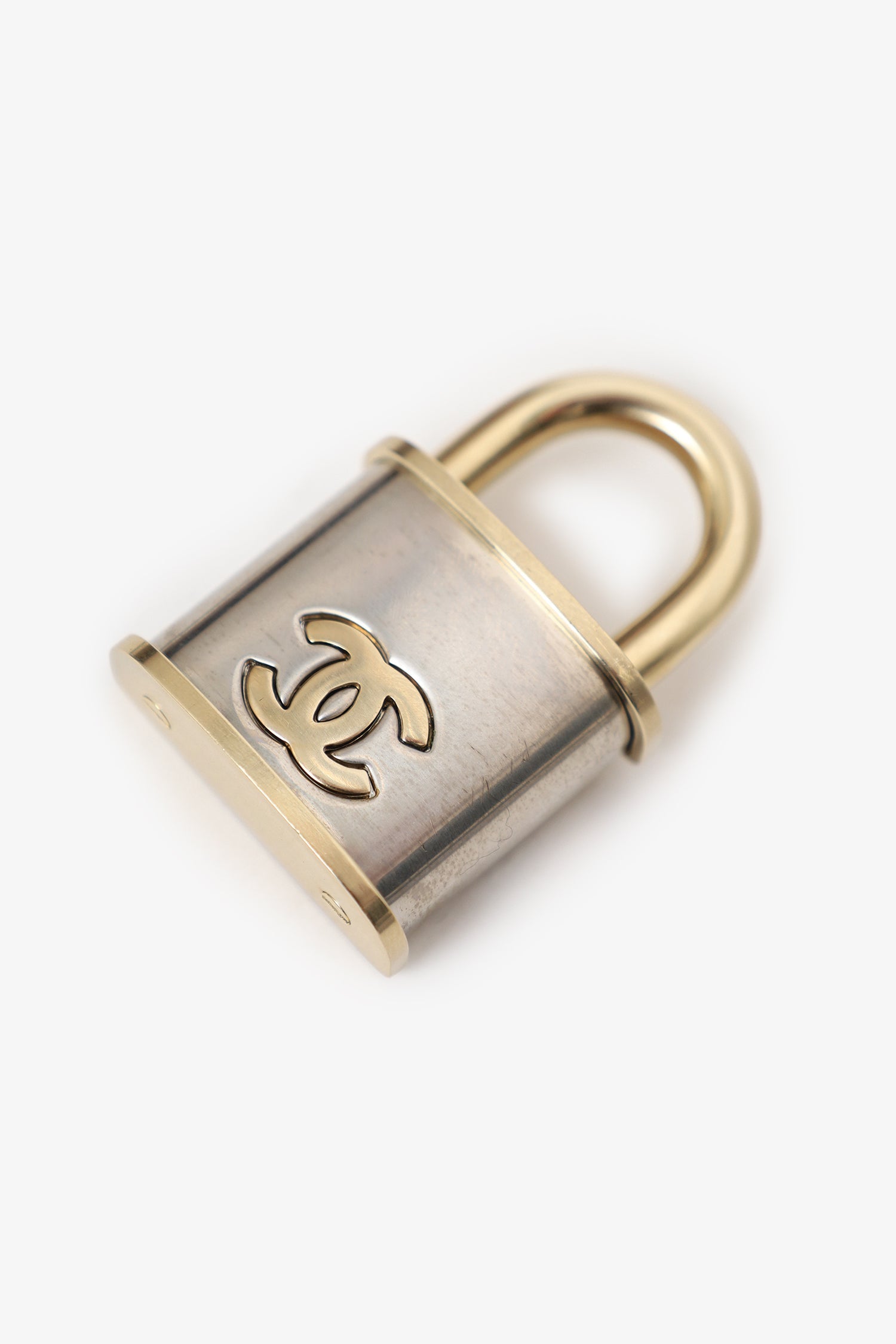 Pre-Loved Chanel™ Gold Tone CC Padlock Brooch. Rear pin with twist-lock closure. Gold and silver-tone hardware.