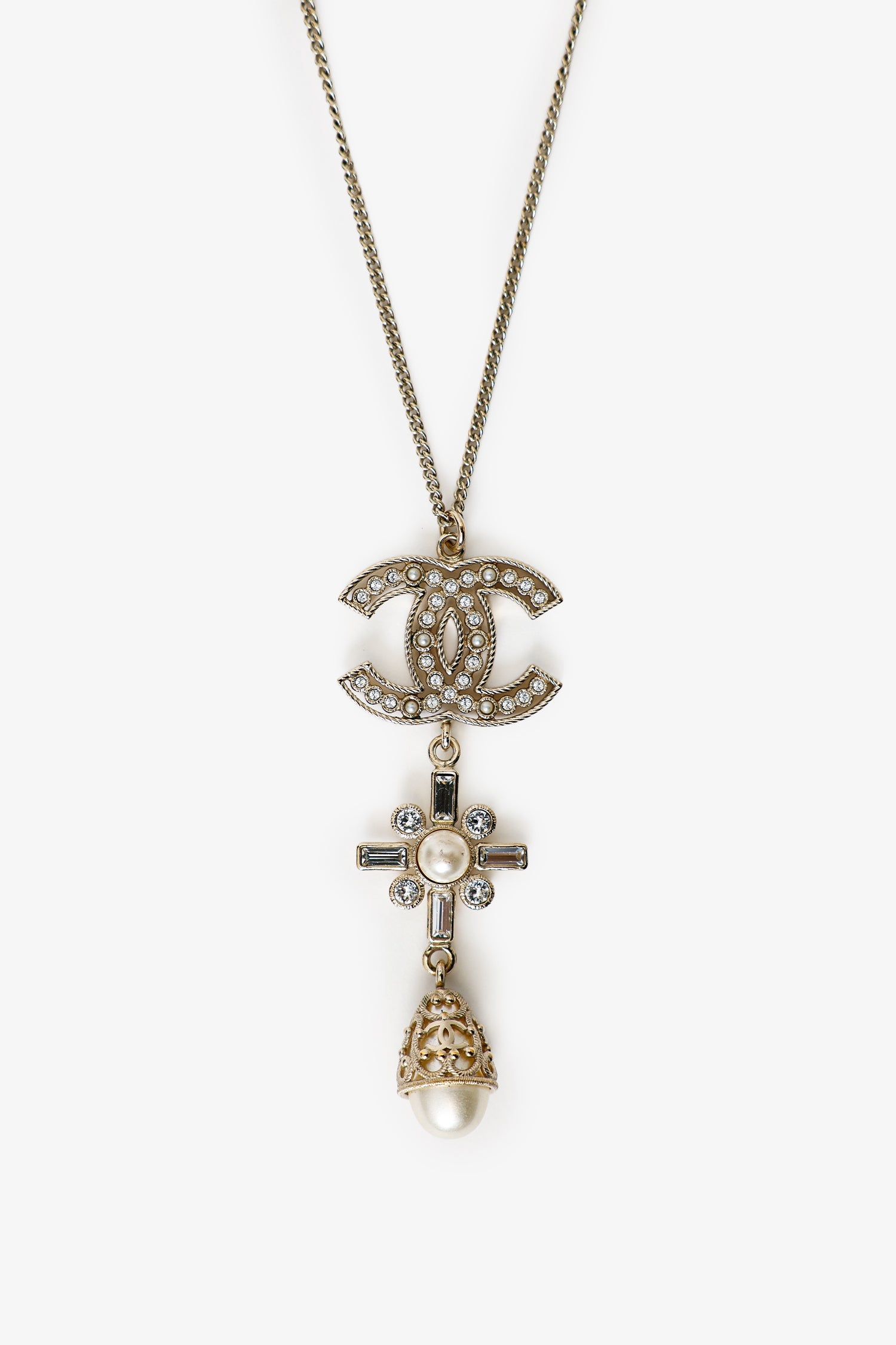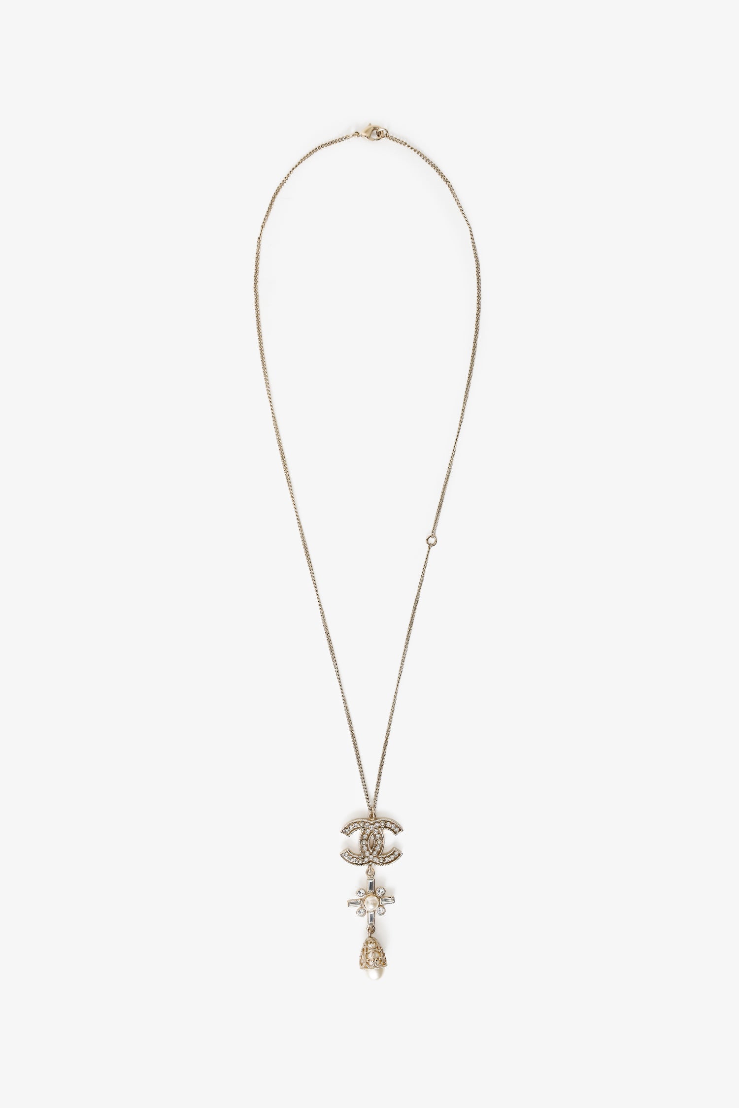 Pre-Loved Chanel™ Gold Tone Crystal Pearl CC Drop Necklace