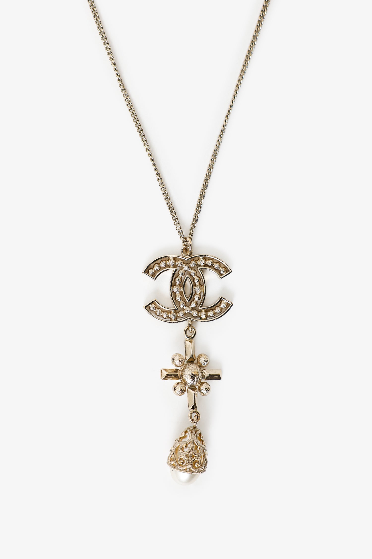 Pre-Loved Chanel™ Silver Tone Crystal Pearl CC Drop Necklace. Rear clasp closure. Gold-tone hardware.