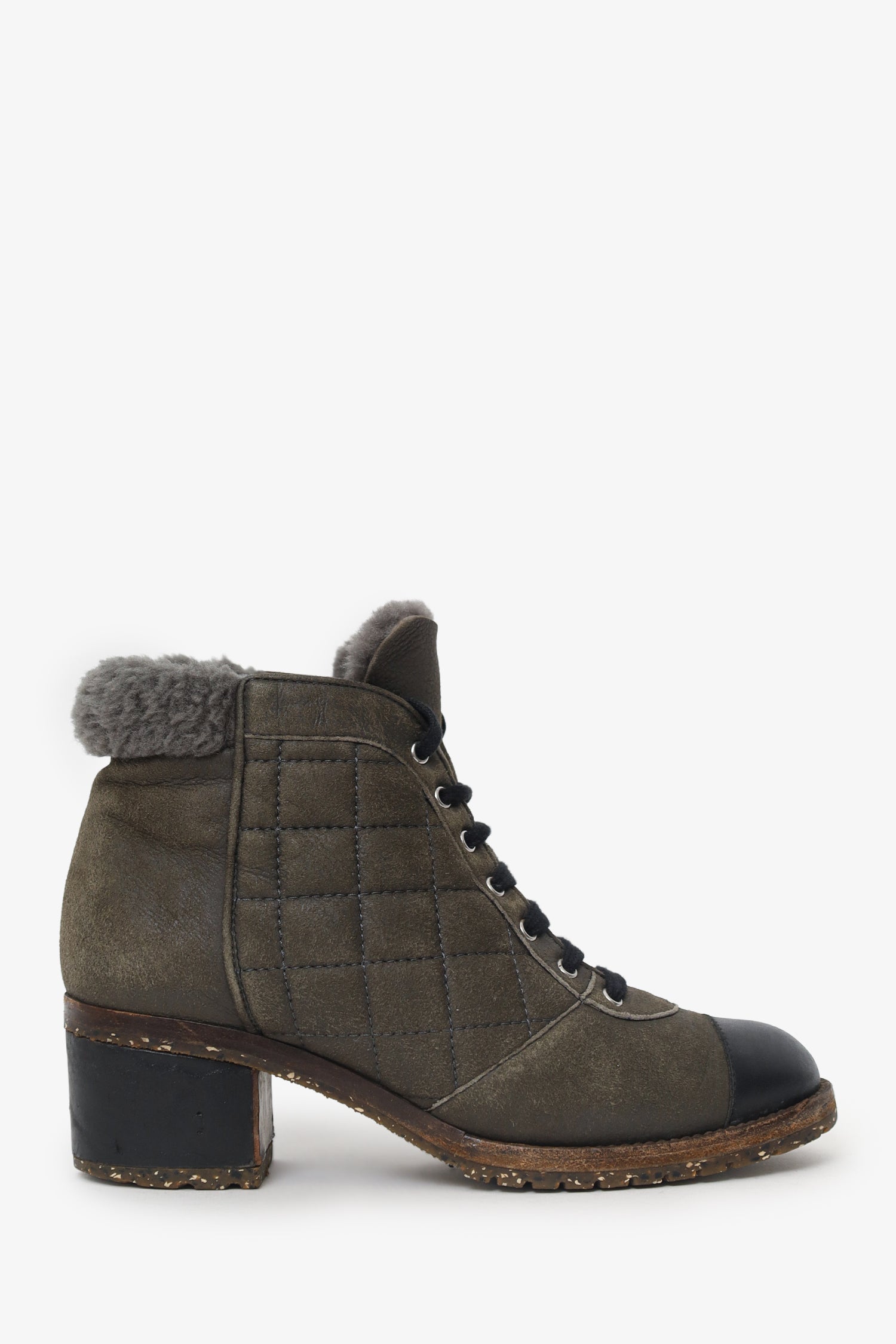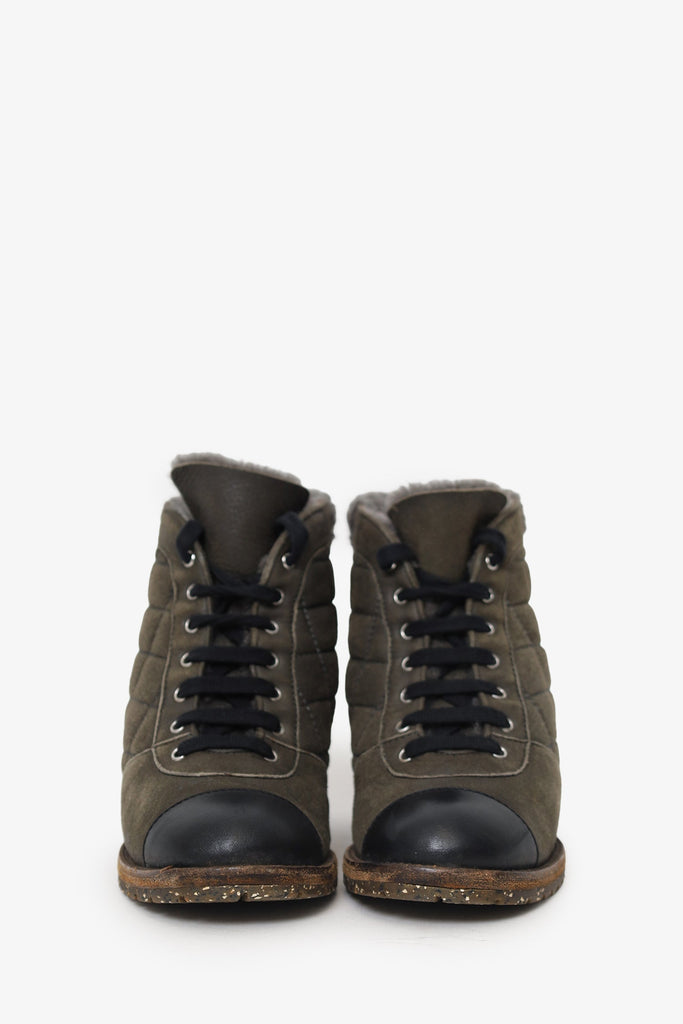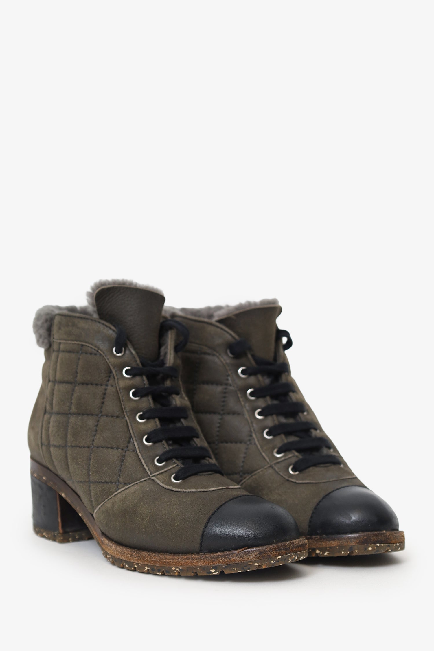 Pre-Loved Chanel Grey Suede Quilted Boots. Pull-on. Round toe. Grey shearling lined interior. Tonal stitching. Silver-tone hardware.