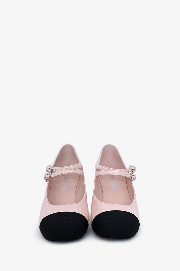 Pre-Loved Chanel™ Light Pink Black Cap Toe Mary Jane Heels. Slip-on. Round toe. Double strap with adjustable buckle closure in the front. Signature CC detailing on the toe. Silver-tone hardware. Tonal stitching.