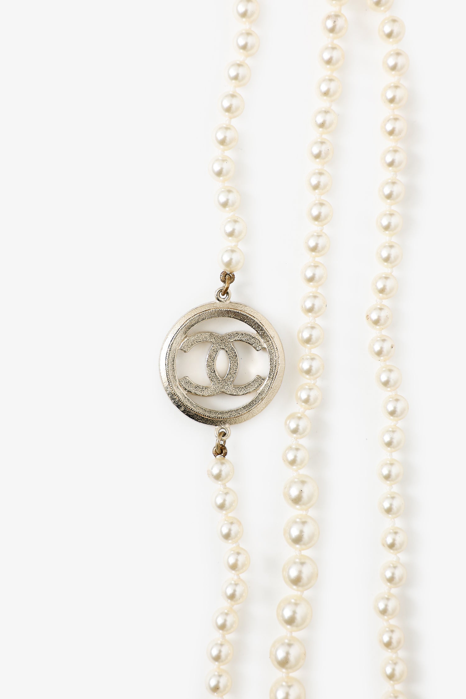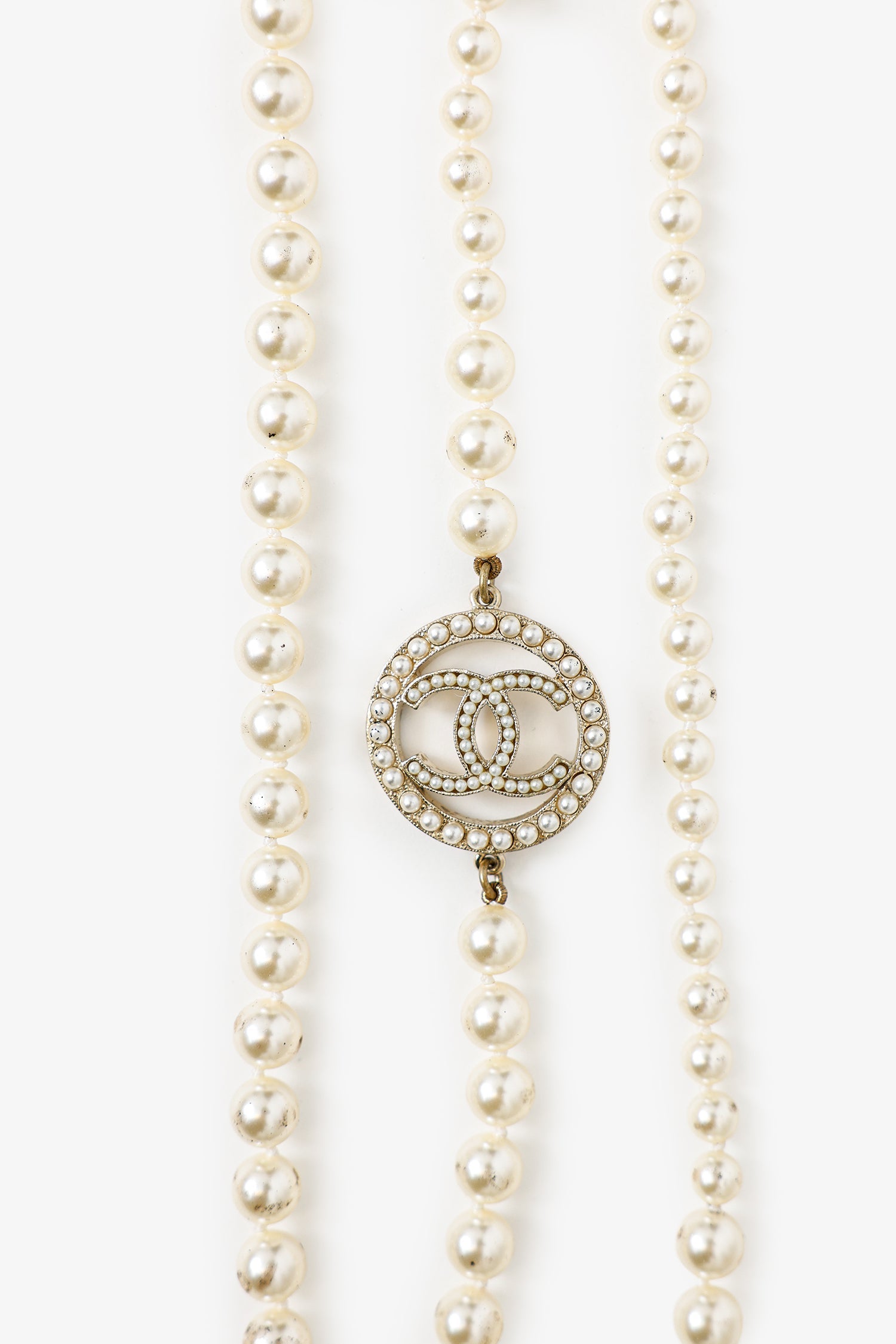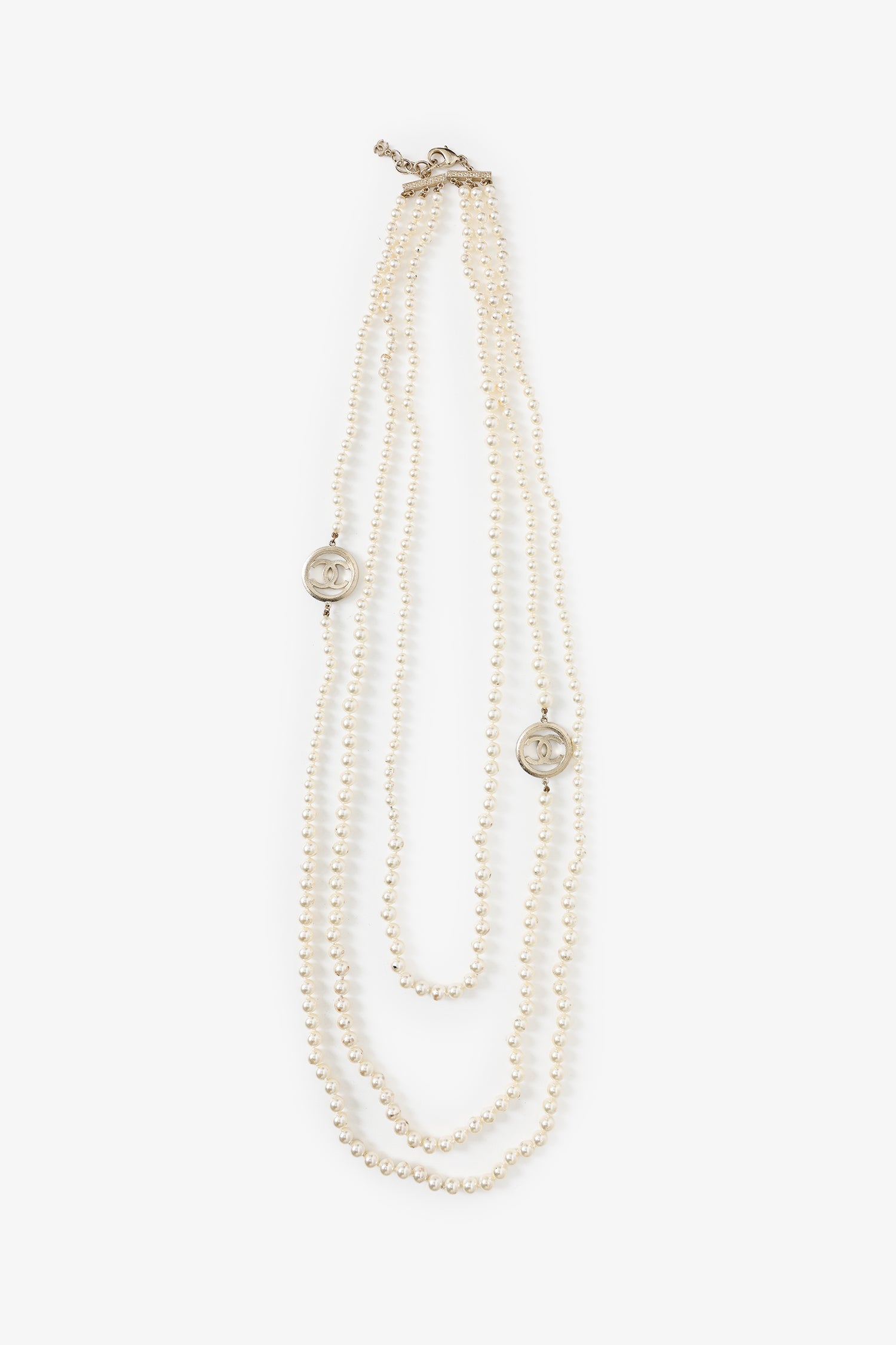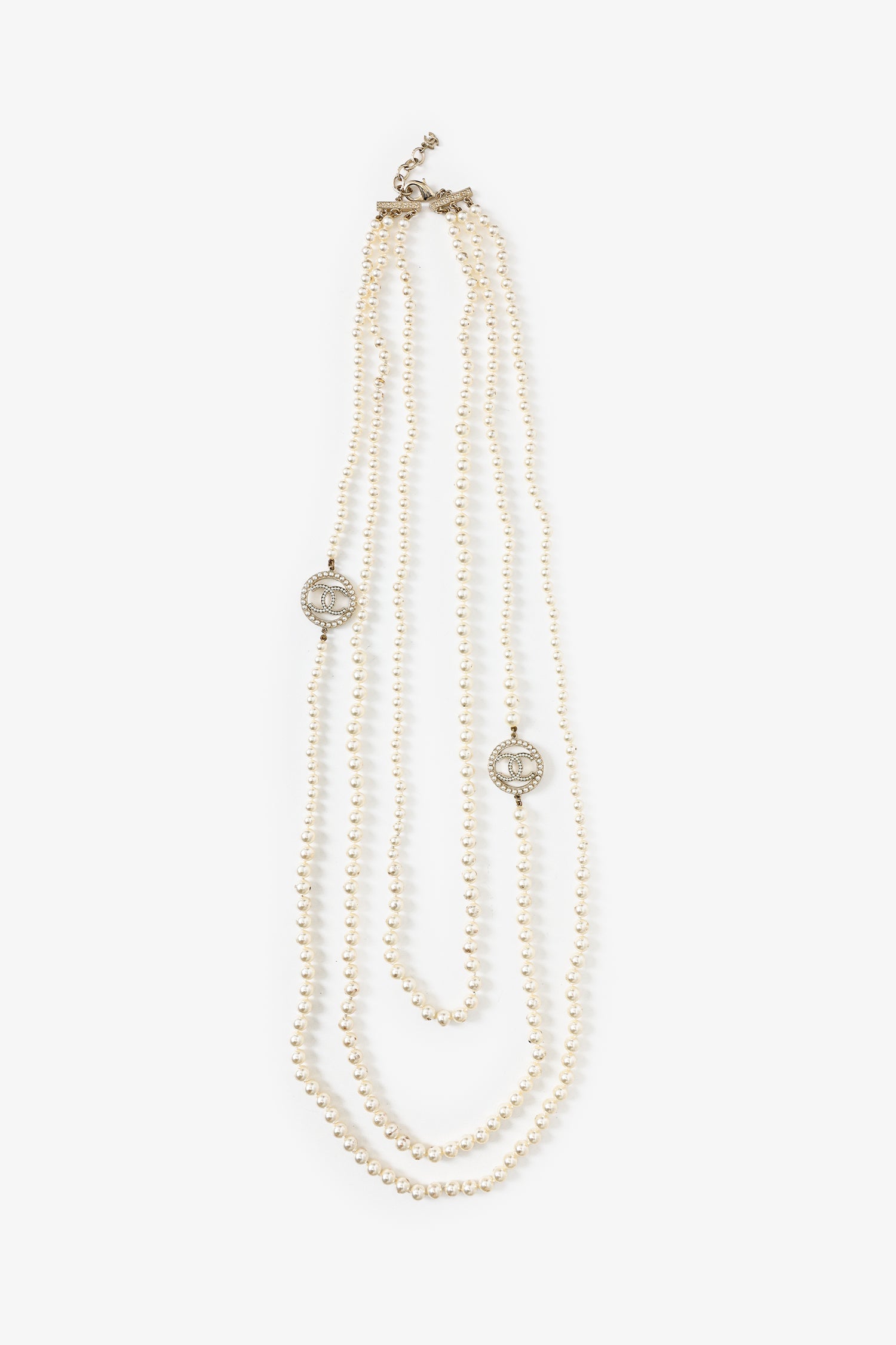 Pre-Loved Chanel™ Pearl Multi Strand CC Necklace. Rear lobster clasp closure. Gold-tone hardware.