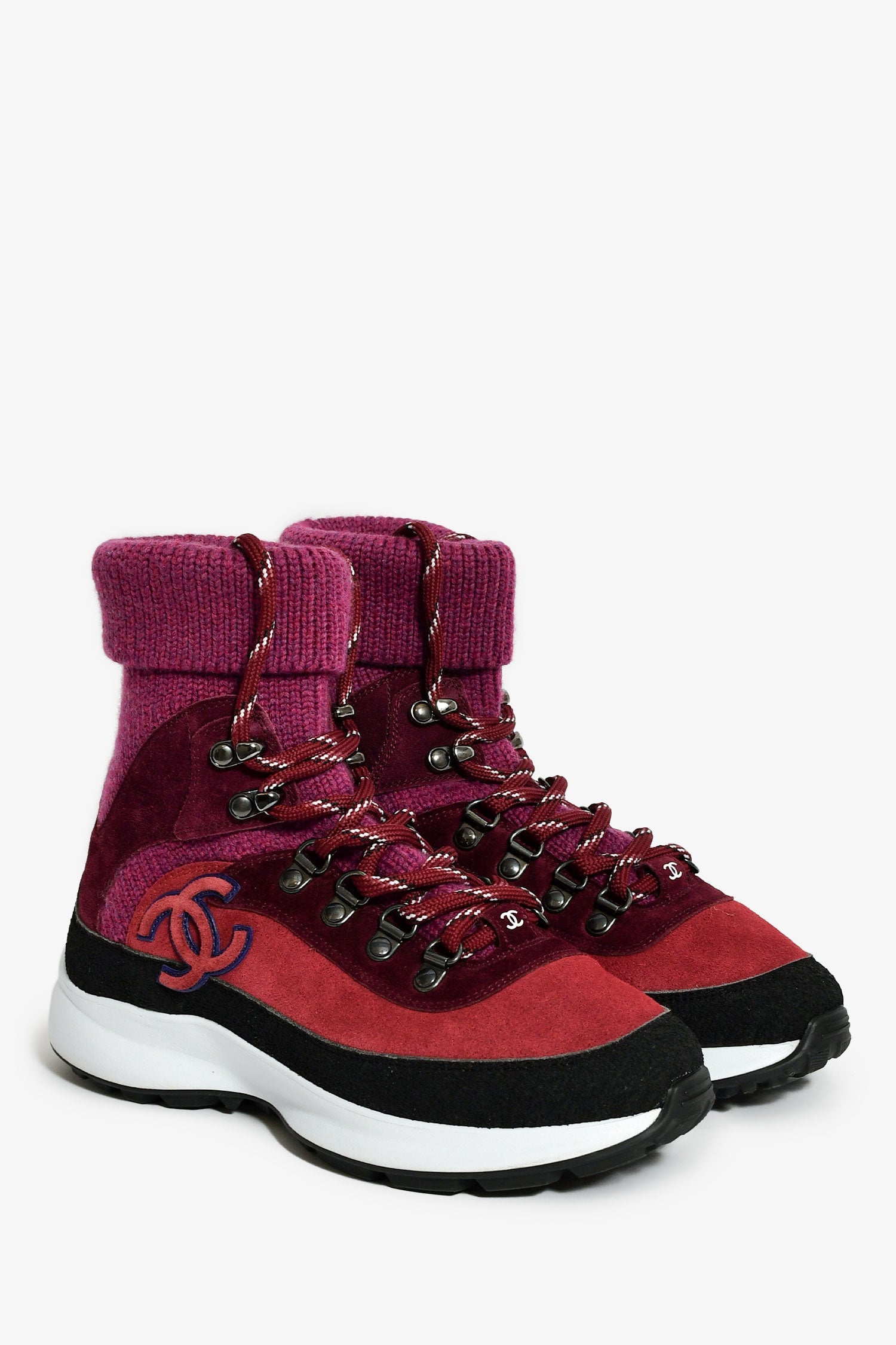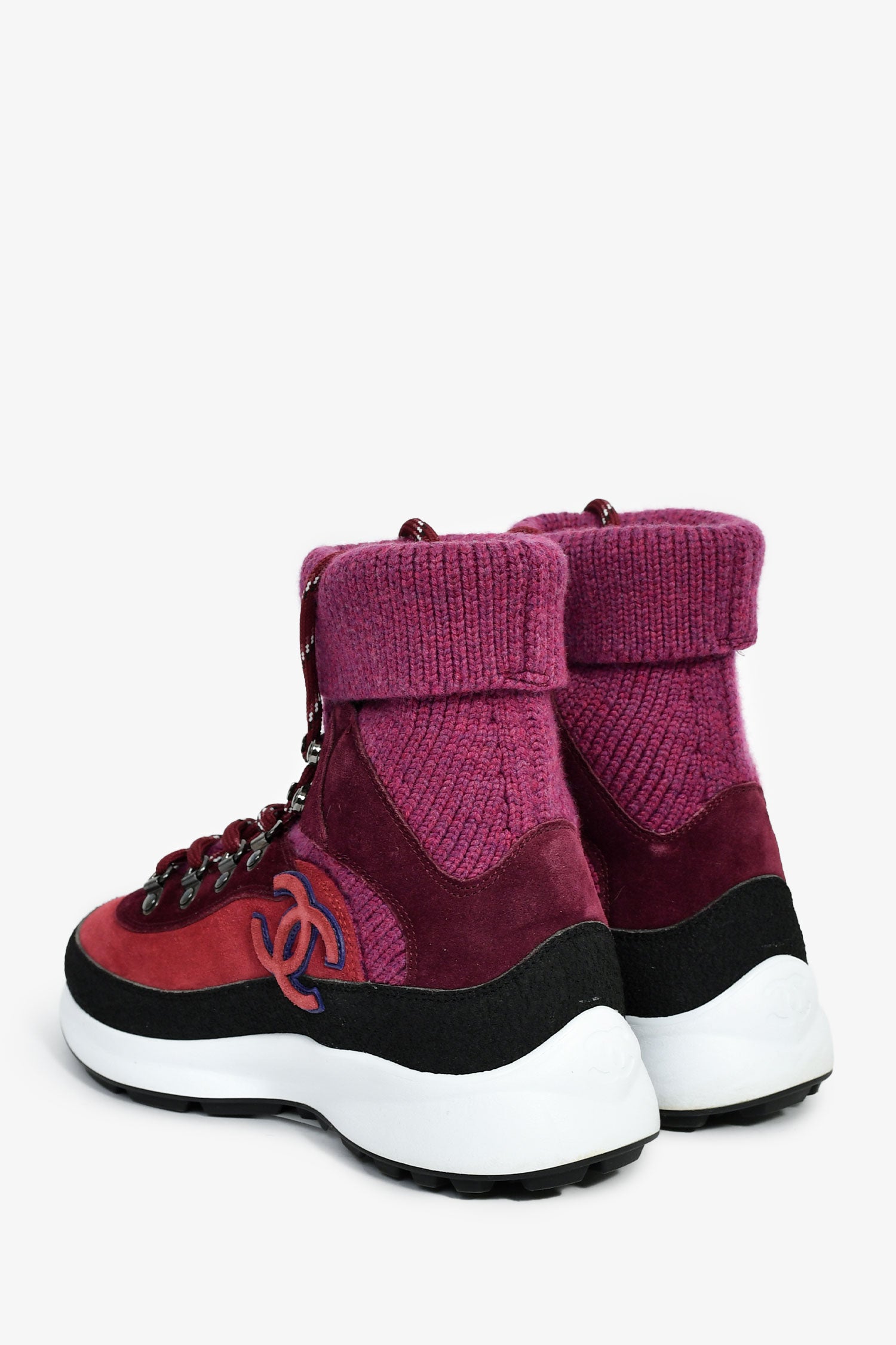 Pre-Loved Chanel™ Purple Suede/Knit Sock Sneakers. Pull-on. Round toe. Lace-up closure. Rubber soles. Tonal stitching.