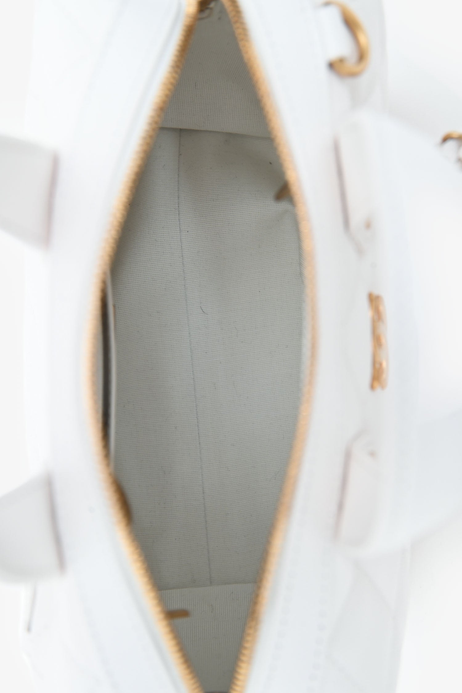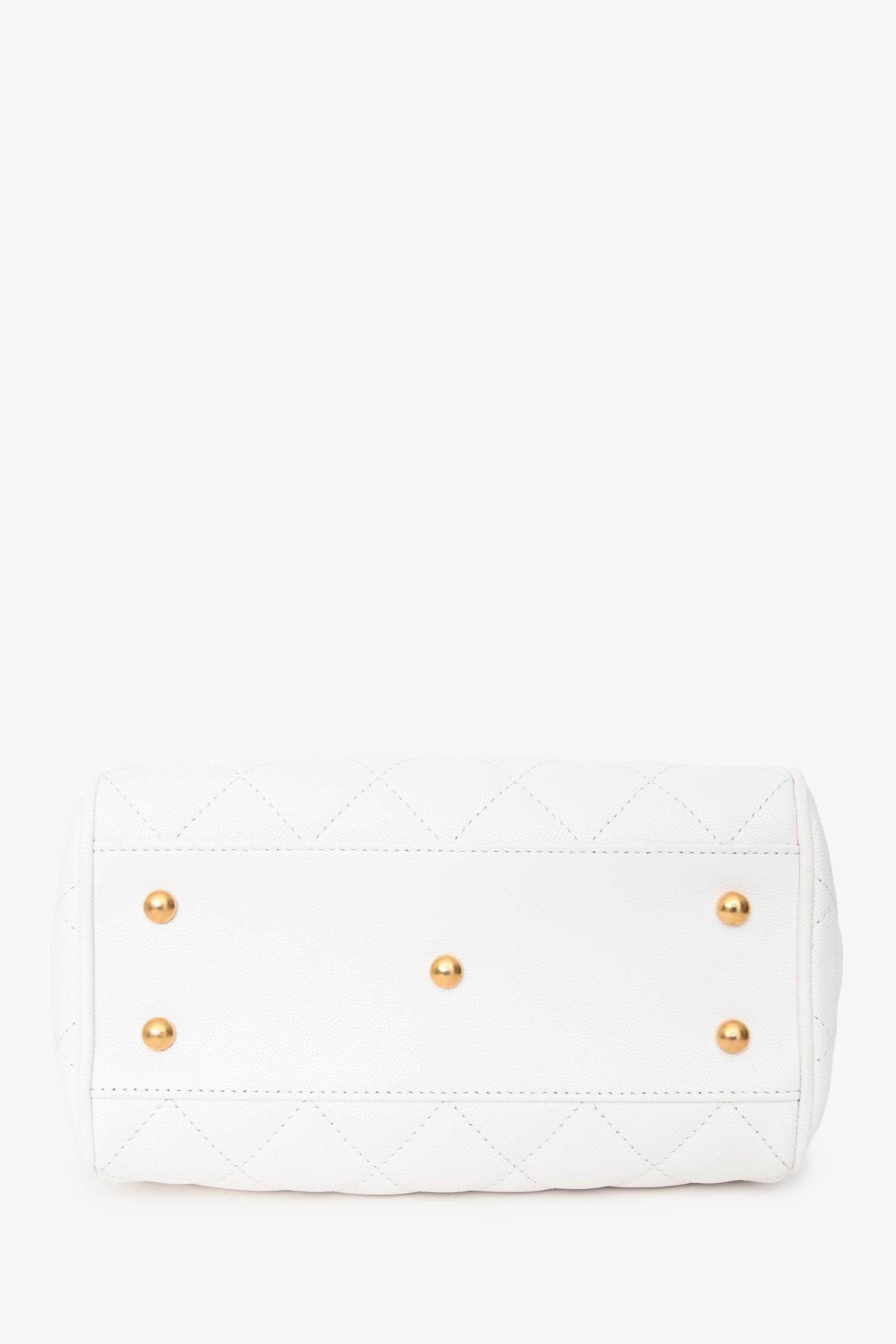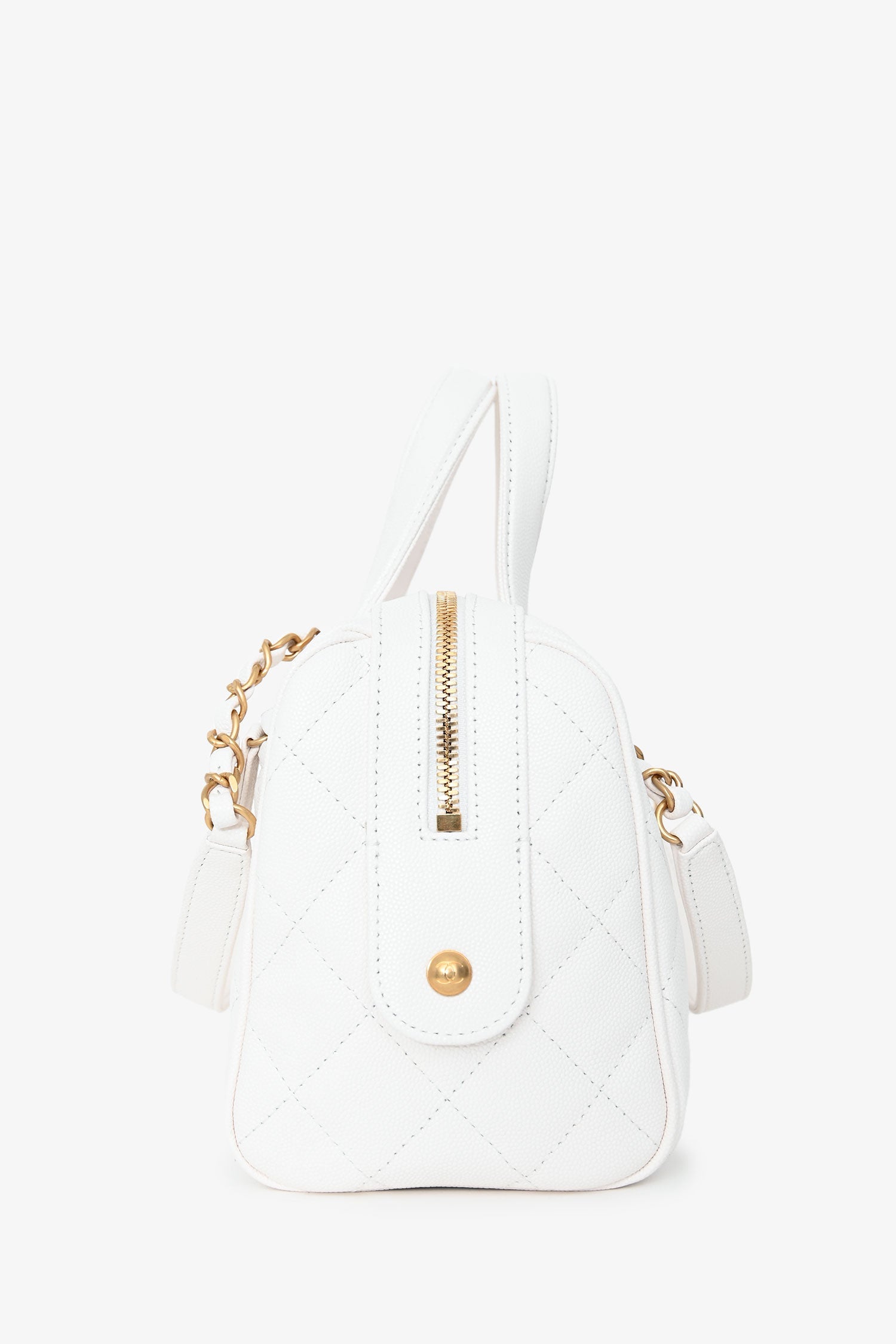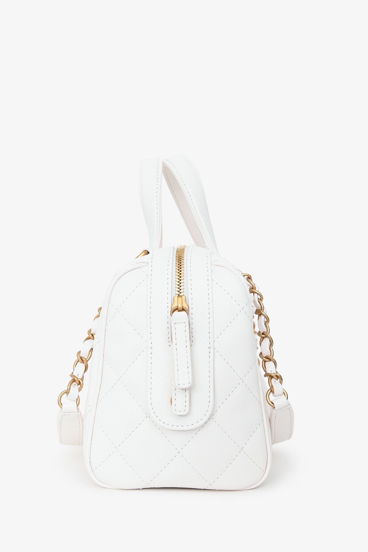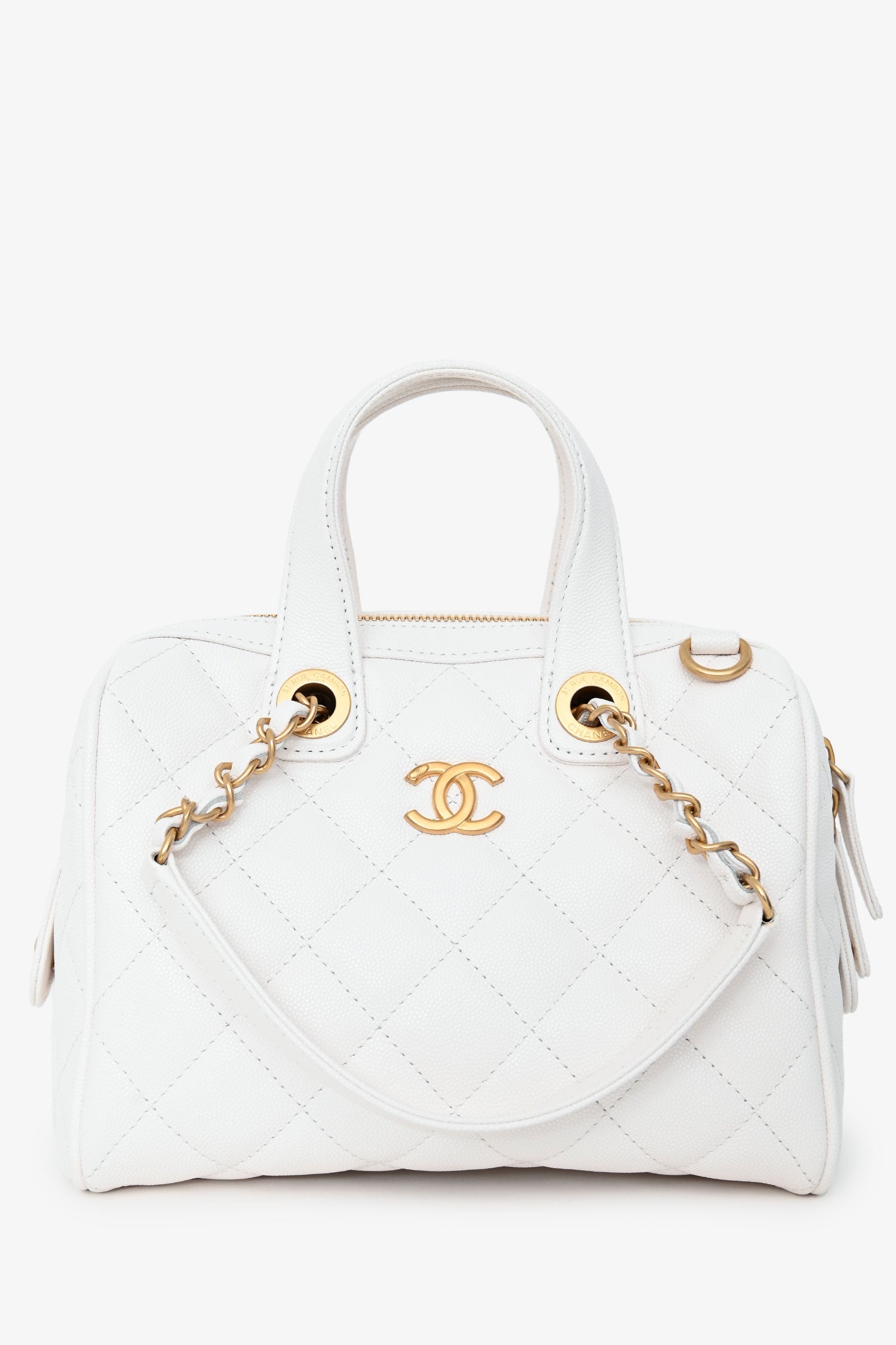 Pre-Loved Chanel™ White Caviar Leather Bowling Bag with Gold Hardware. Zip-around top closure. Dual rolled top handles and shoulder straps. 1 exterior zip pocket; 2 interior zip pockets; 1 interior slip pocket. 5 protective base studs. Gold-tone hardware. Tonal stitching.