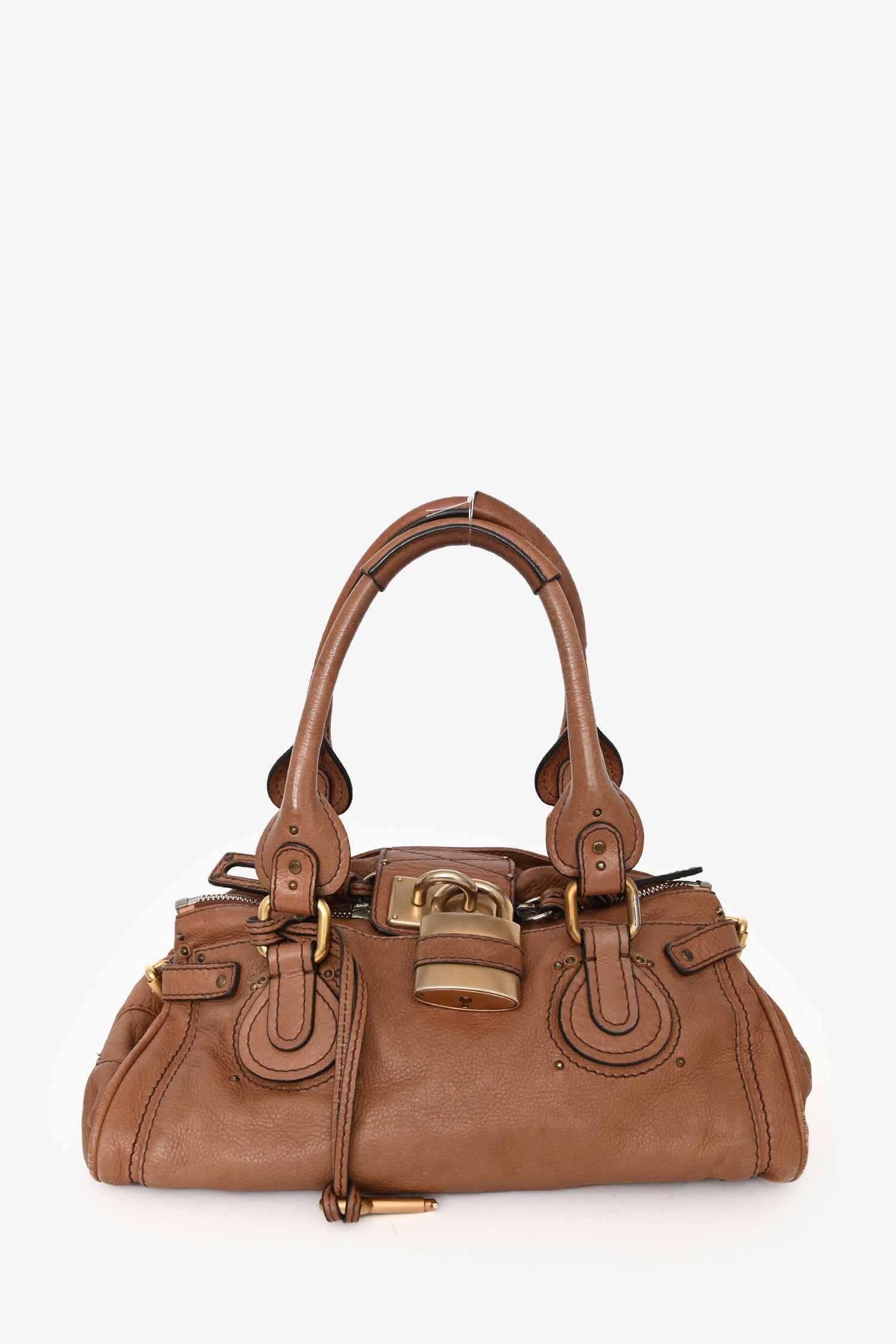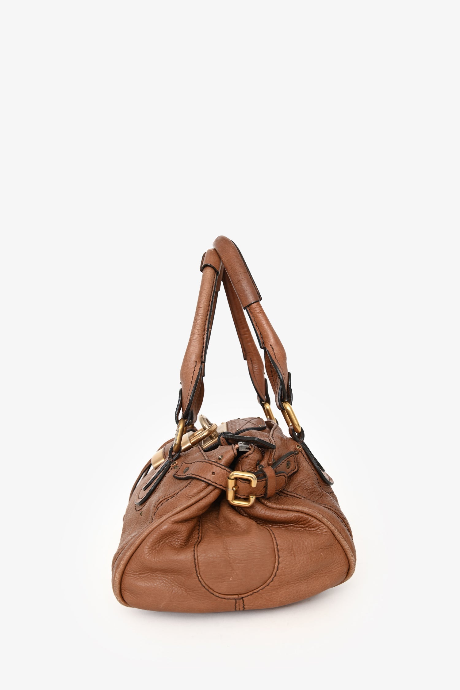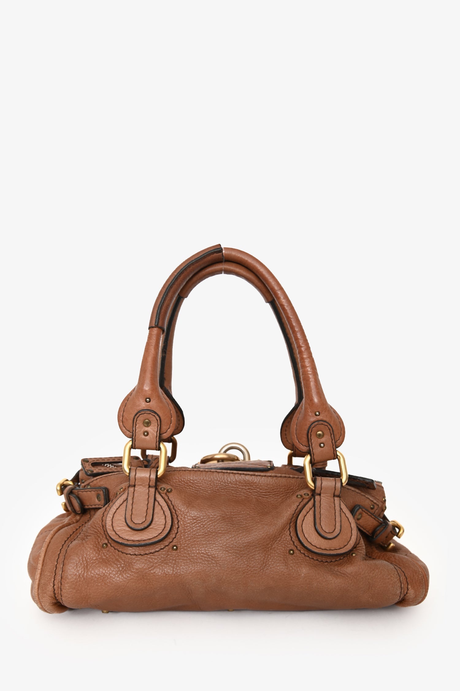 Chloe 2007 Vintage Brown Leather Paddington Bag. Top zip closure. Dual handles. Protective base studs. Textile-lined interior. 2 interior wall pockets; 1 slip, 1 with zip closure. Gold and silver-tone hardware. Tonal stitching.