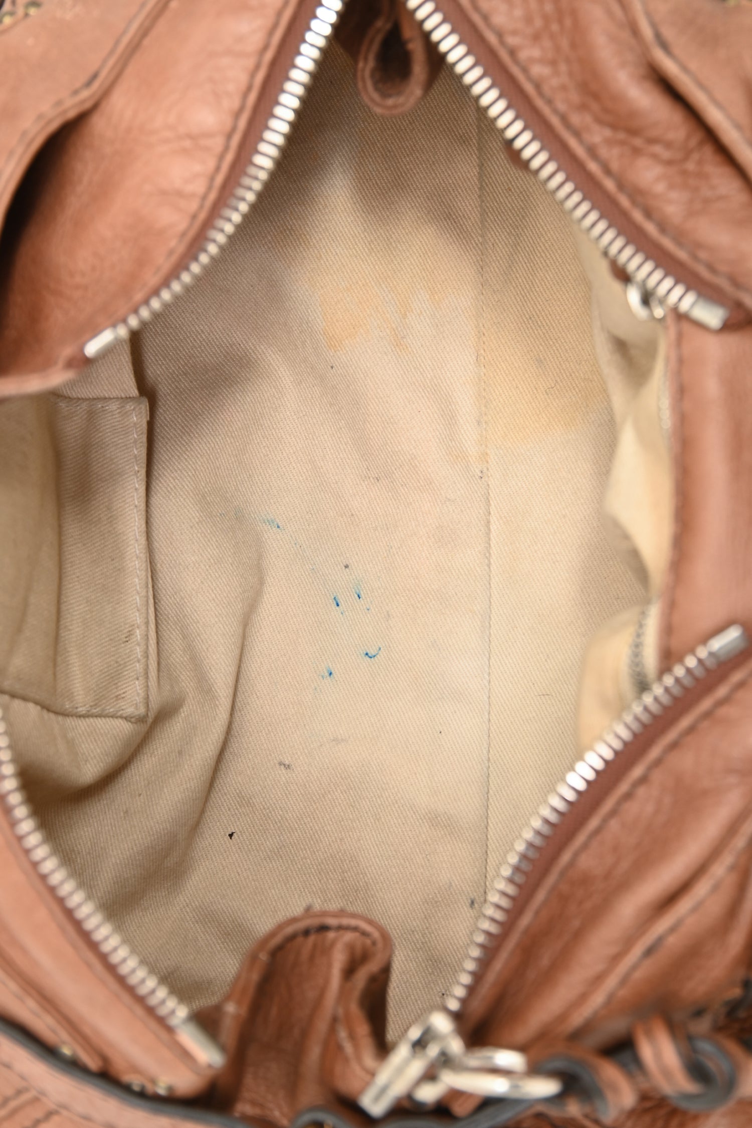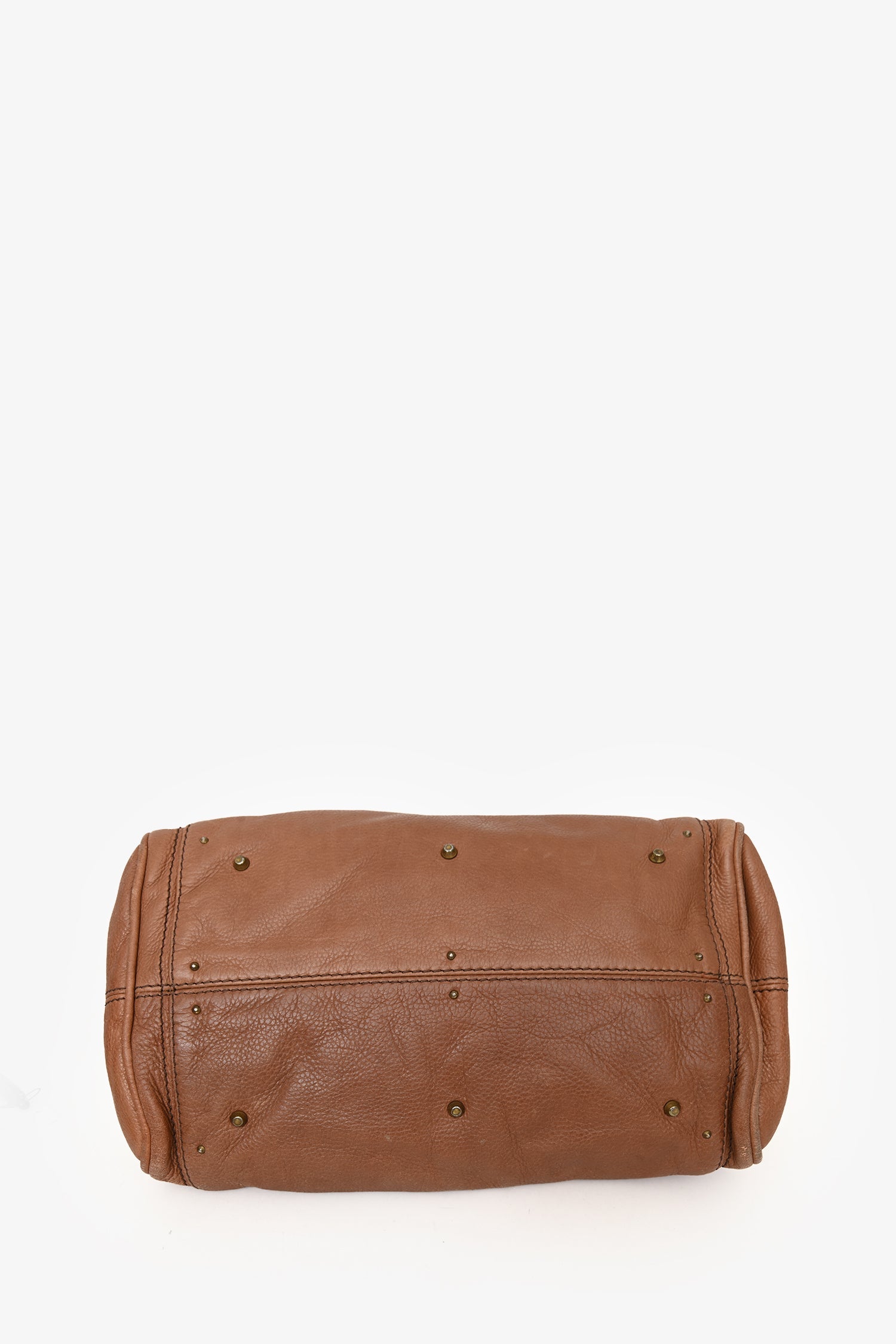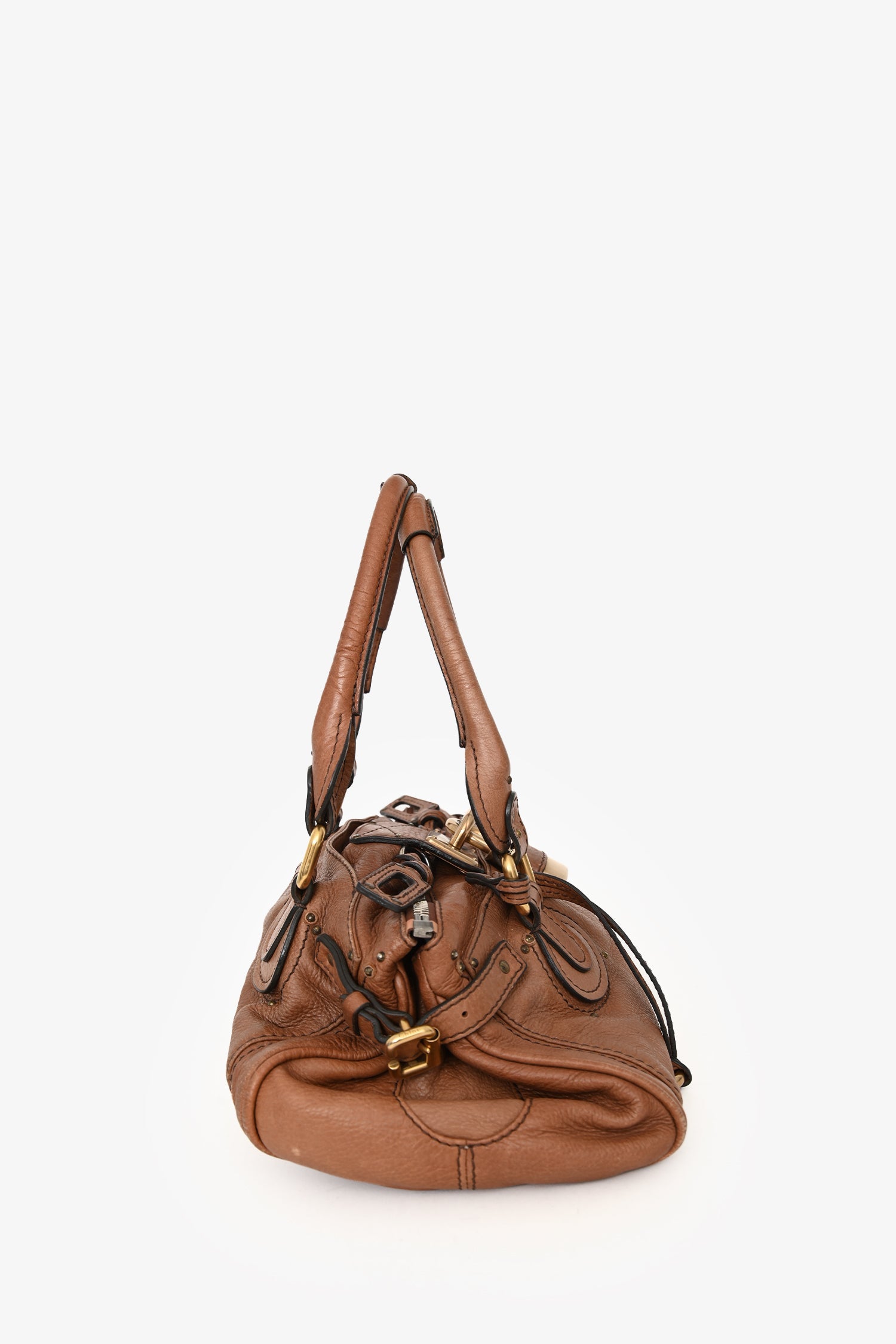 Chloe 2007 Vintage Brown Leather Paddington Bag. Top zip closure. Dual handles. Protective base studs. Textile-lined interior. 2 interior wall pockets; 1 slip, 1 with zip closure. Gold and silver-tone hardware. Tonal stitching.