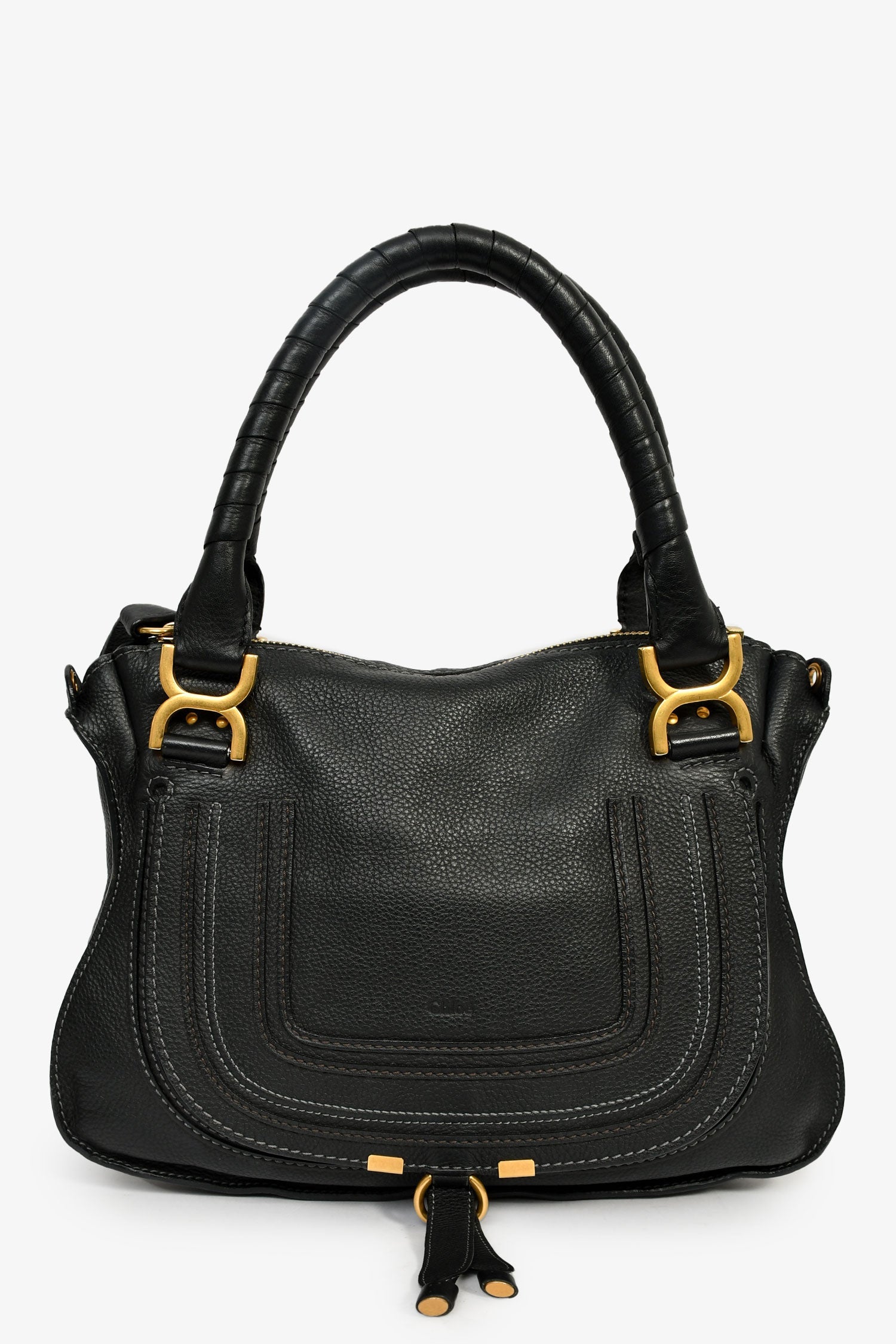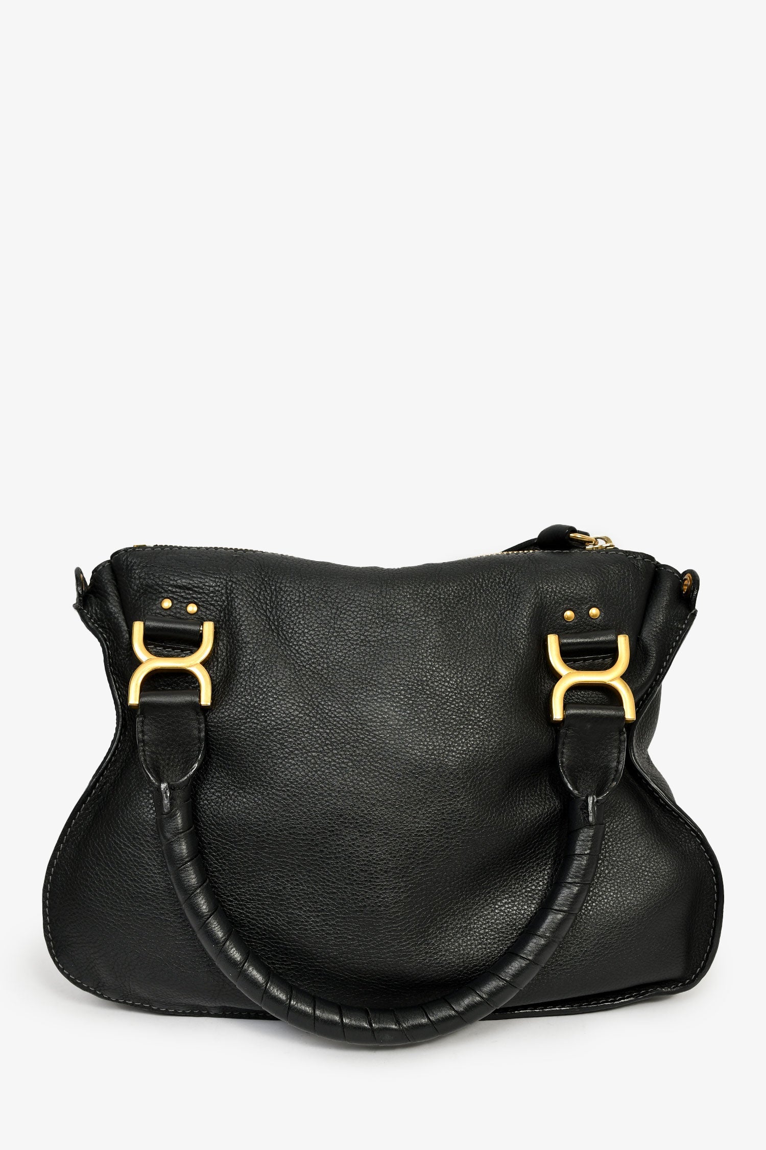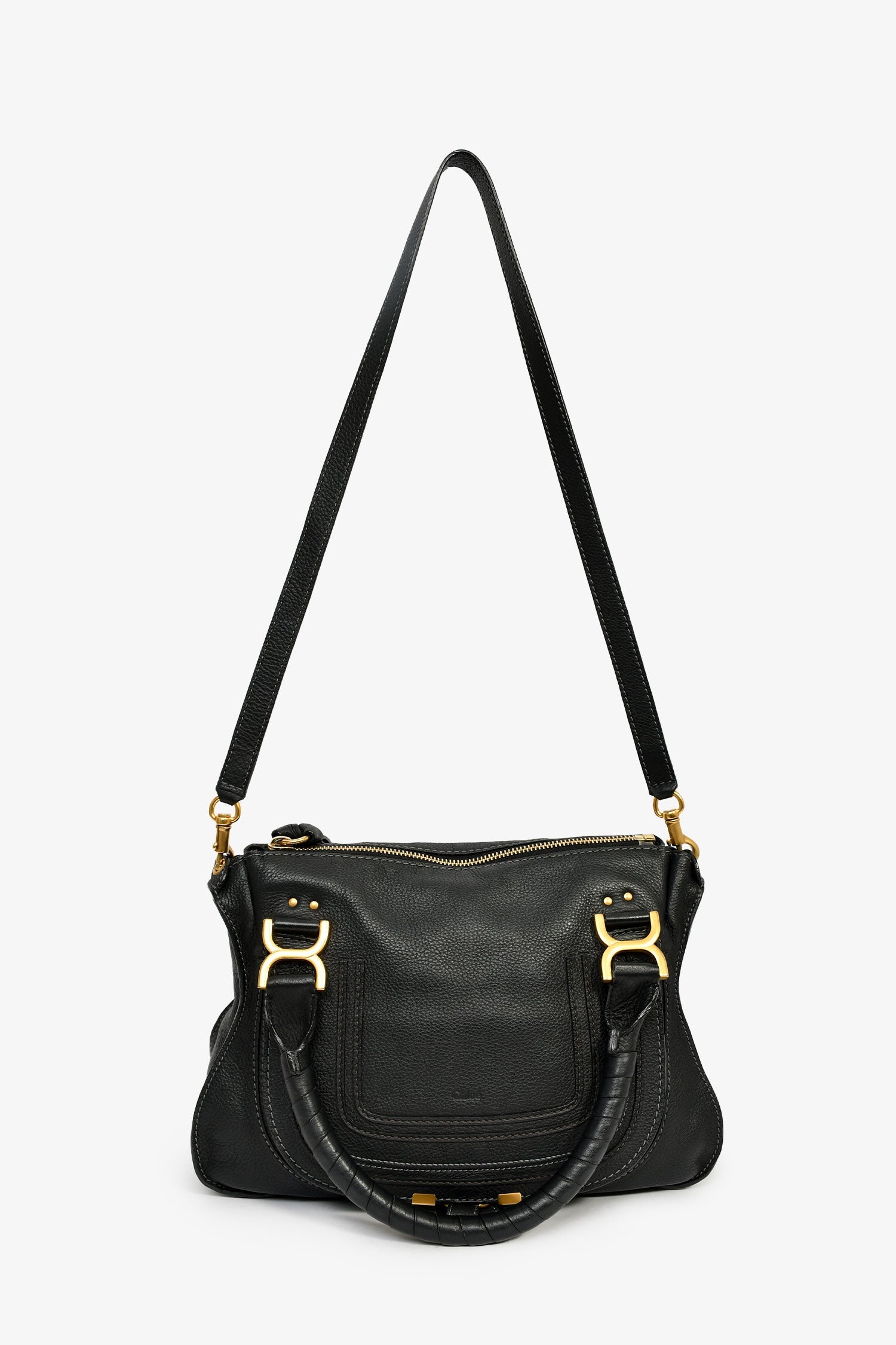 Chloe 2017 Black Leather Marcie Shoulder Bag With Strap. Top zip closure. Dual handles. Detachable strap. Textile-lined interior. 2 interior wall pockets; 1 slip, 1 with zip closure. Gold-tone hardware. Tonal stitching.