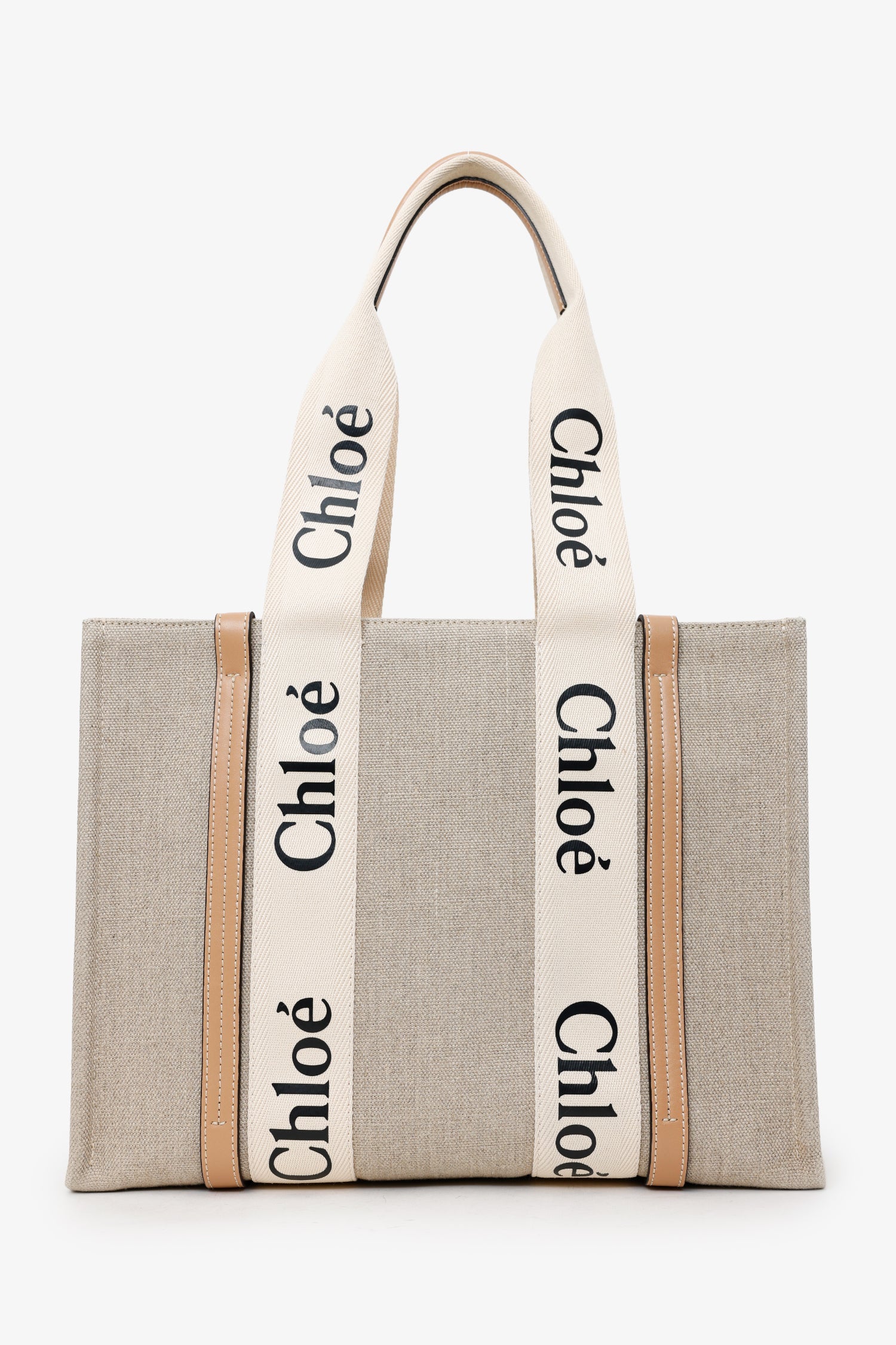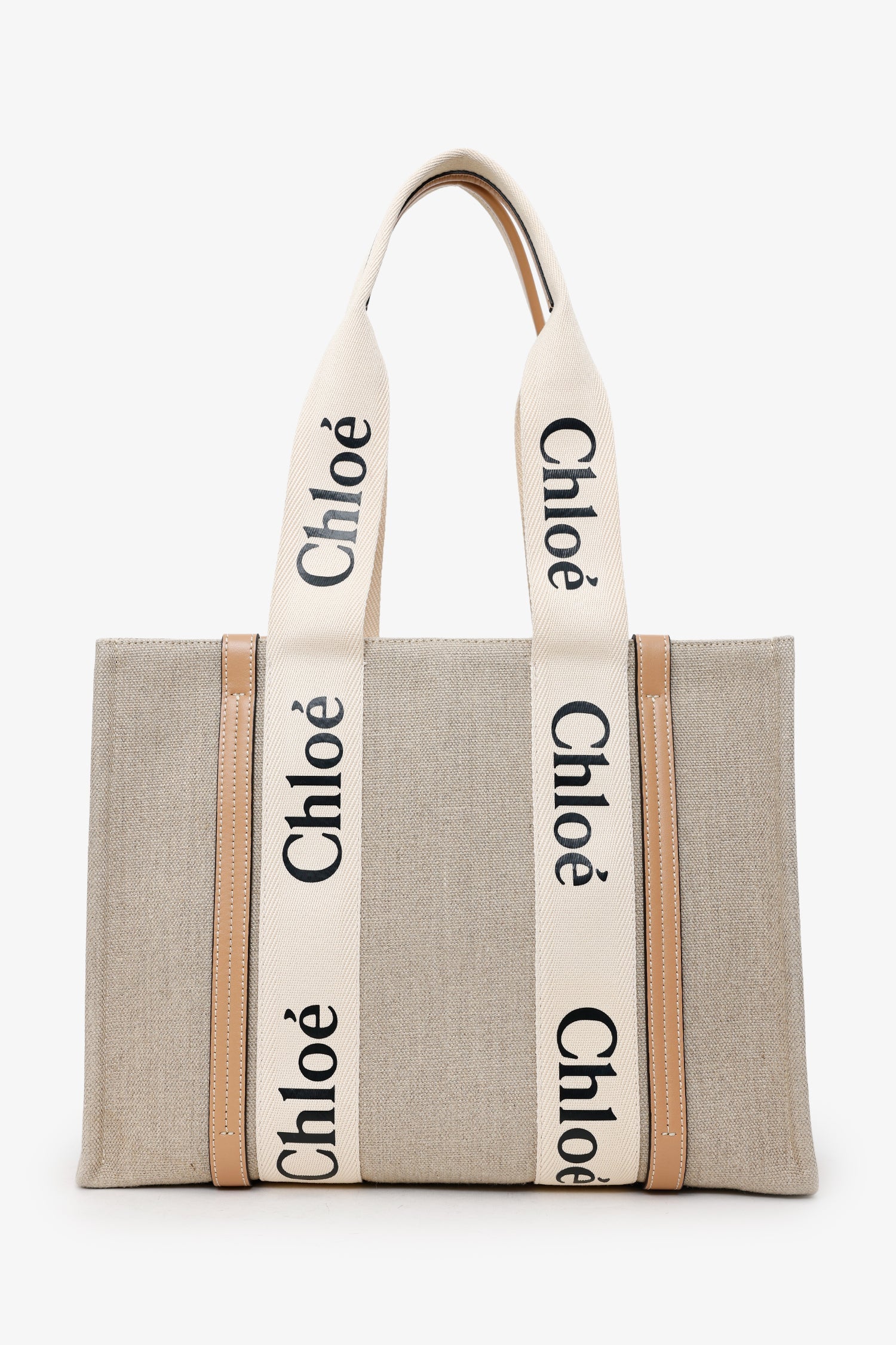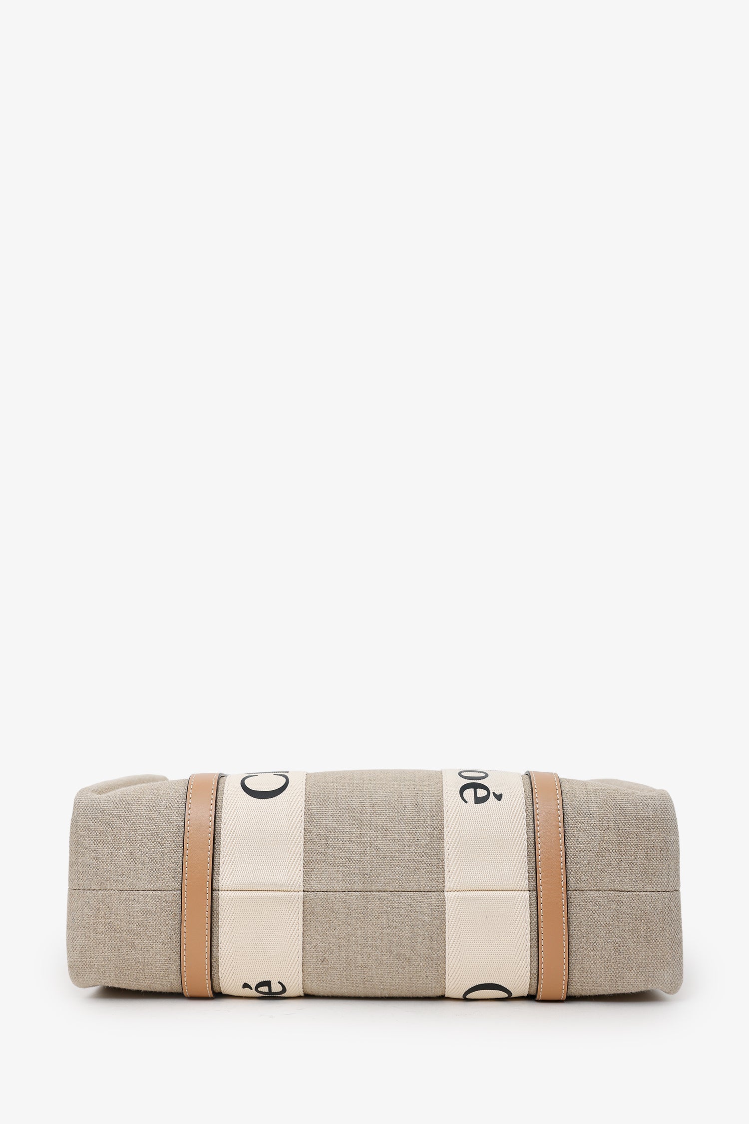 Chloe Beige Fabric Leather Trim Logo Woody Large Tote. Top open. Twin shoulder straps. Open interior with single rear slip. Contrast and tonal stitching.