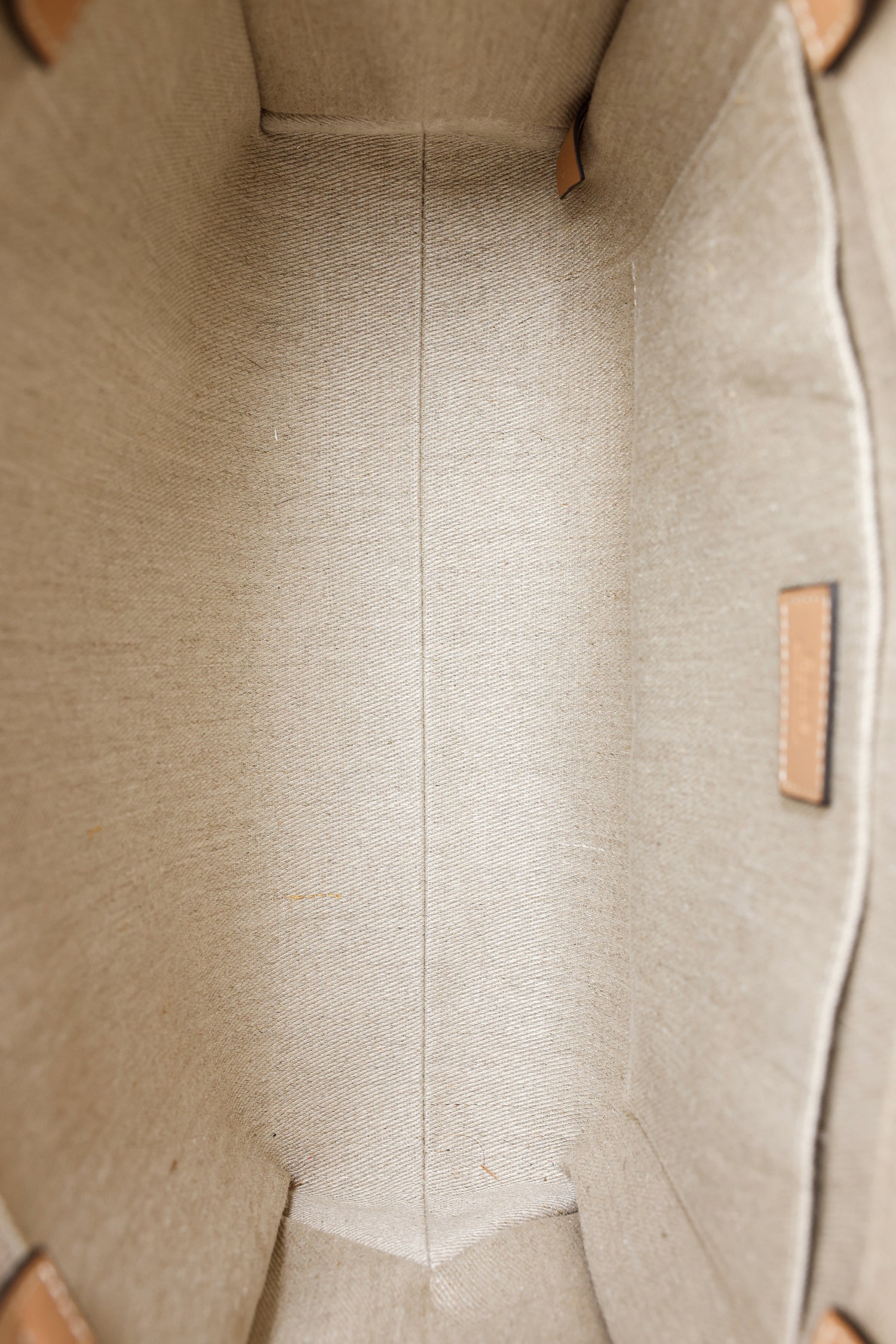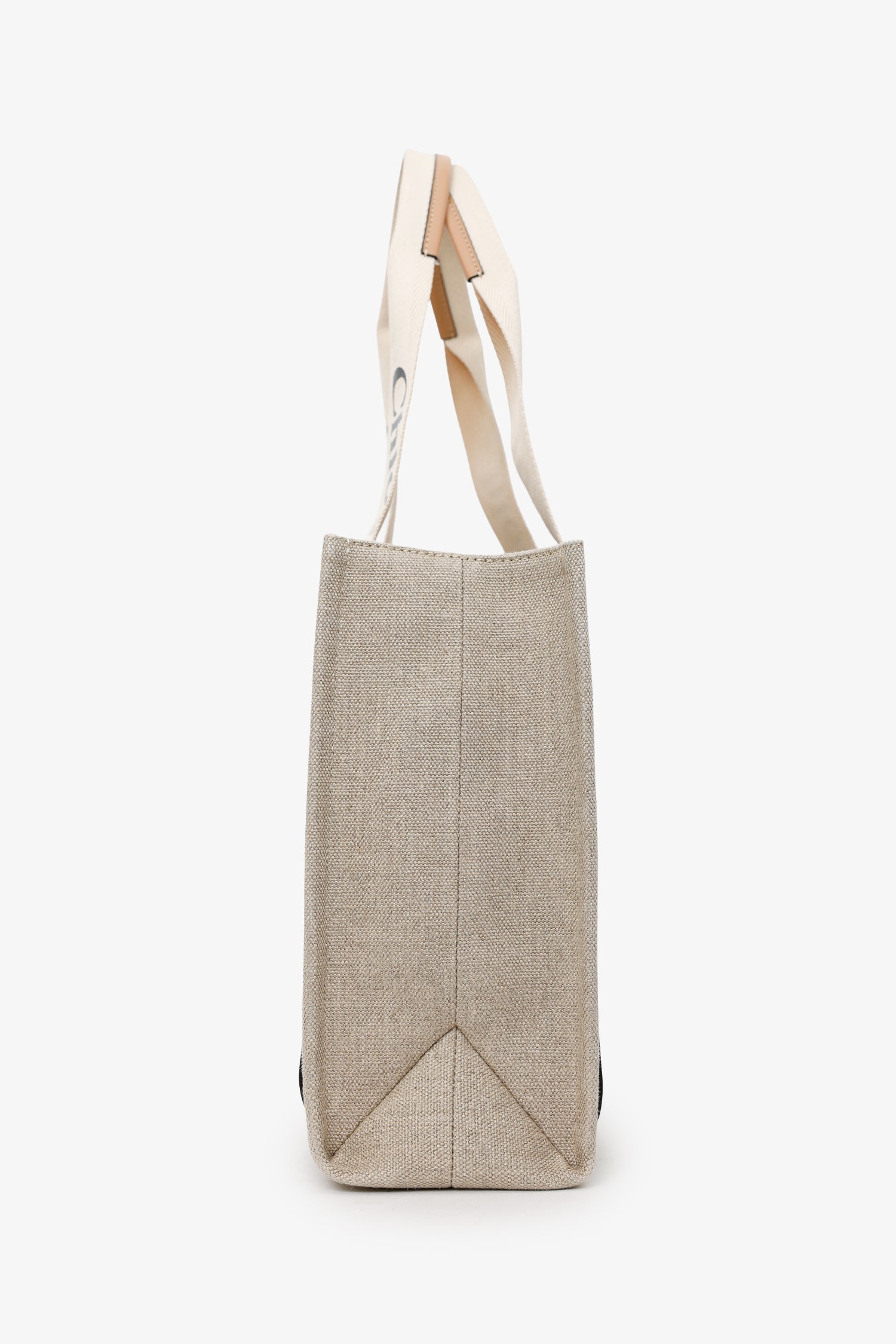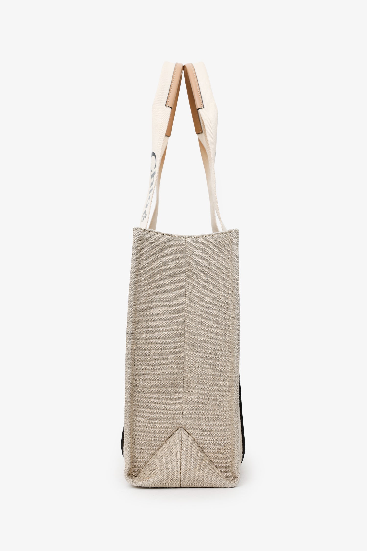 Chloe Beige Fabric Leather Trim Logo Woody Large Tote. Top open. Twin shoulder straps. Open interior with single rear slip. Contrast and tonal stitching.