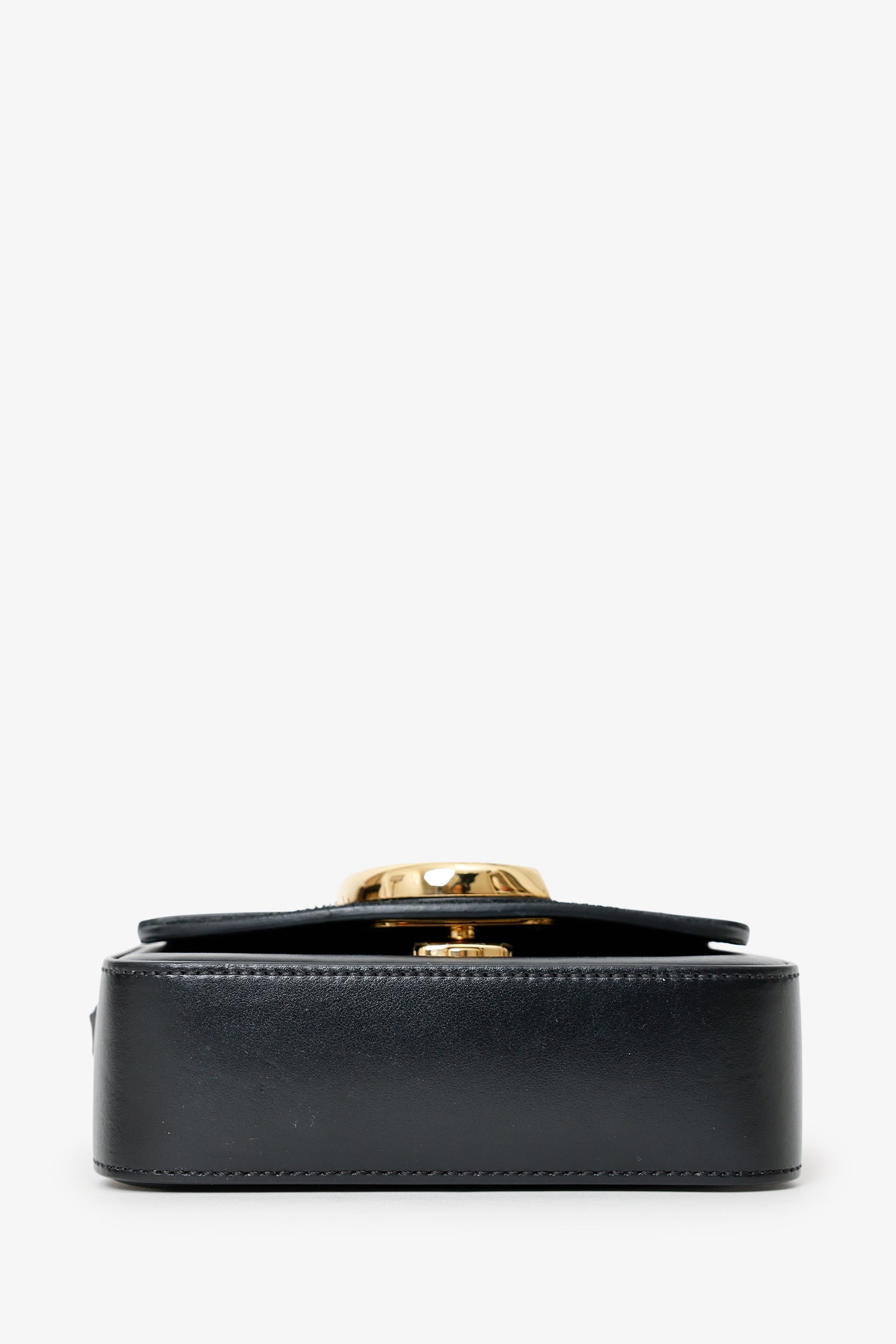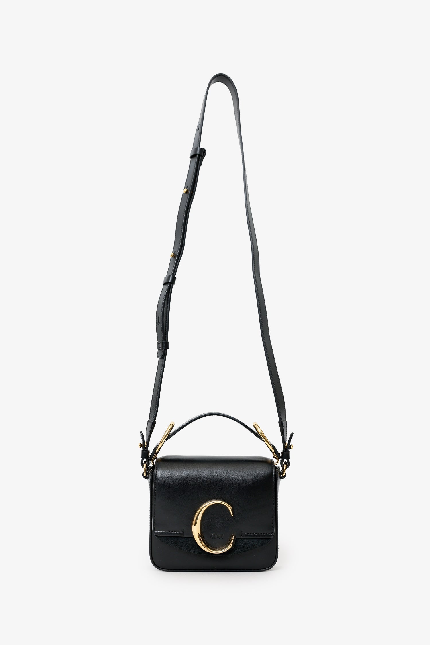 Chloe Black Leather Mini C Bag. Front fold-over flap with push-lock closure. Top handle. Shoulder strap with adjustable pull-through push-pin closure. Lined interior with single rear slip pocket. Gold-tone hardware. Tonal stitching.
