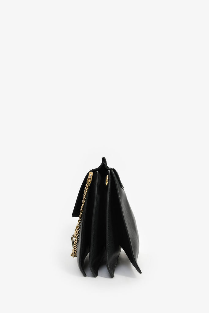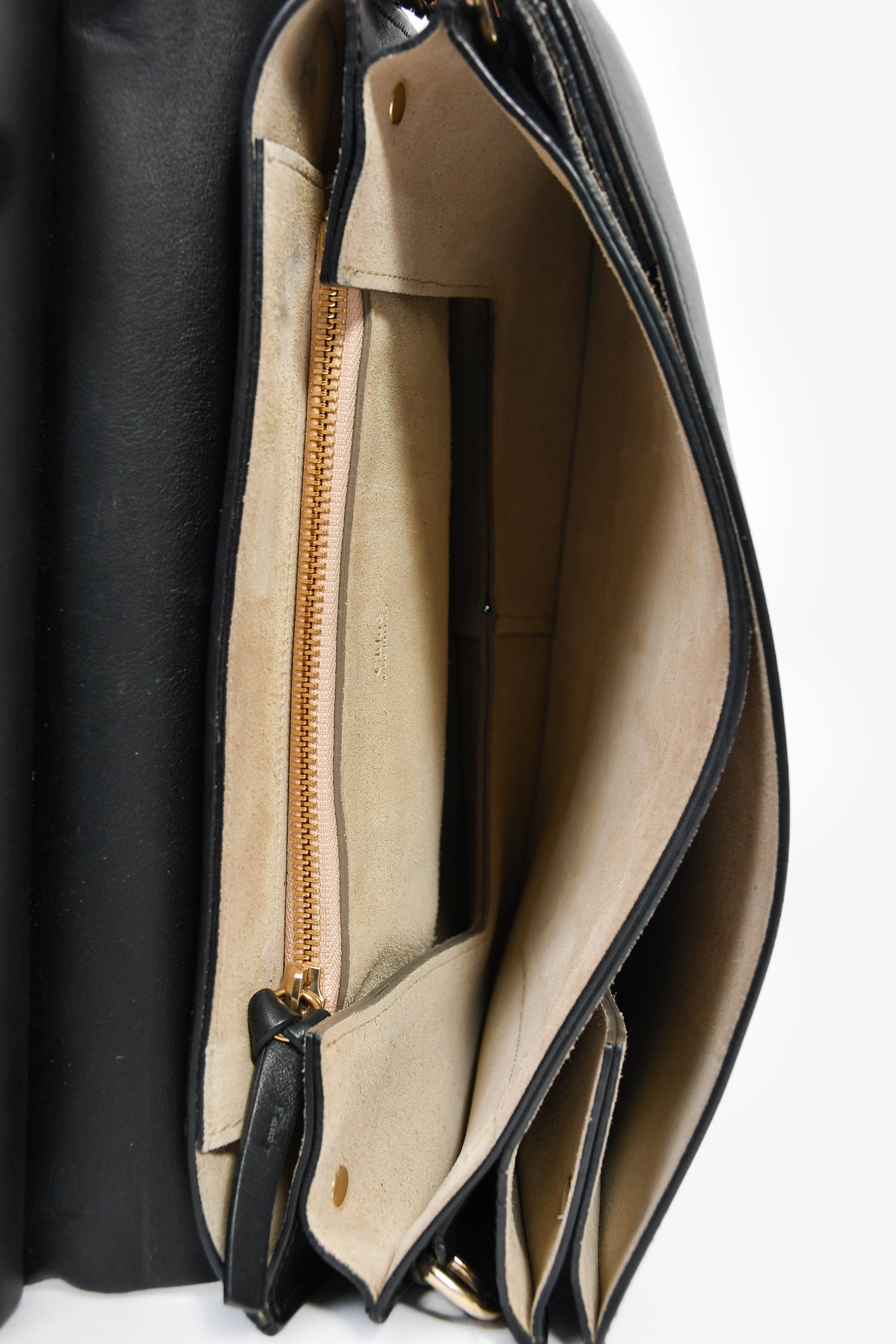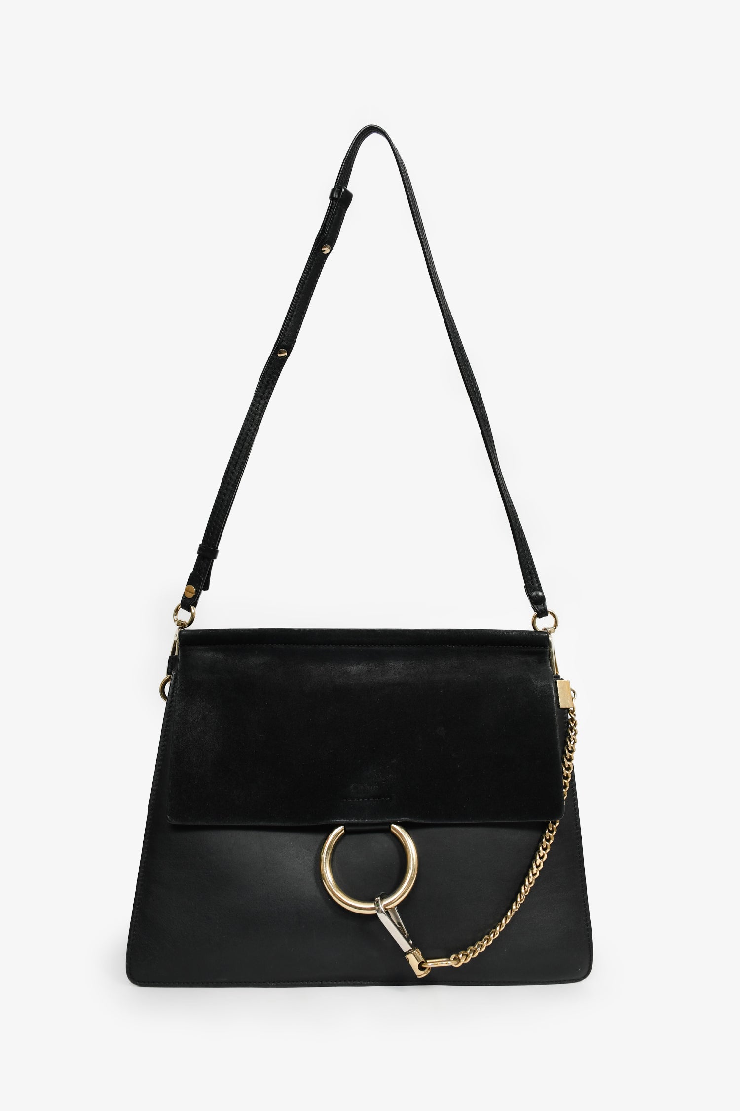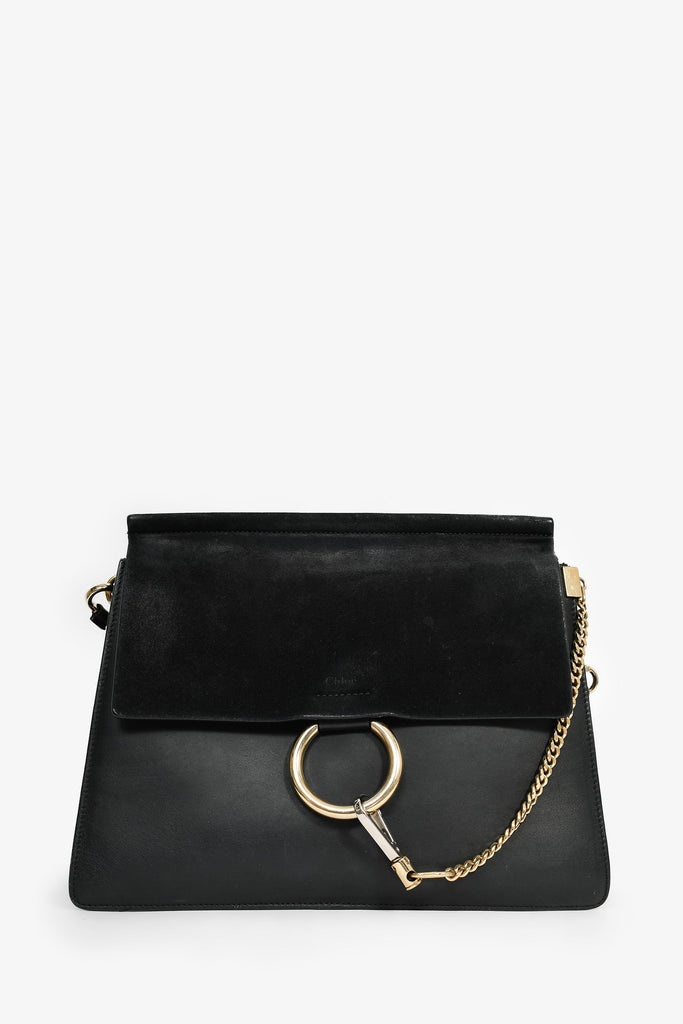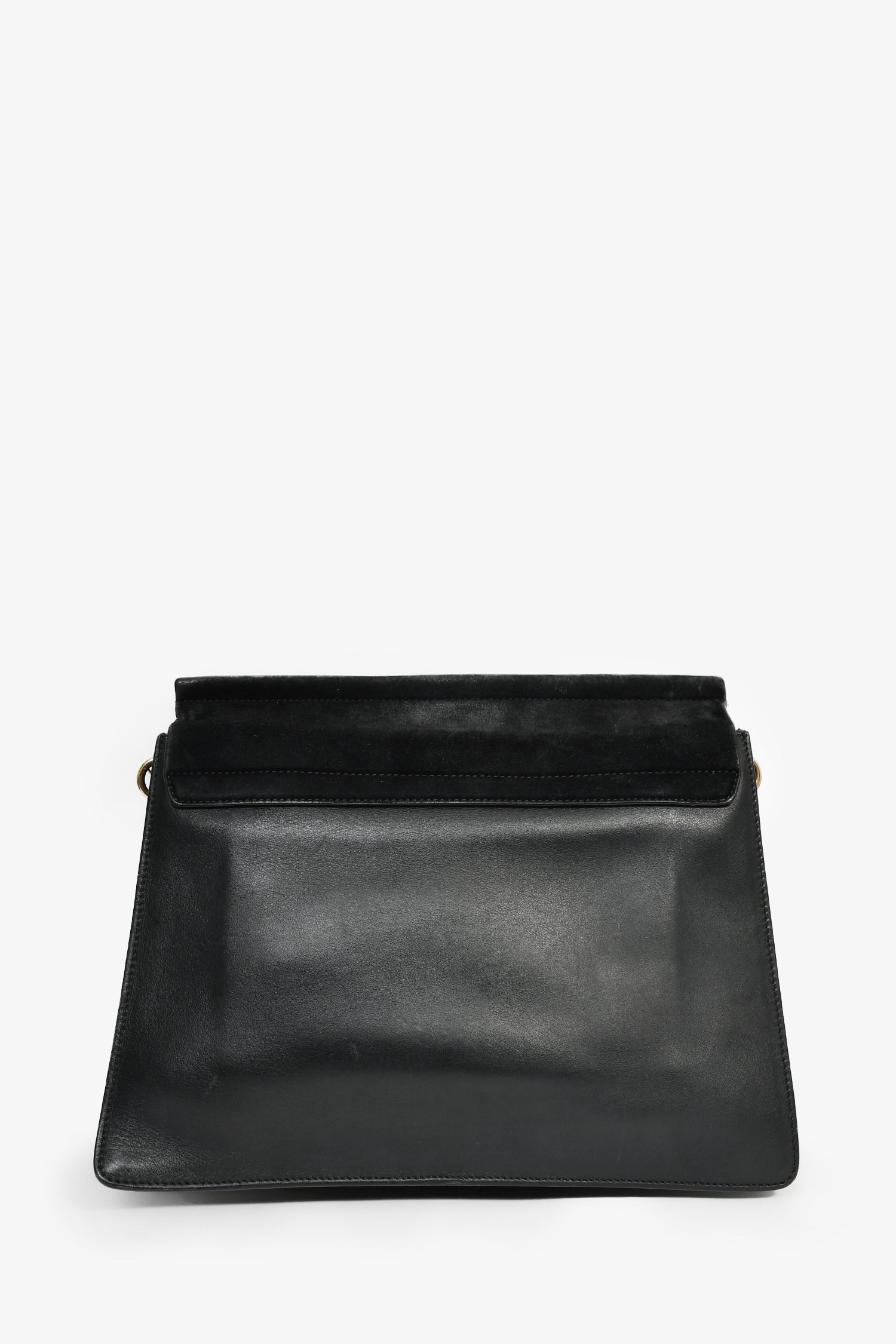 Chloe Black Leather/Suede 'Faye' Medium Top Handle Bag. Front fold-over flap with magnetic button closure. Light beige suede interior lining. Single interior wall zip pocket. Gold-tone hardware. Detachable and adjustable strap.