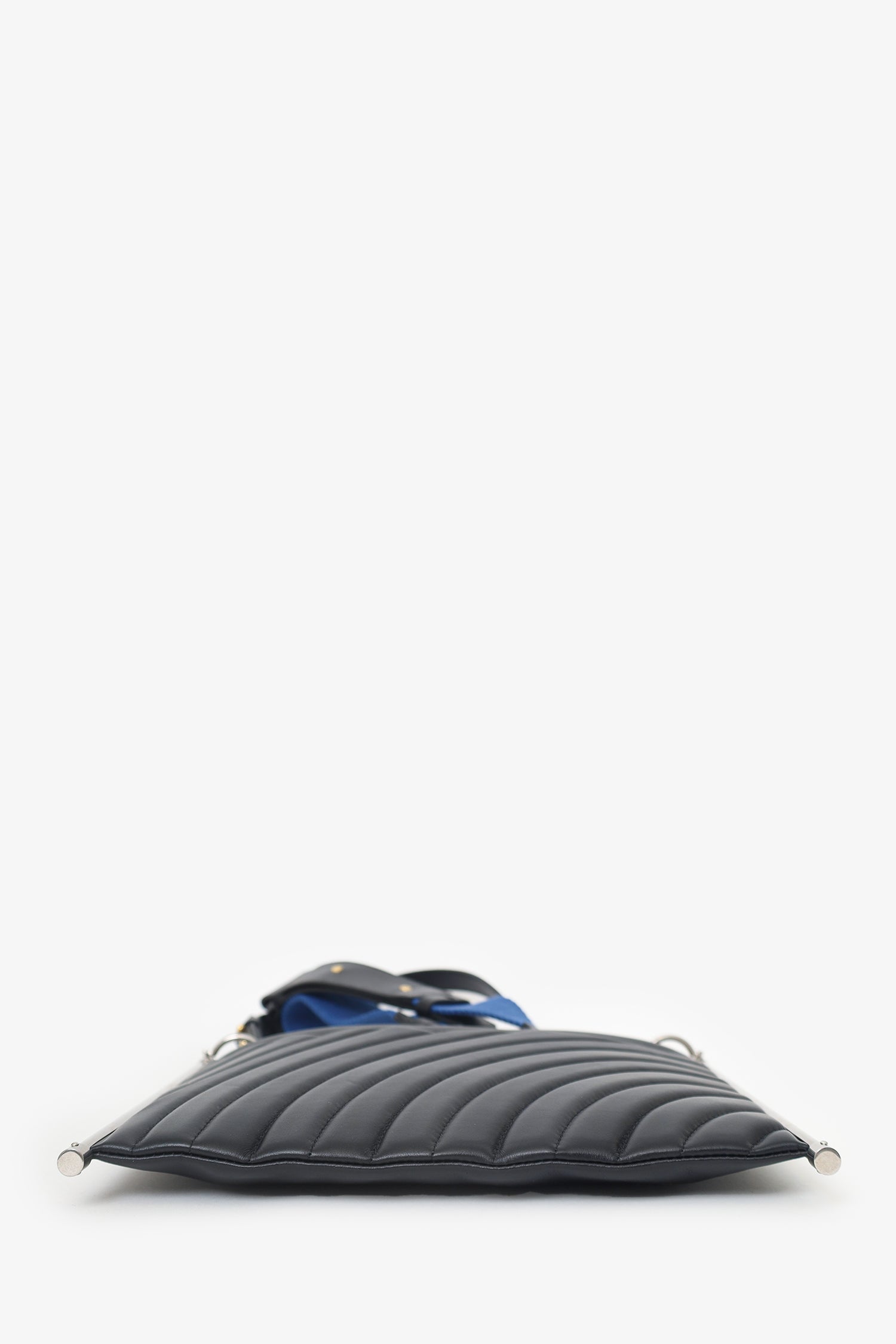Chloe Black Quilted Leather Medium Roy Shoulder Bag. Top zip closure. Adjustable shoulder strap with push-pin closure. Removable canvas and leather adjustable crossbody strap with push-pin closure. Single exterior slip pocket. Fabric lined interior. Single interior slip pocket. Silver and gold-tone hardware. Tonal stitching.