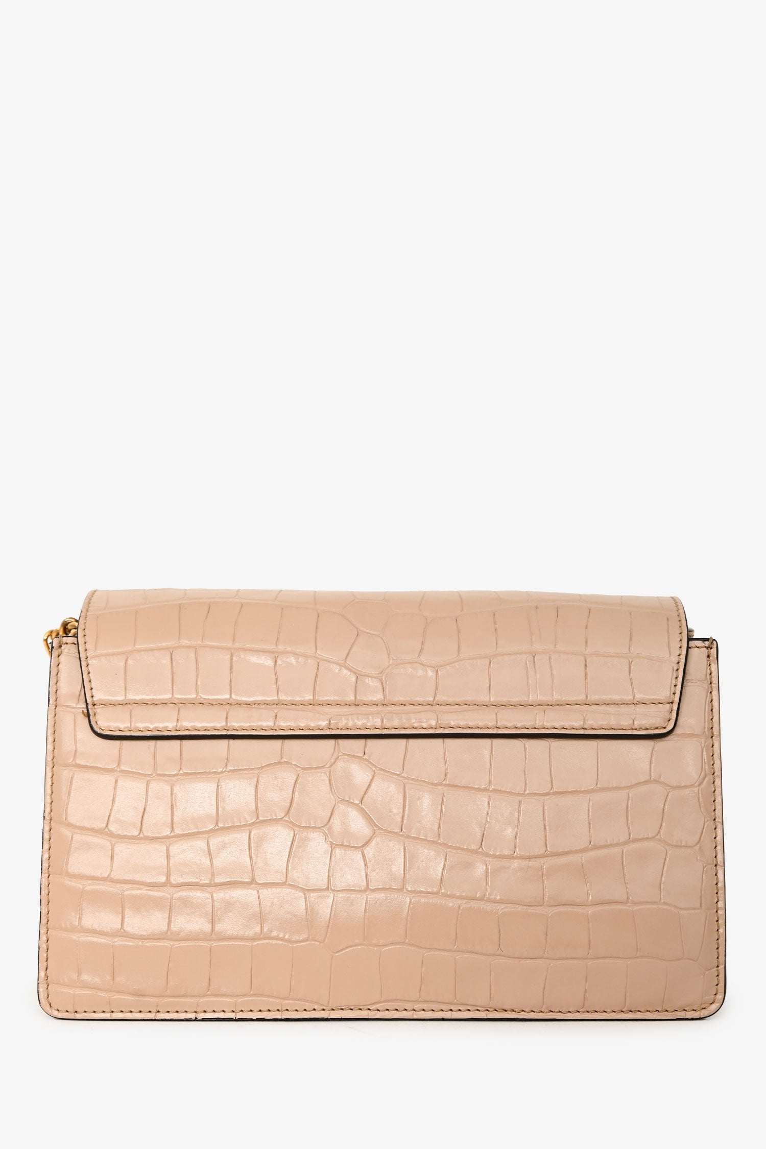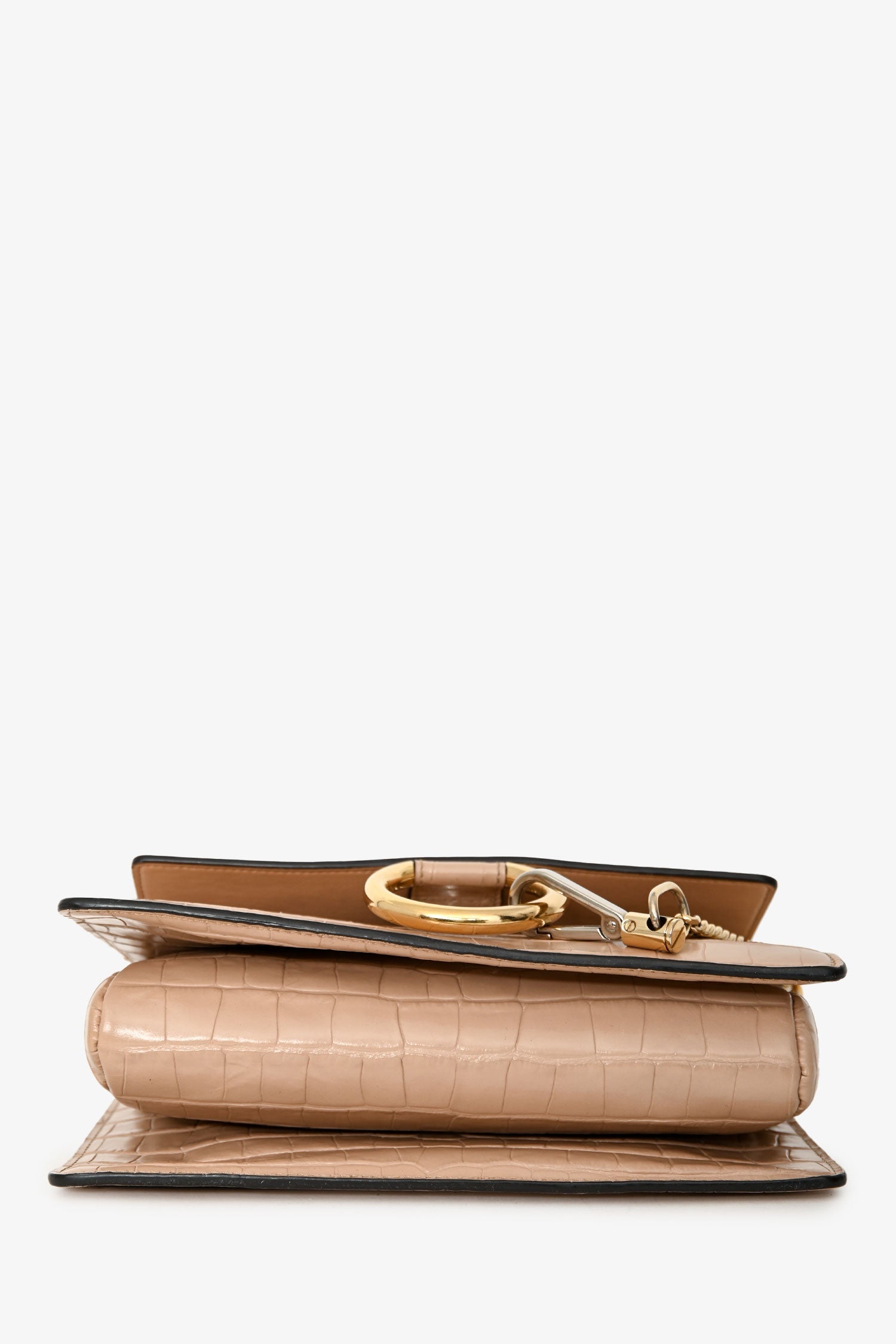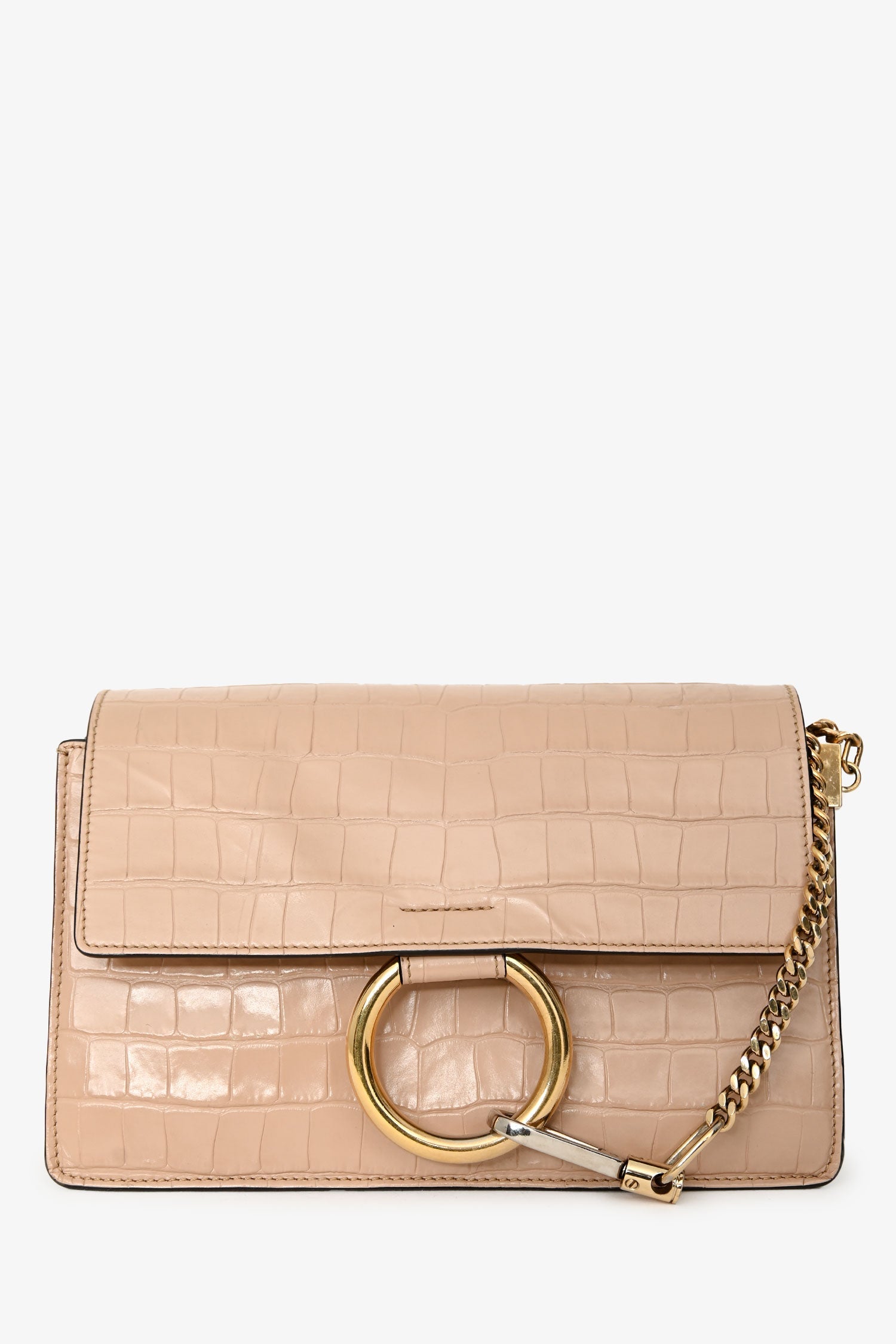 Chloé Blush Croc-Embossed Leather Small Faye Crossbody Bag. Flap closure with signature ring and chain detail. Adjustable leather crossbody strap. Suede interior. 3 interior compartments; 1 interior slip pocket. Gold-tone hardware. Tonal stitching.