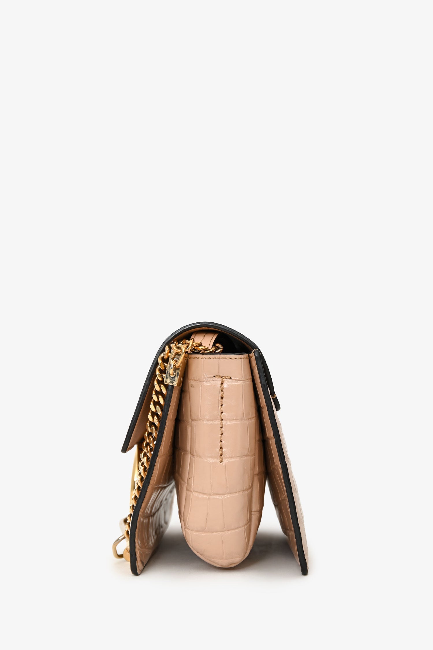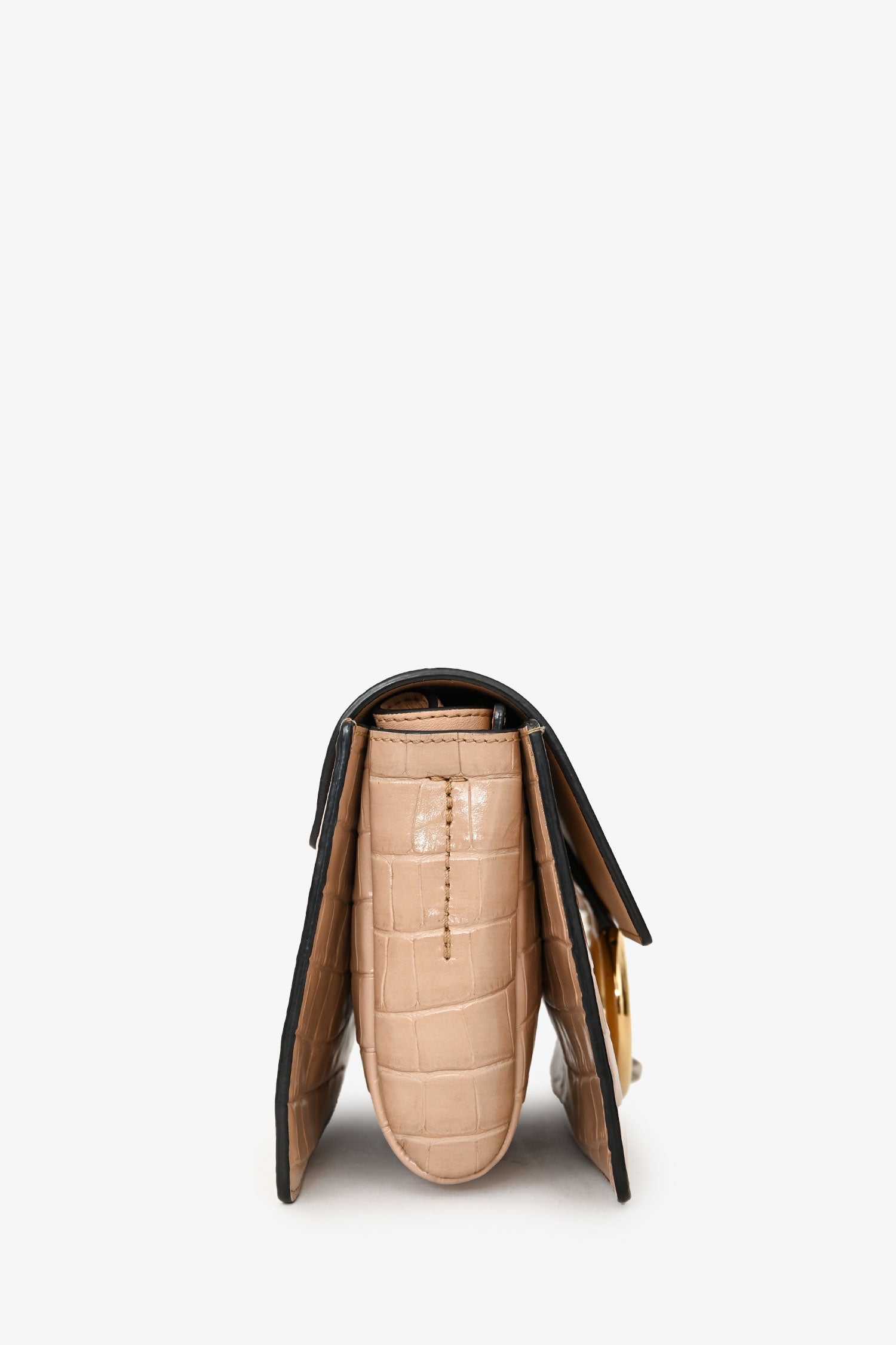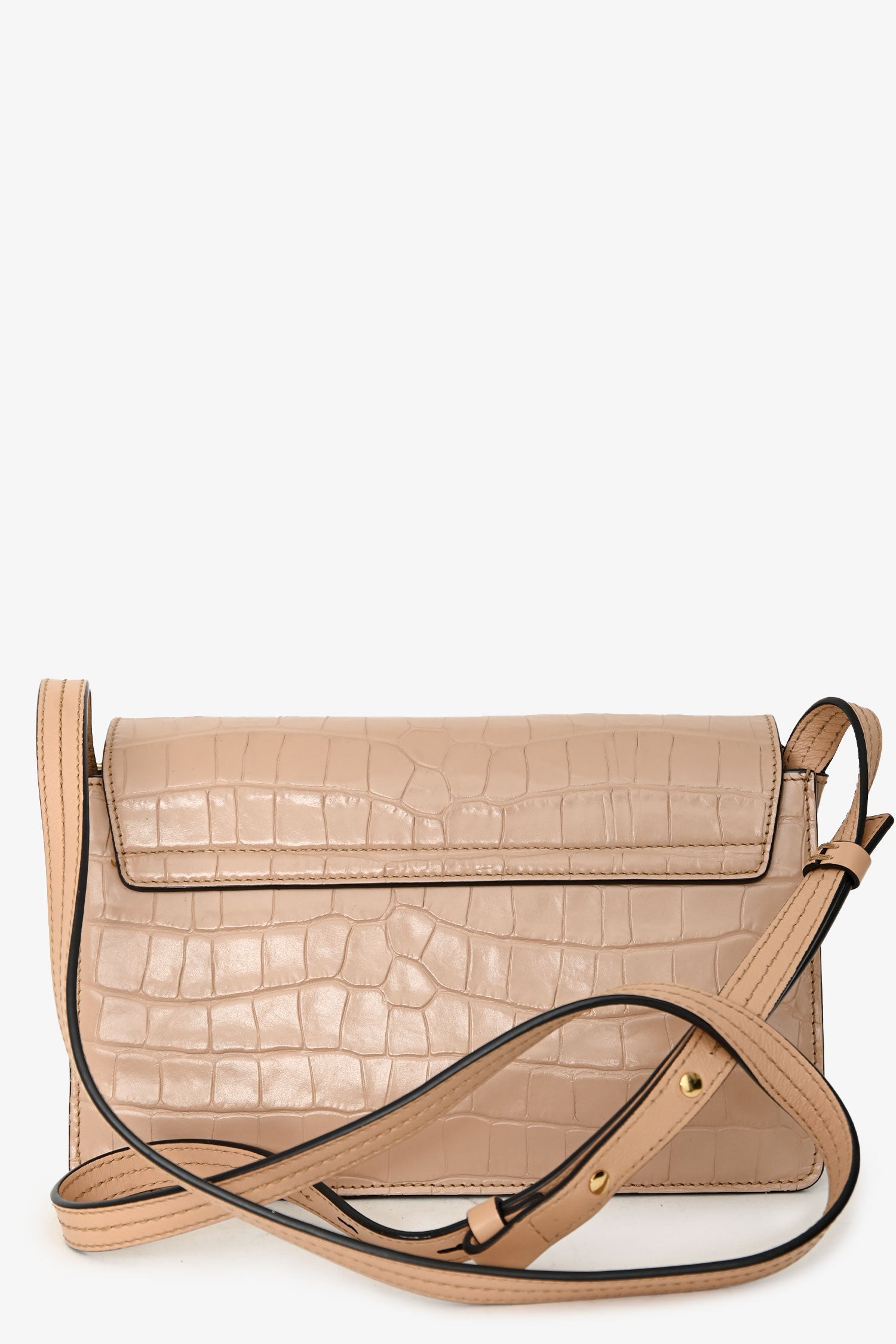 Chloé Blush Croc-Embossed Leather Small Faye Crossbody Bag. Flap closure with signature ring and chain detail. Adjustable leather crossbody strap. Suede interior. 3 interior compartments; 1 interior slip pocket. Gold-tone hardware. Tonal stitching.