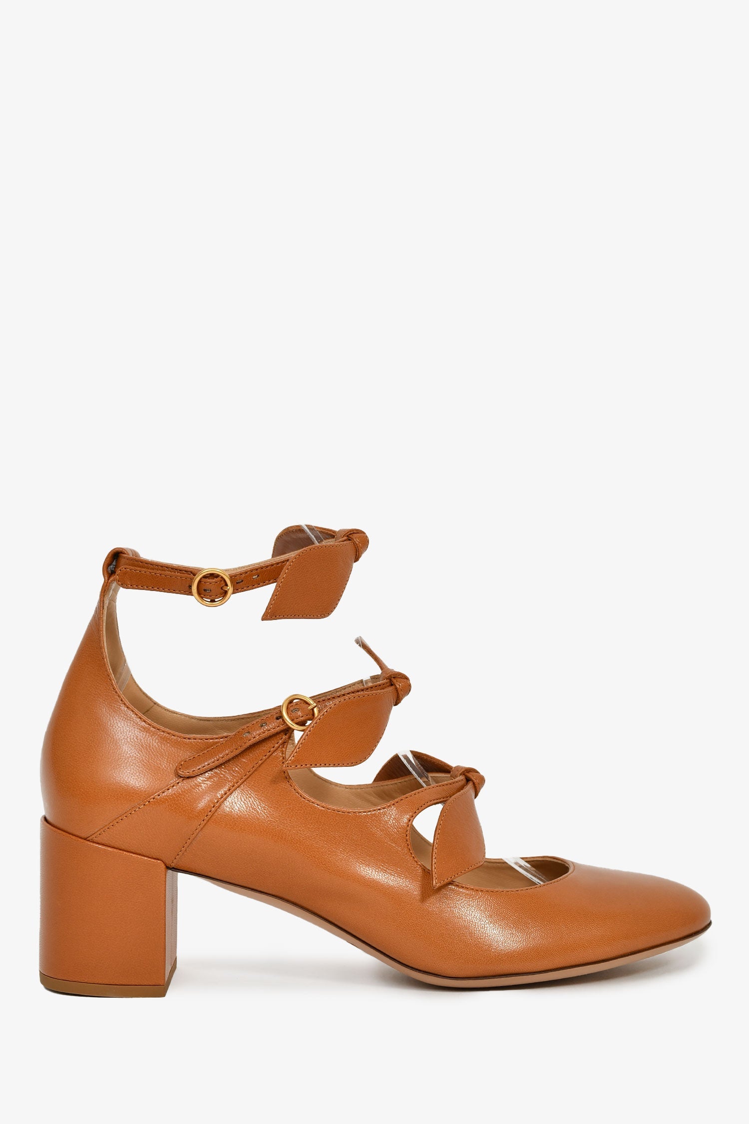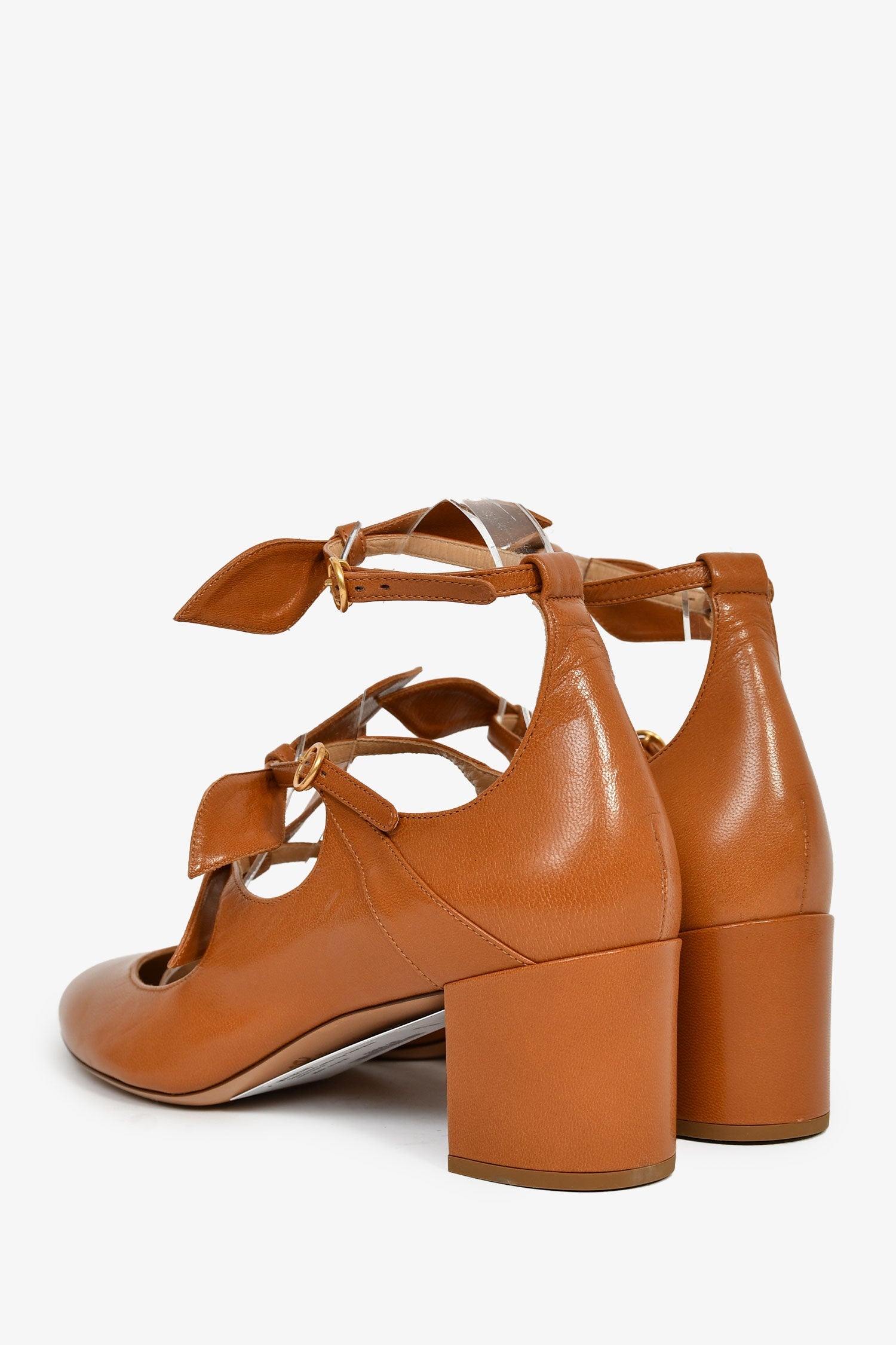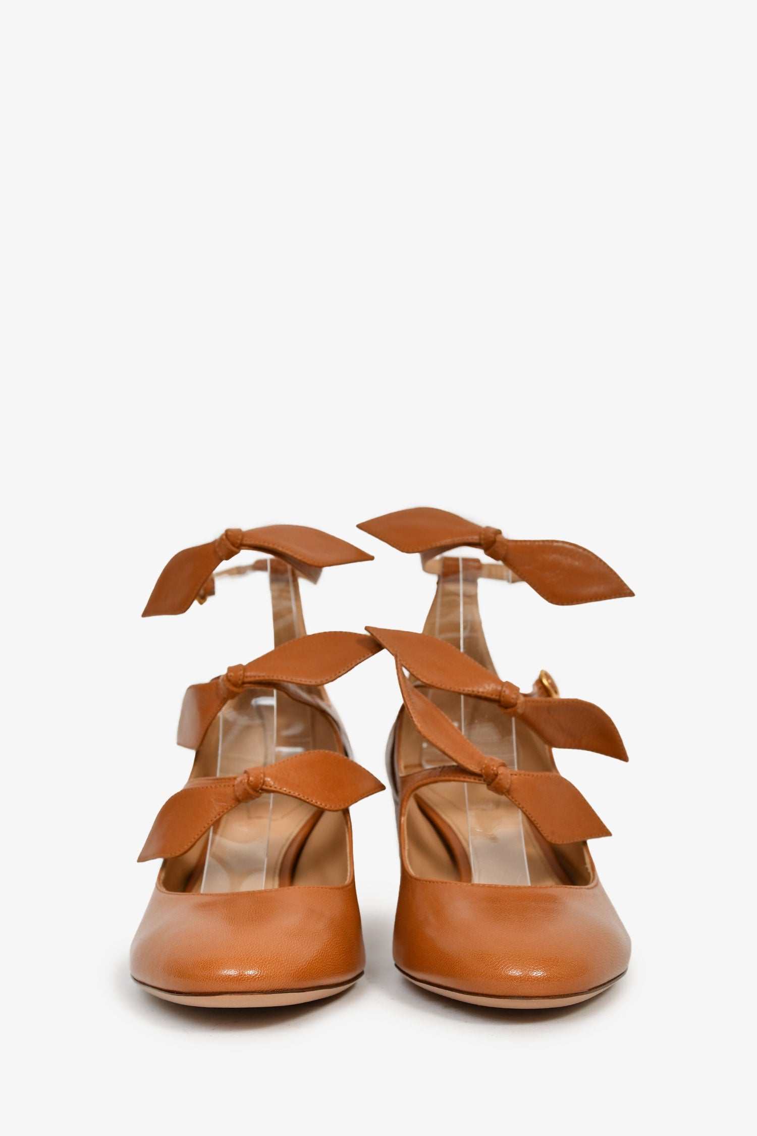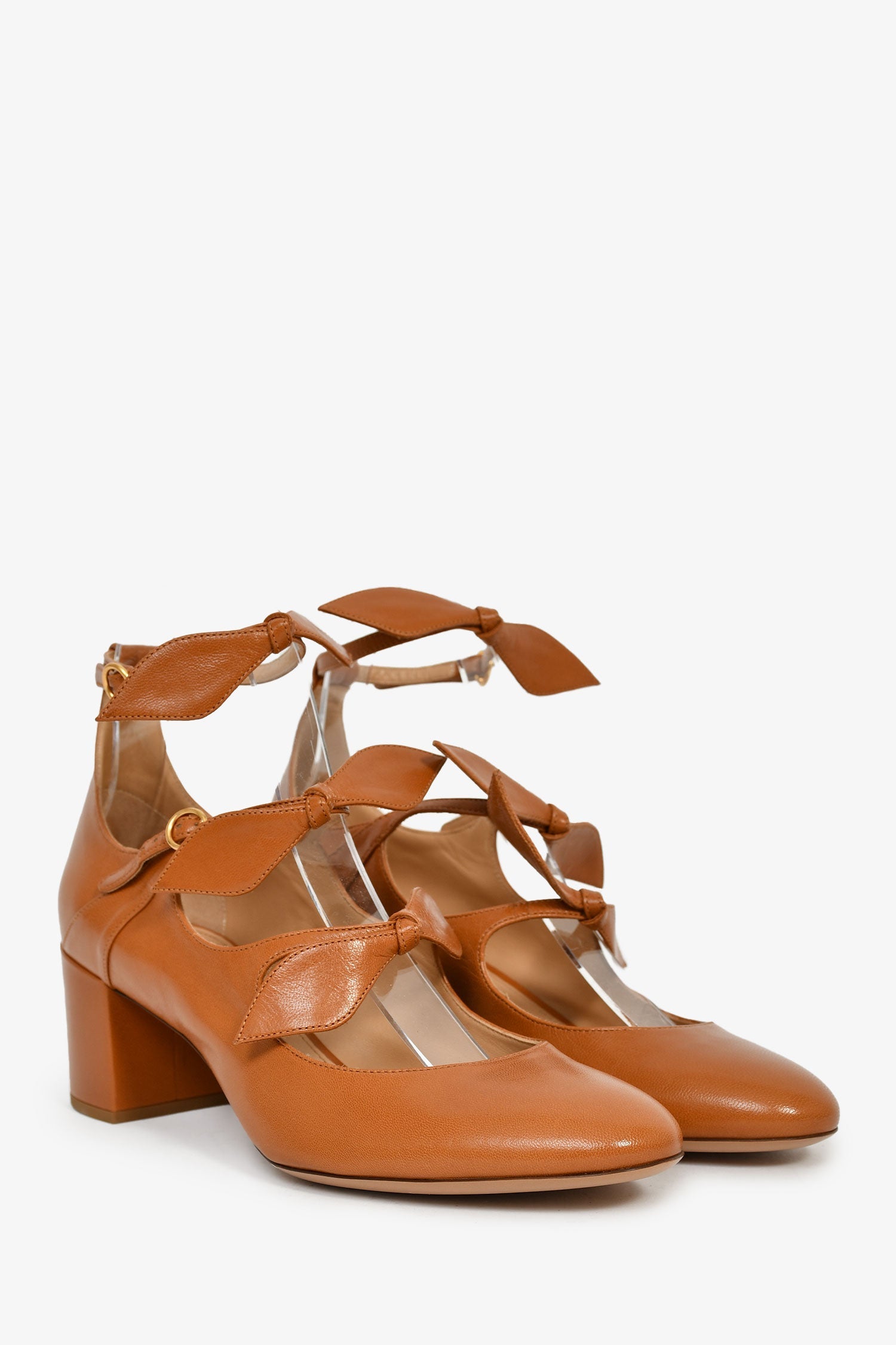 Chloe Brown Leather Bow Detail Block Heels. Round toe. Ankle straps with buckle closures. Gold-tone hardware. Tonal stitching.