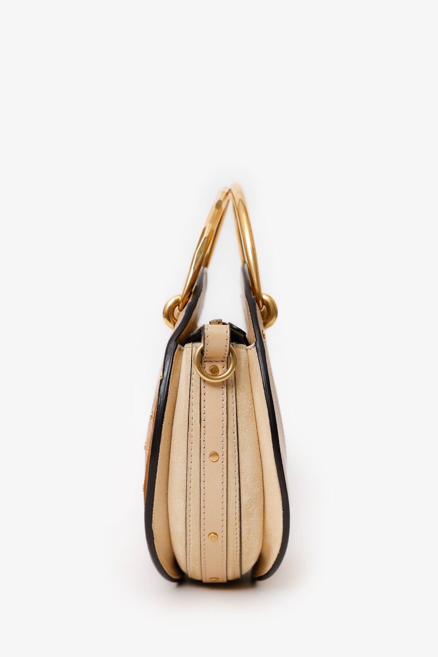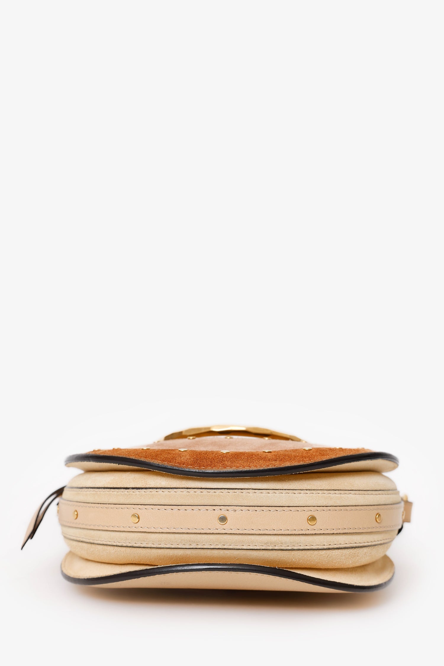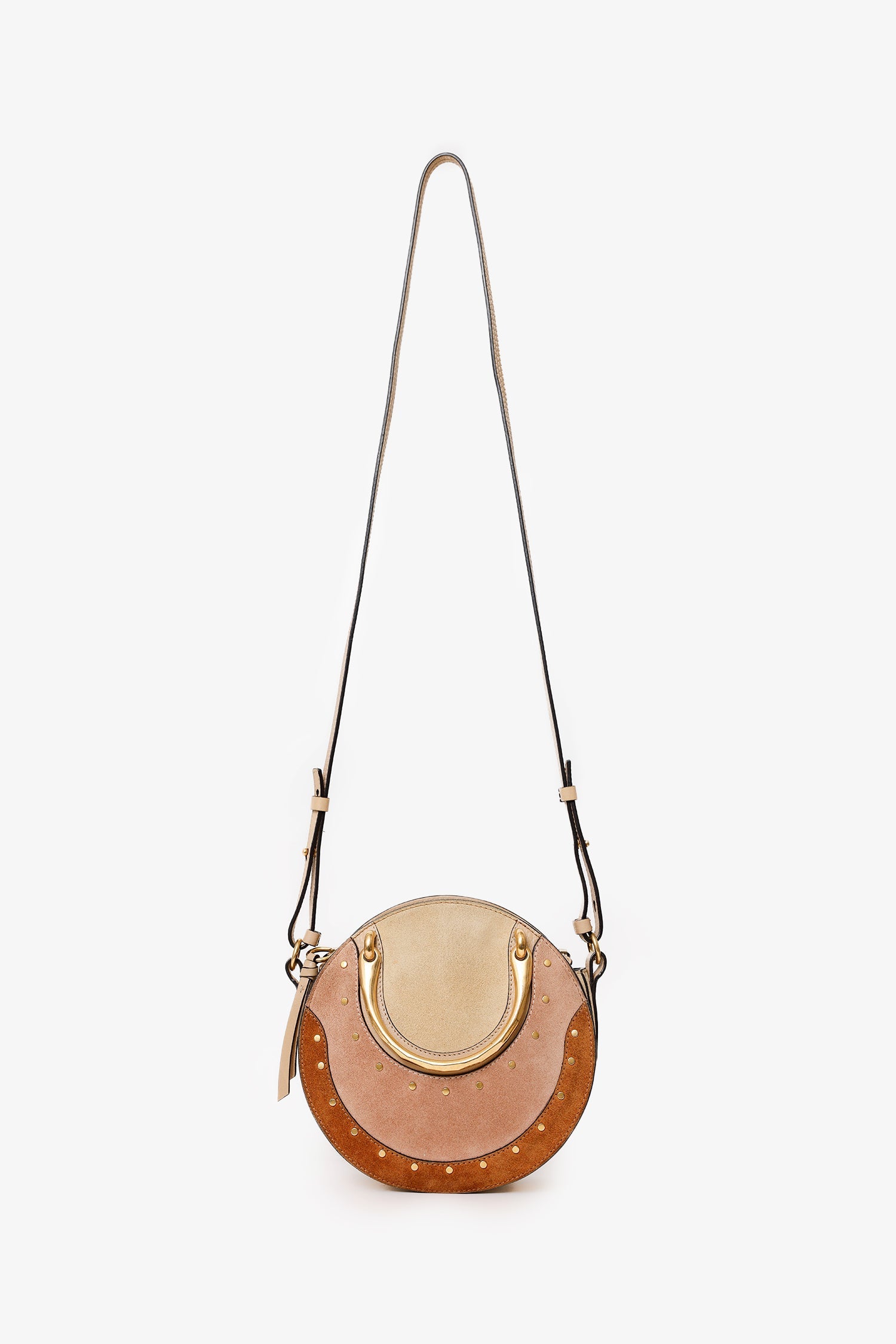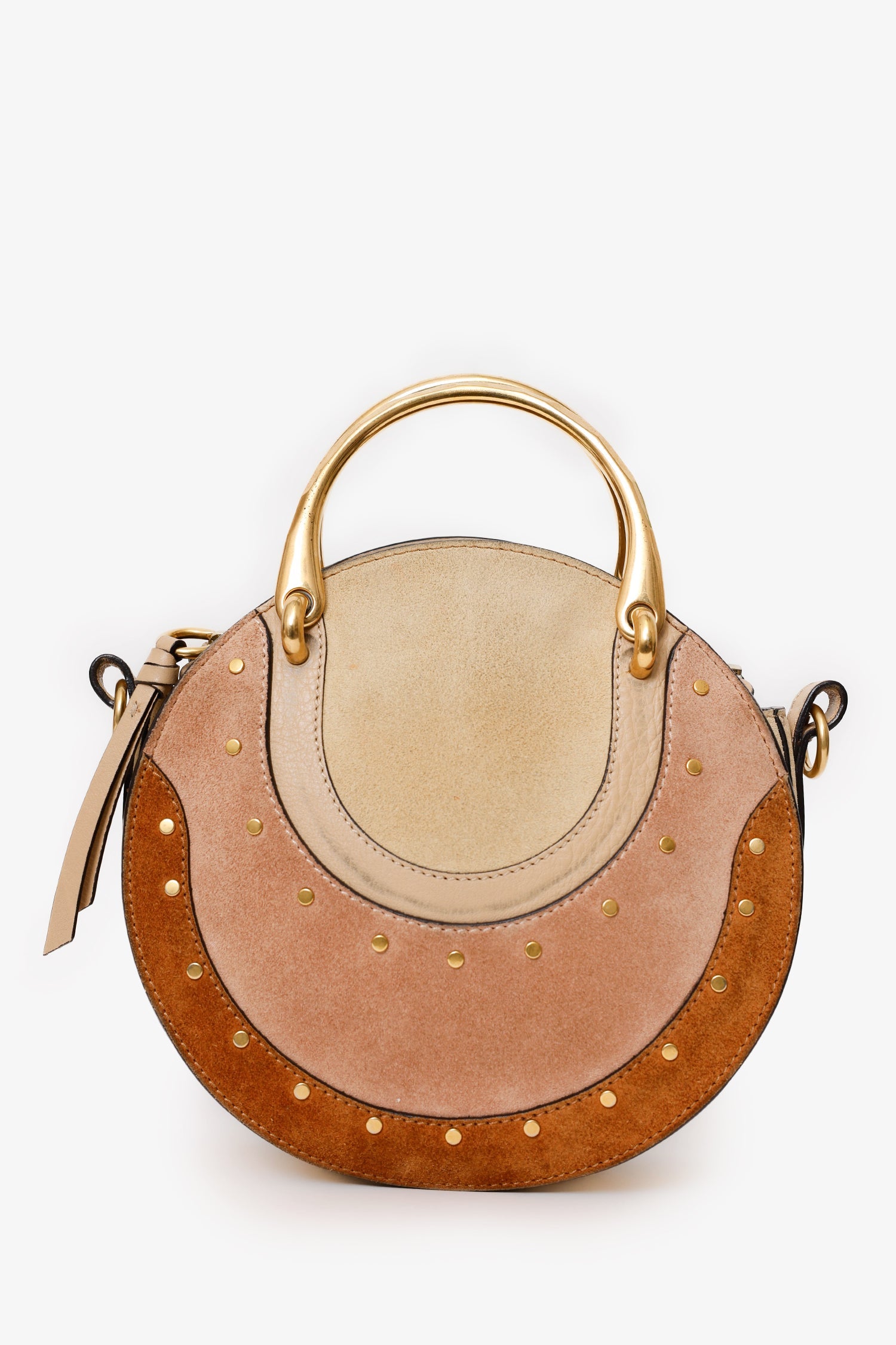 Chloe Brown Suede/Leather Studded Small Pixie Round Bag. Top zip-up closure. Twin top handles. Removable and adjustable crossbody strap with pull-through push-pin closure. Suede-lined interior with single rear slip pocket. Gold-tone hardware. Tonal stitching.