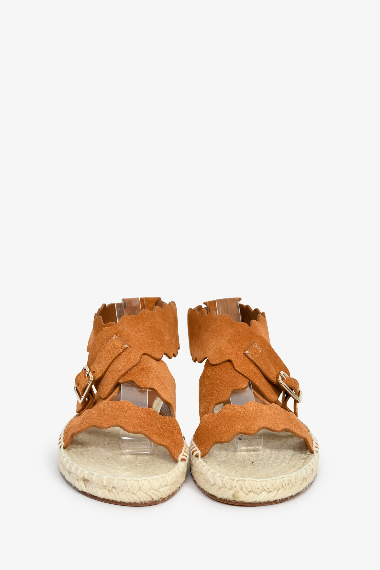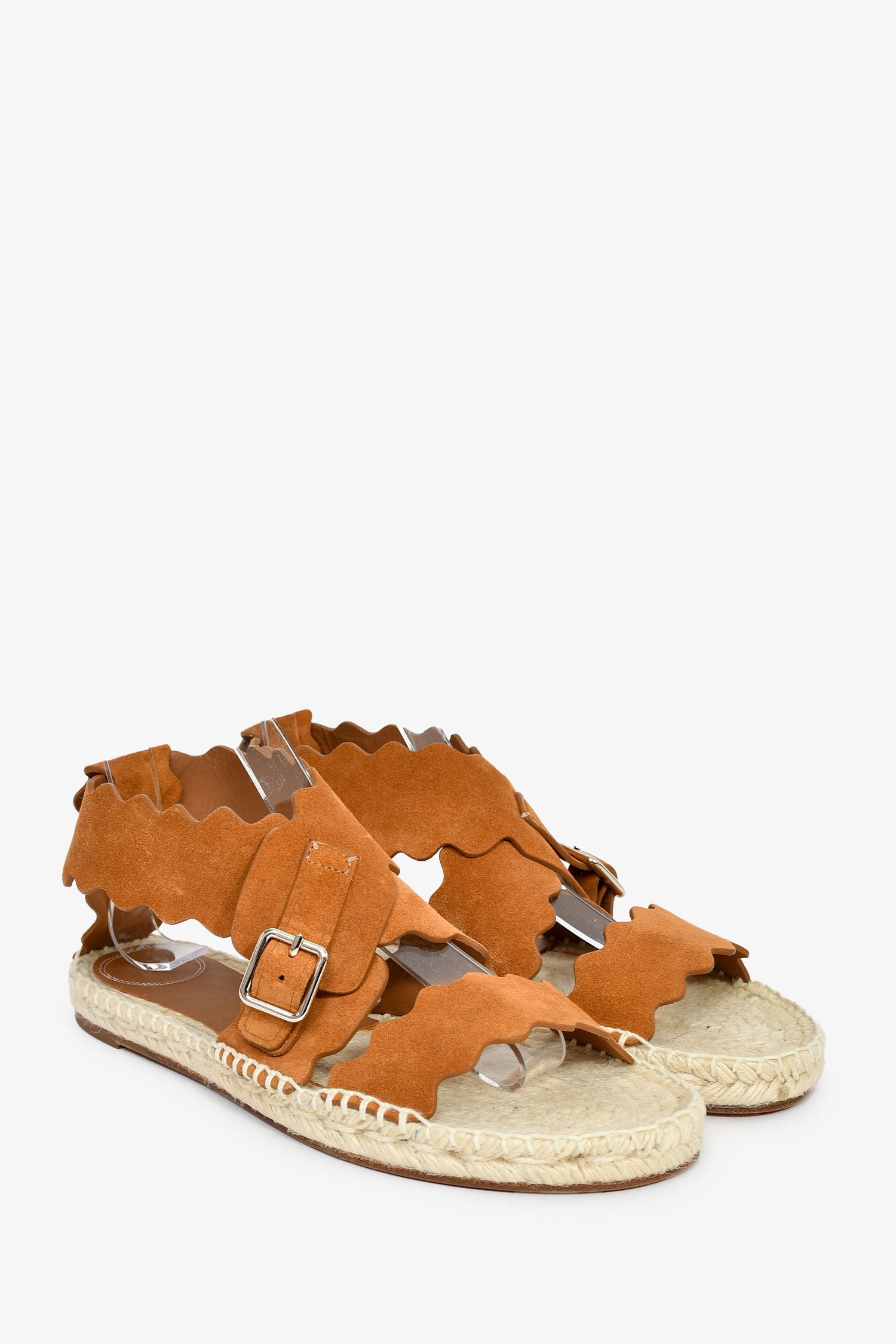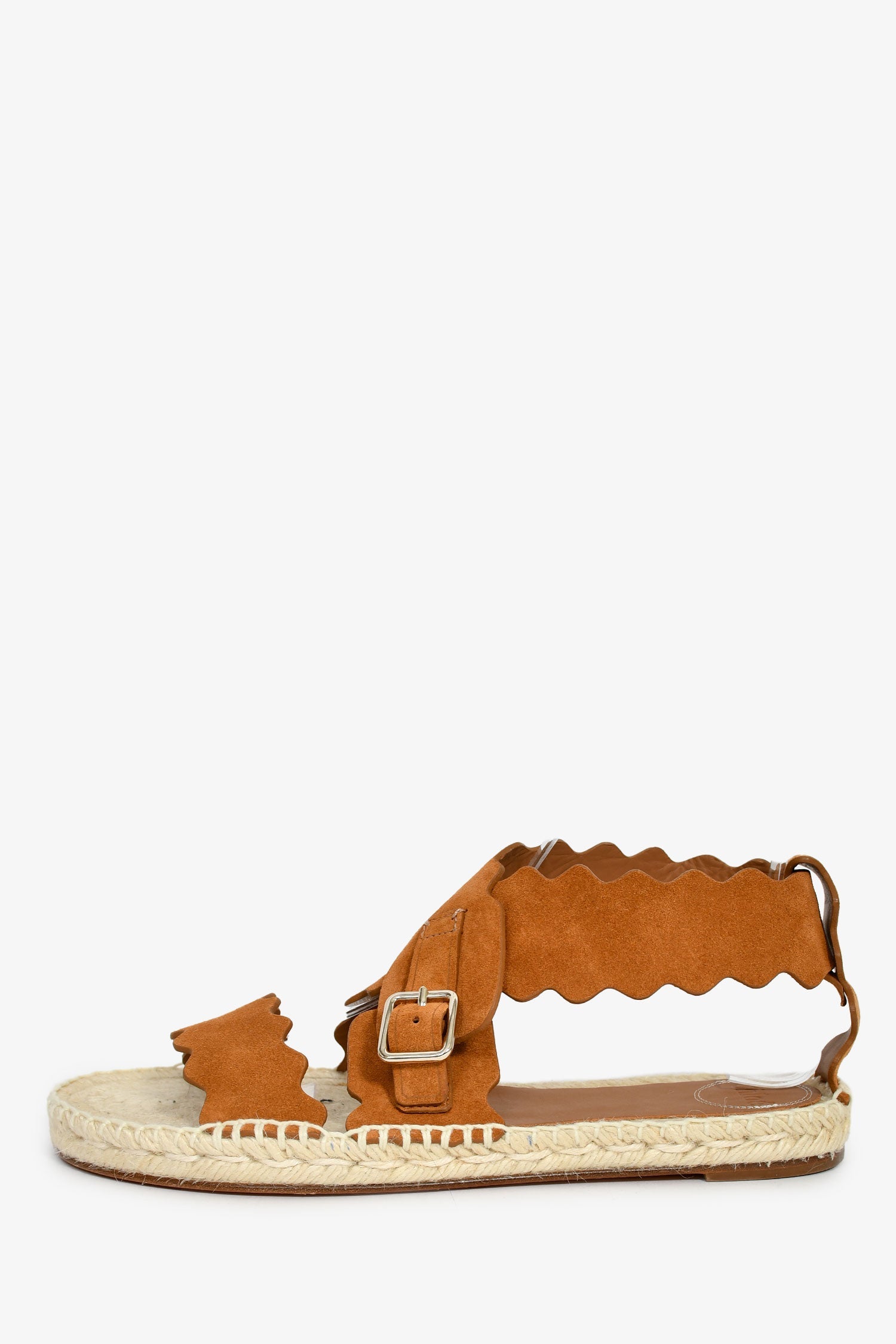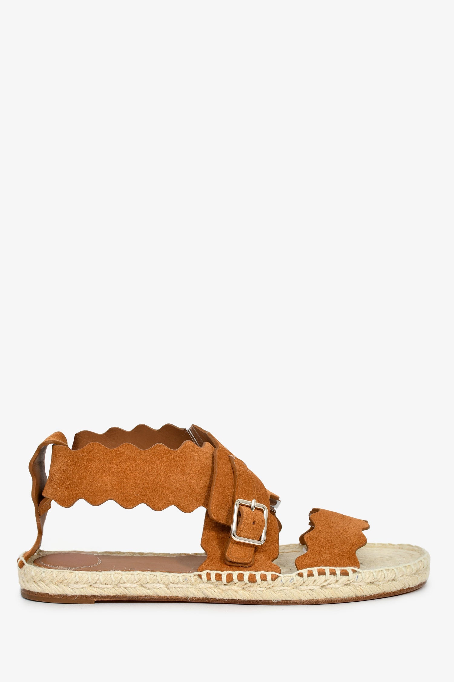 Chloe Brown Suede Scalloped Espadrille Sandals. Open round toe. Ankle strap with buckle closure. Silver-tone hardware. Tonal stitching.