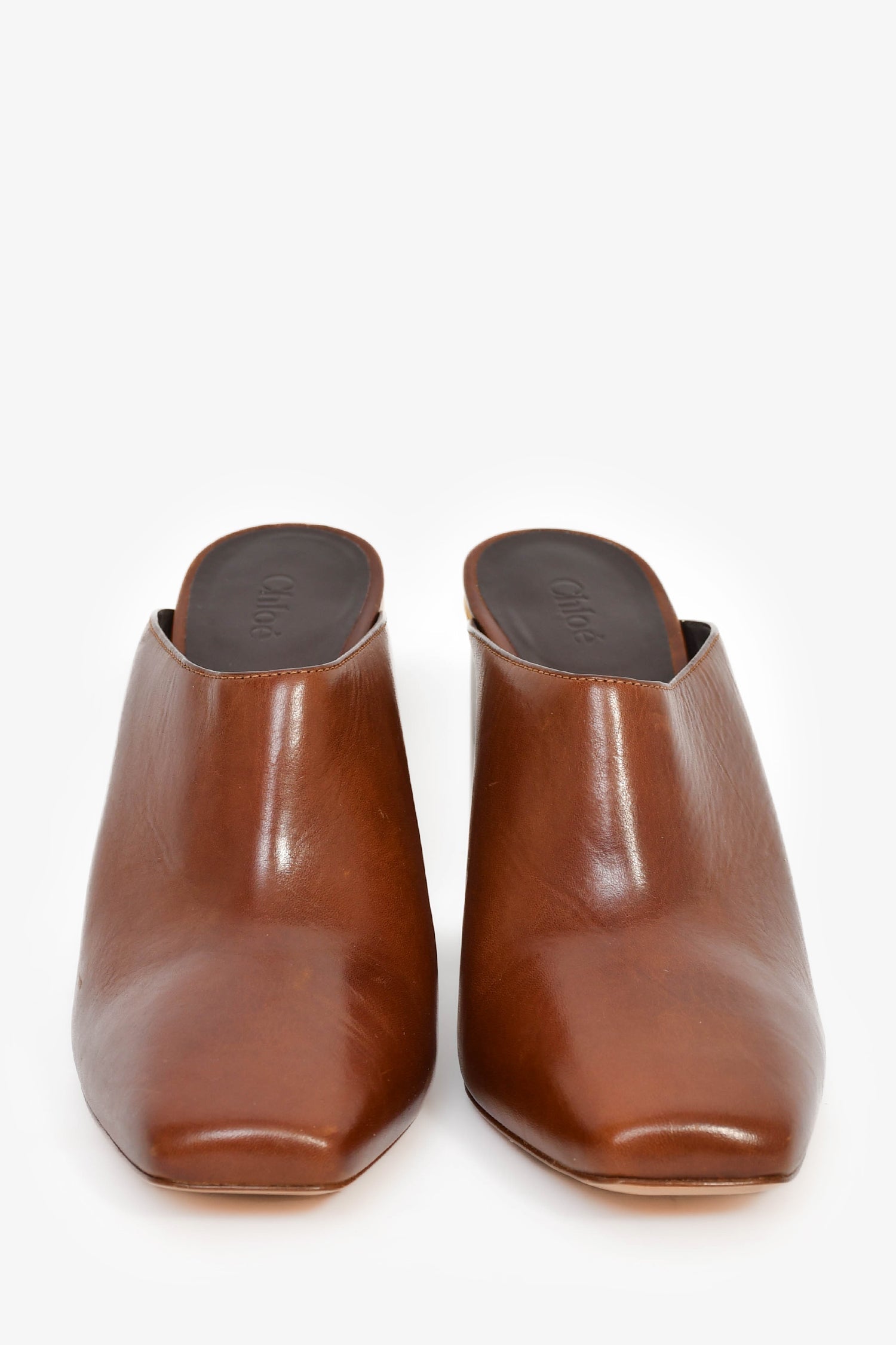 Chloe Dark Brown Heeled Mules. Square toe. Leather insole. Block heel. Gold-tone hardware. Tonal stitching.