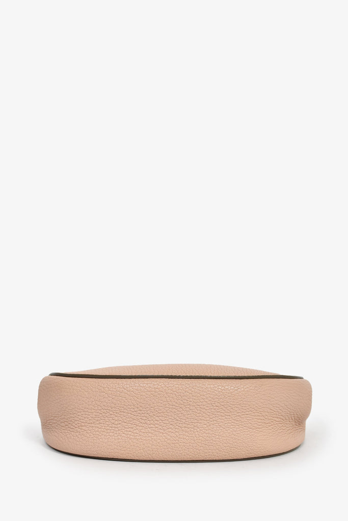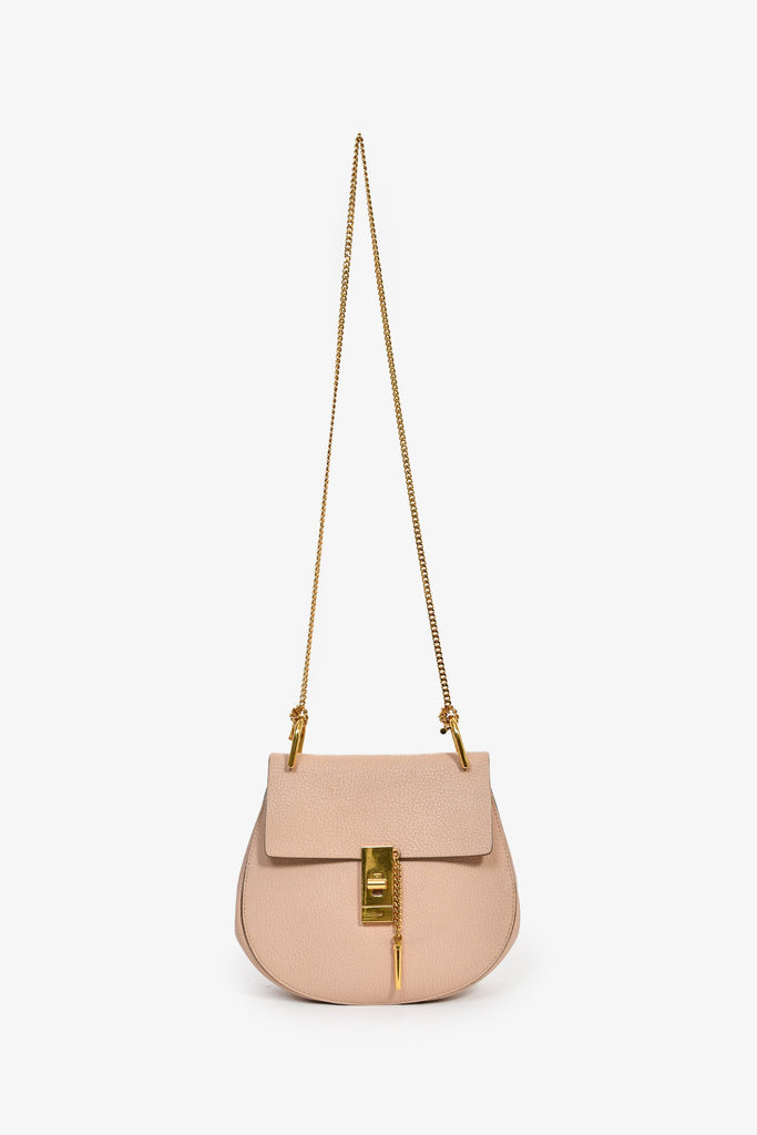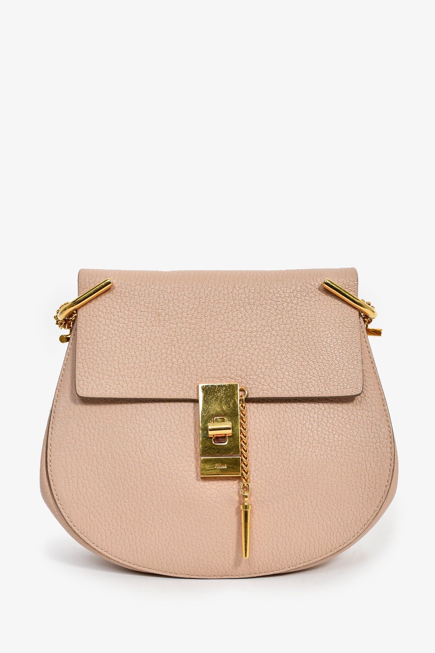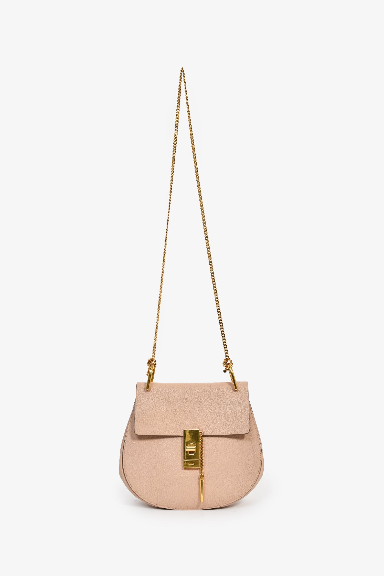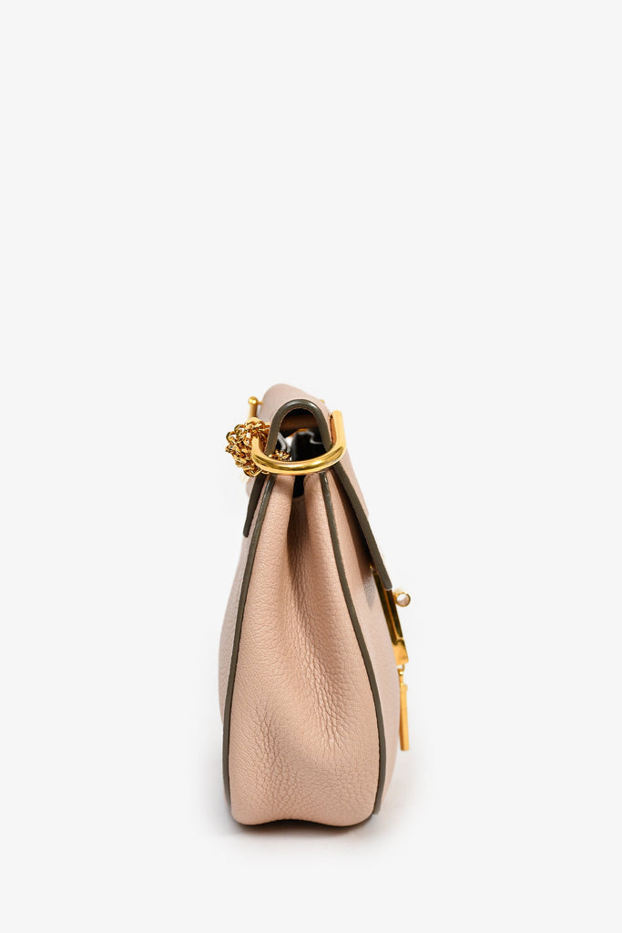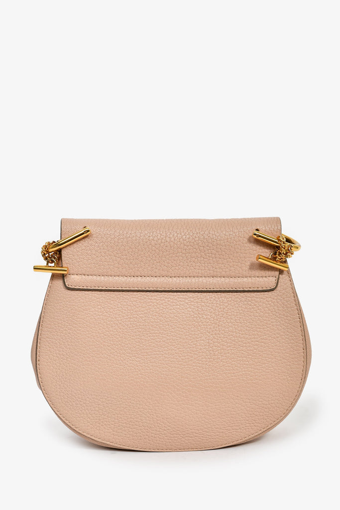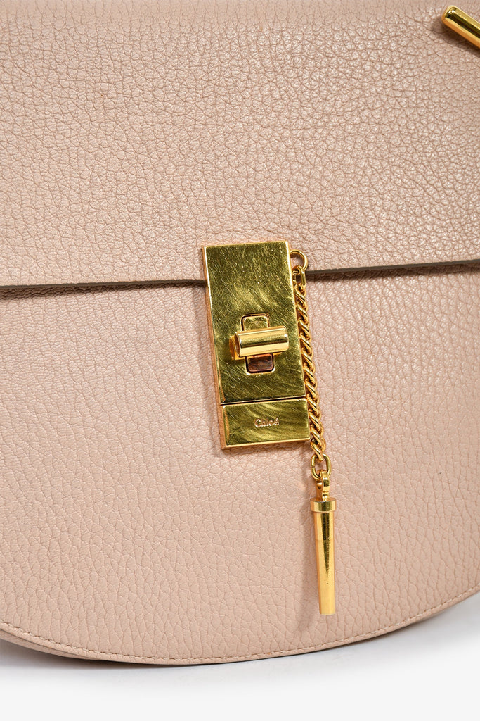 Chloe Pink Grained Leather 'Drew' Crossbody Bag. Front fold-over flap with turn-lock closure. Light taupe suede interior lining. Single interior wall flap with slip pocket. Chain crossbody strap. Gold-tone hardware.