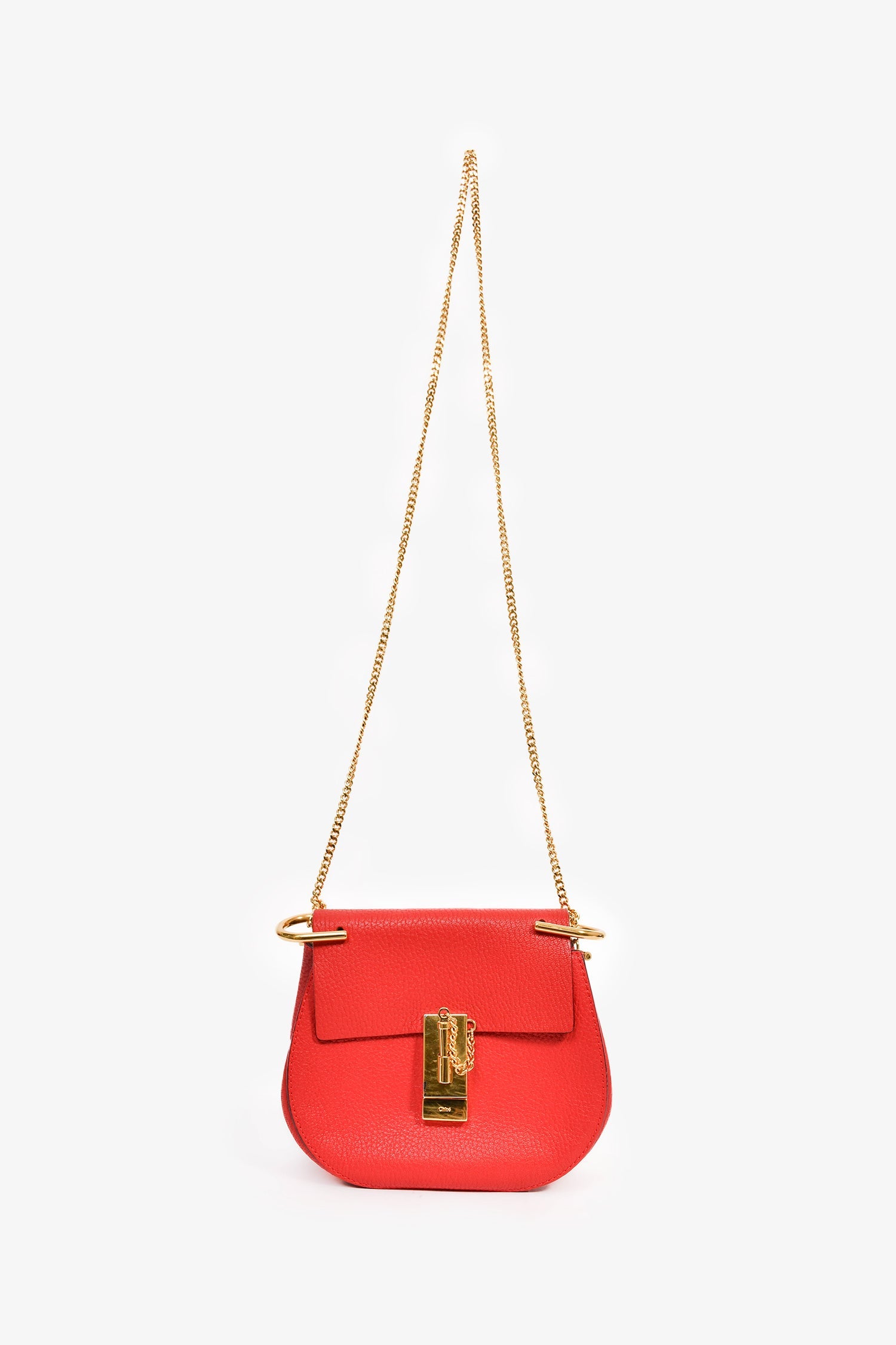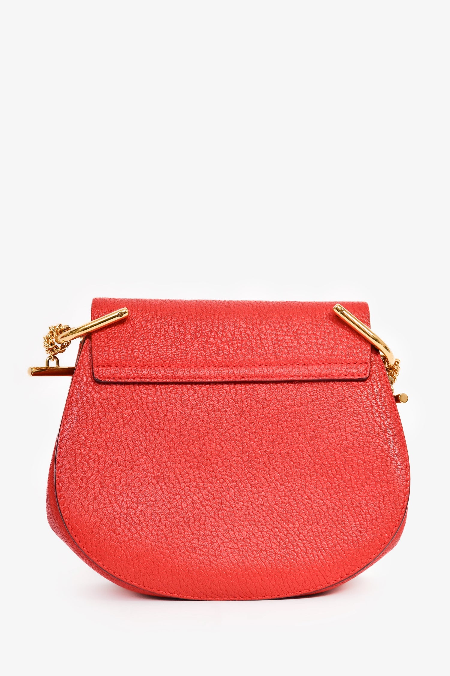 Chloe Red Leather 'Drew' Crossbody Bag. Front fold-over flap with turn-lock closure. Beige suede interior lining. Single interior wall flap with slip pocket. Gold-tone hardware.