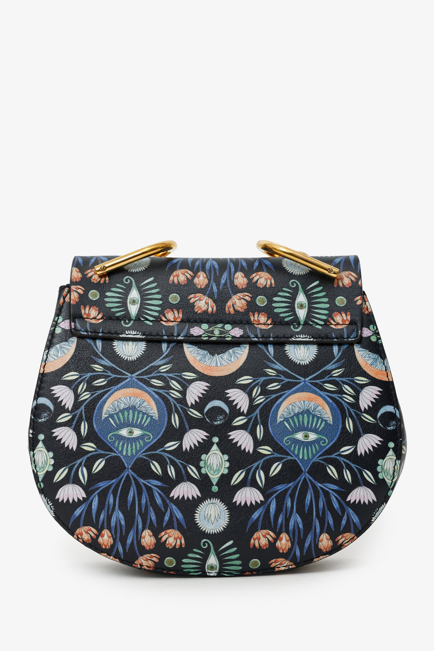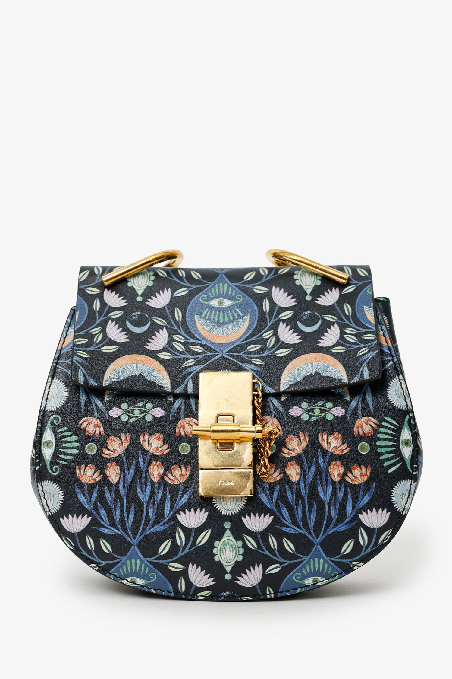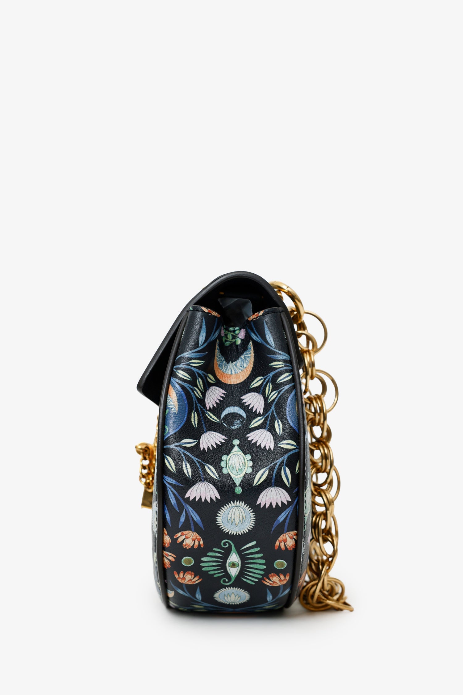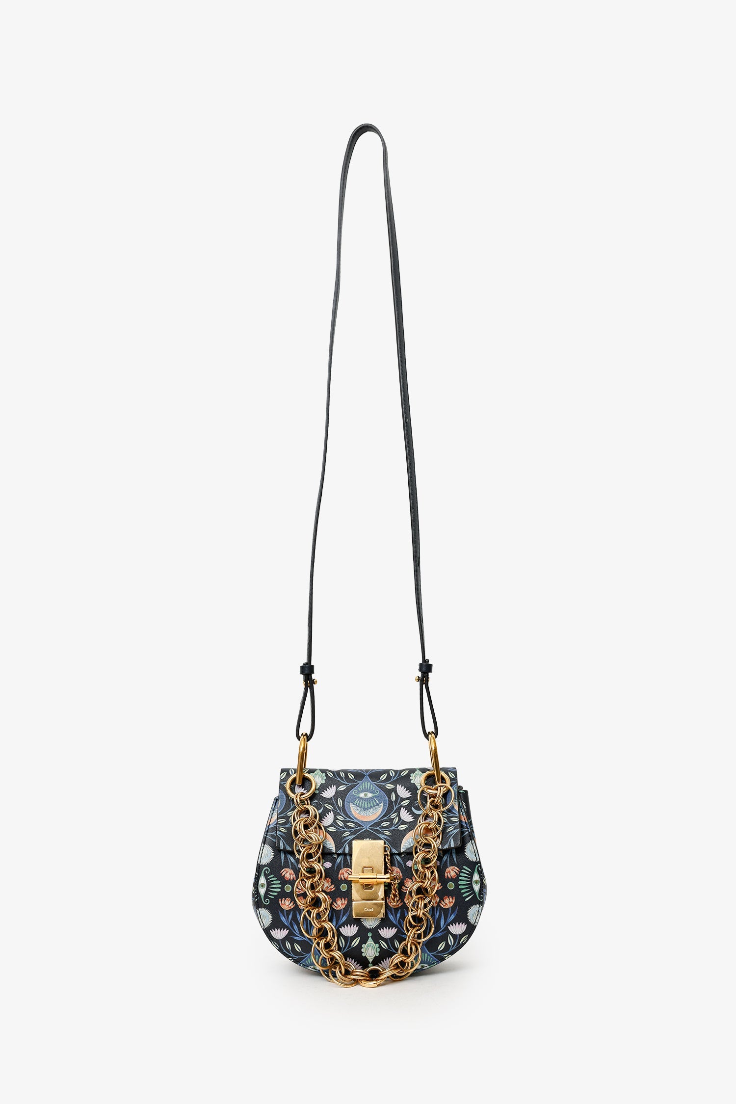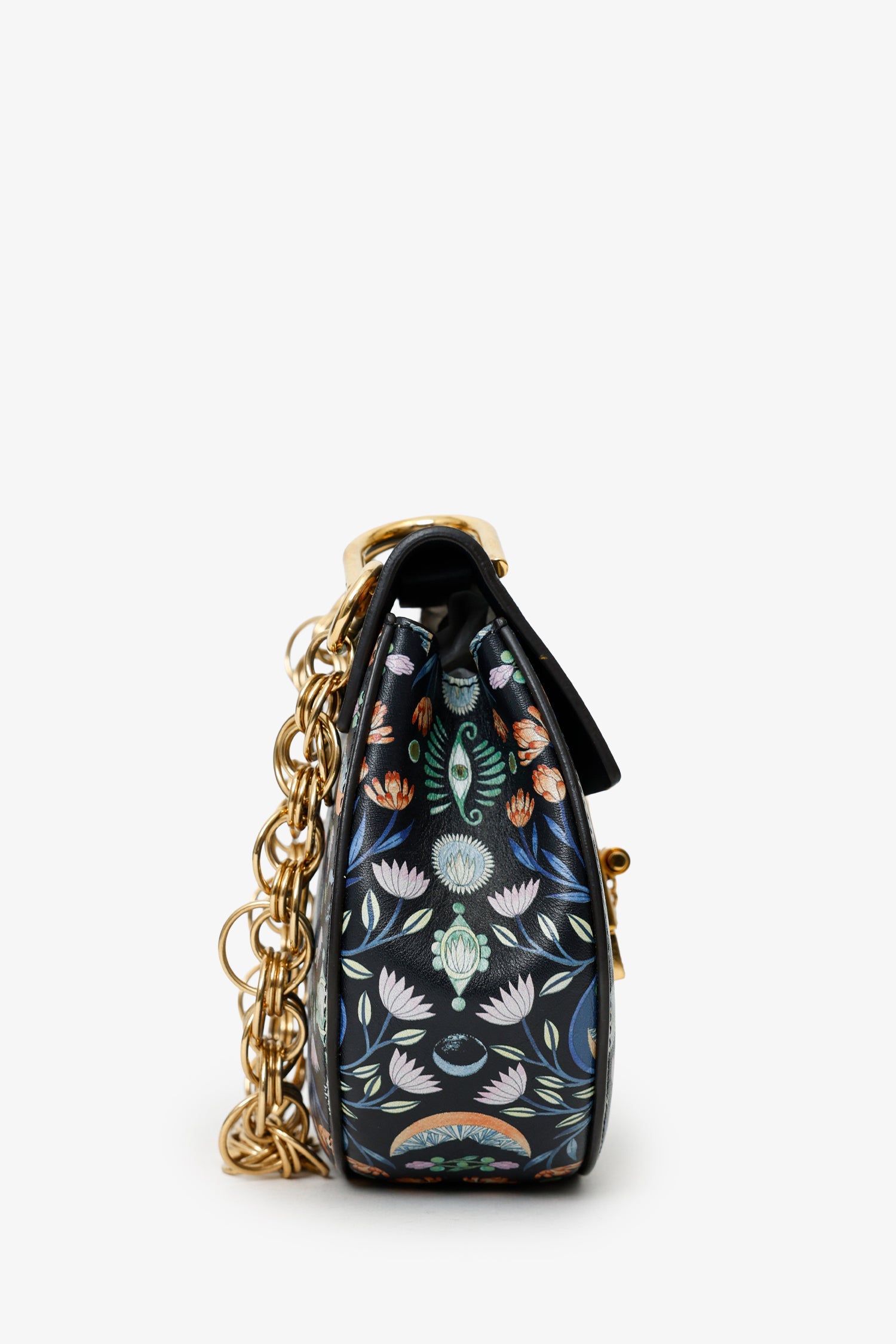 Chloe x Rithika Merchant Black/Multicolour Leather Floral Print Mini Bijou Drew Bag. Front fold-over flap with pull-through clasp closure. Chain link top handle. Removable shoulder strap with adjustable pull-through push-pin closure. Lined interior with single slip pocket.