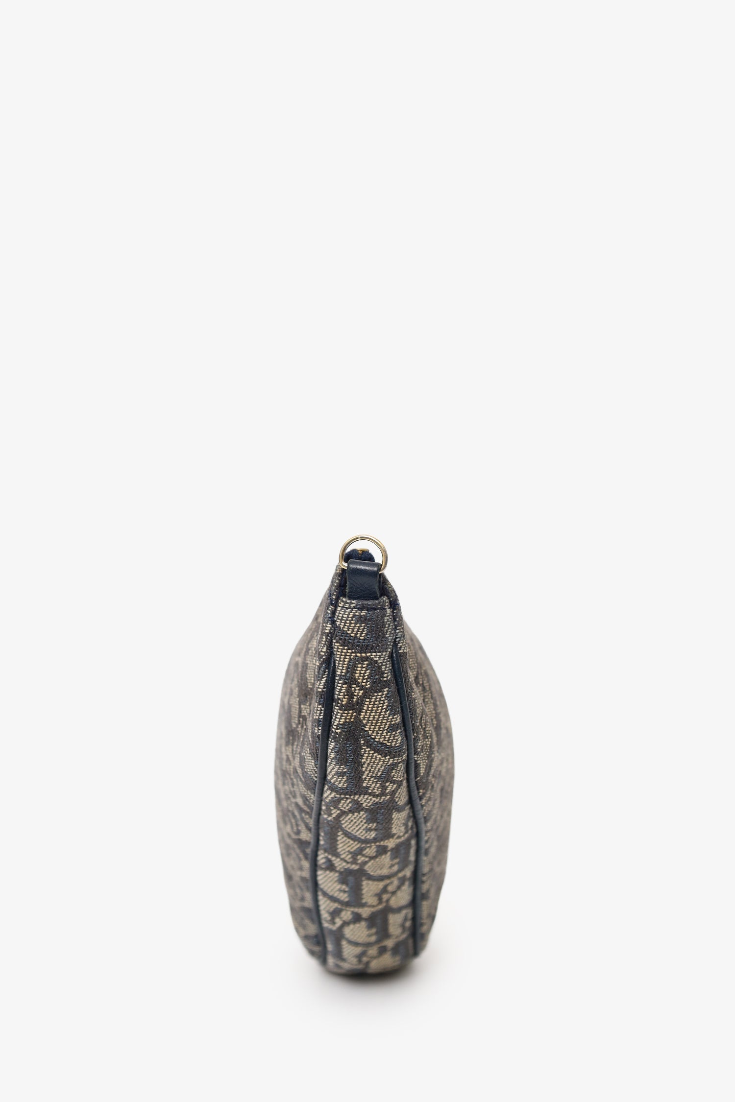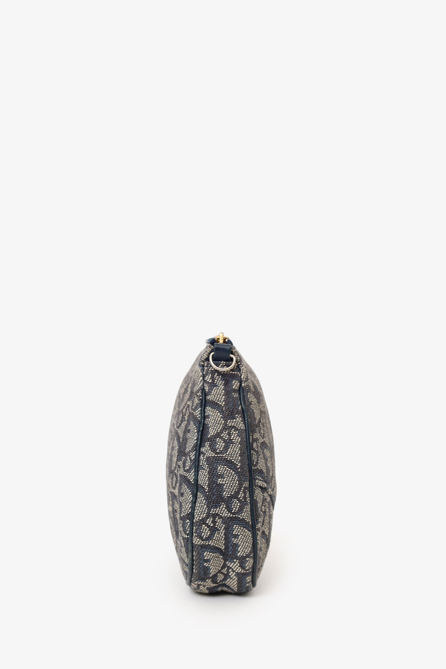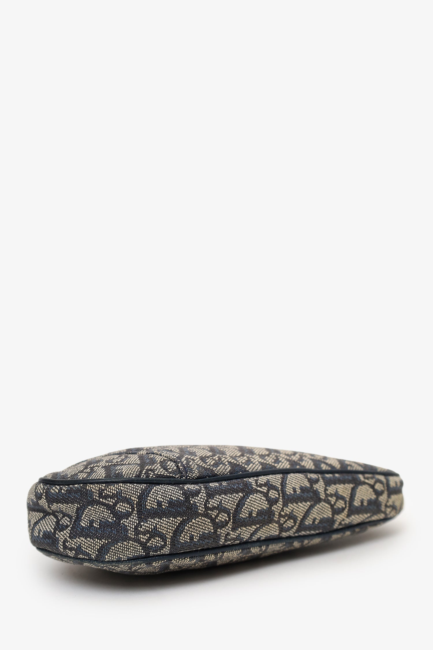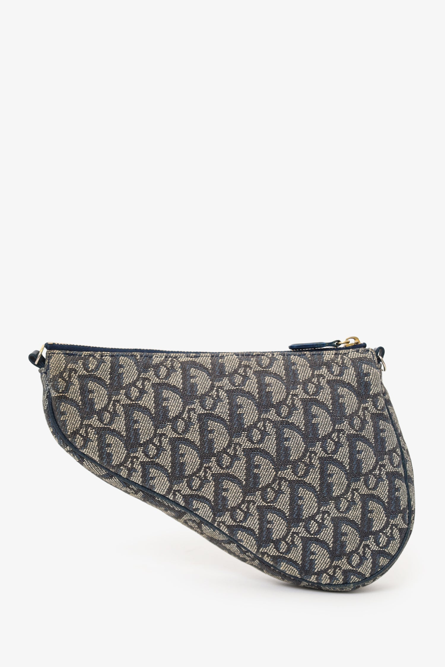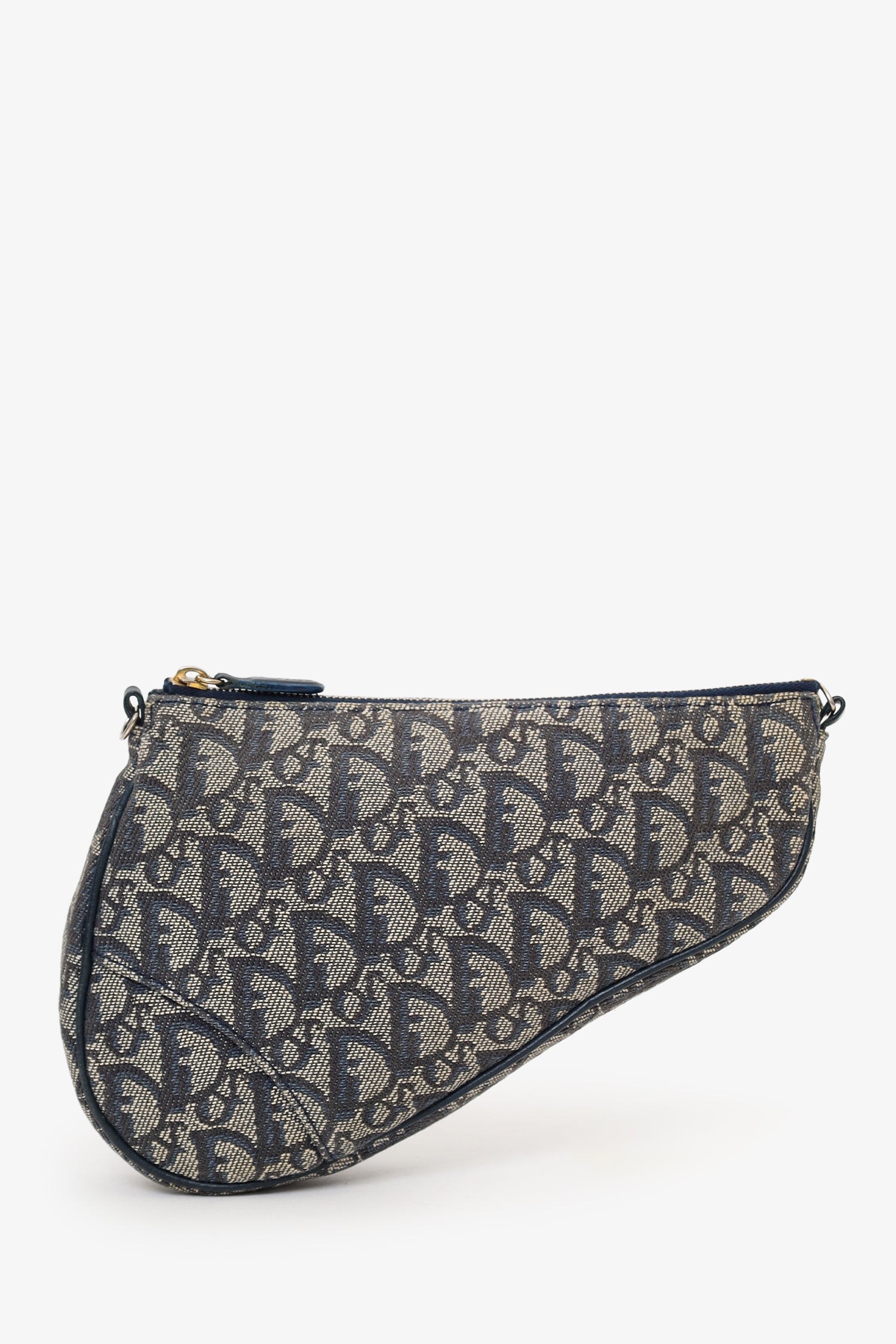 Christian Dior 2004 Navy Oblique Saddle Pouch. Top zip closure. Lined interior. Gold-tone hardware.