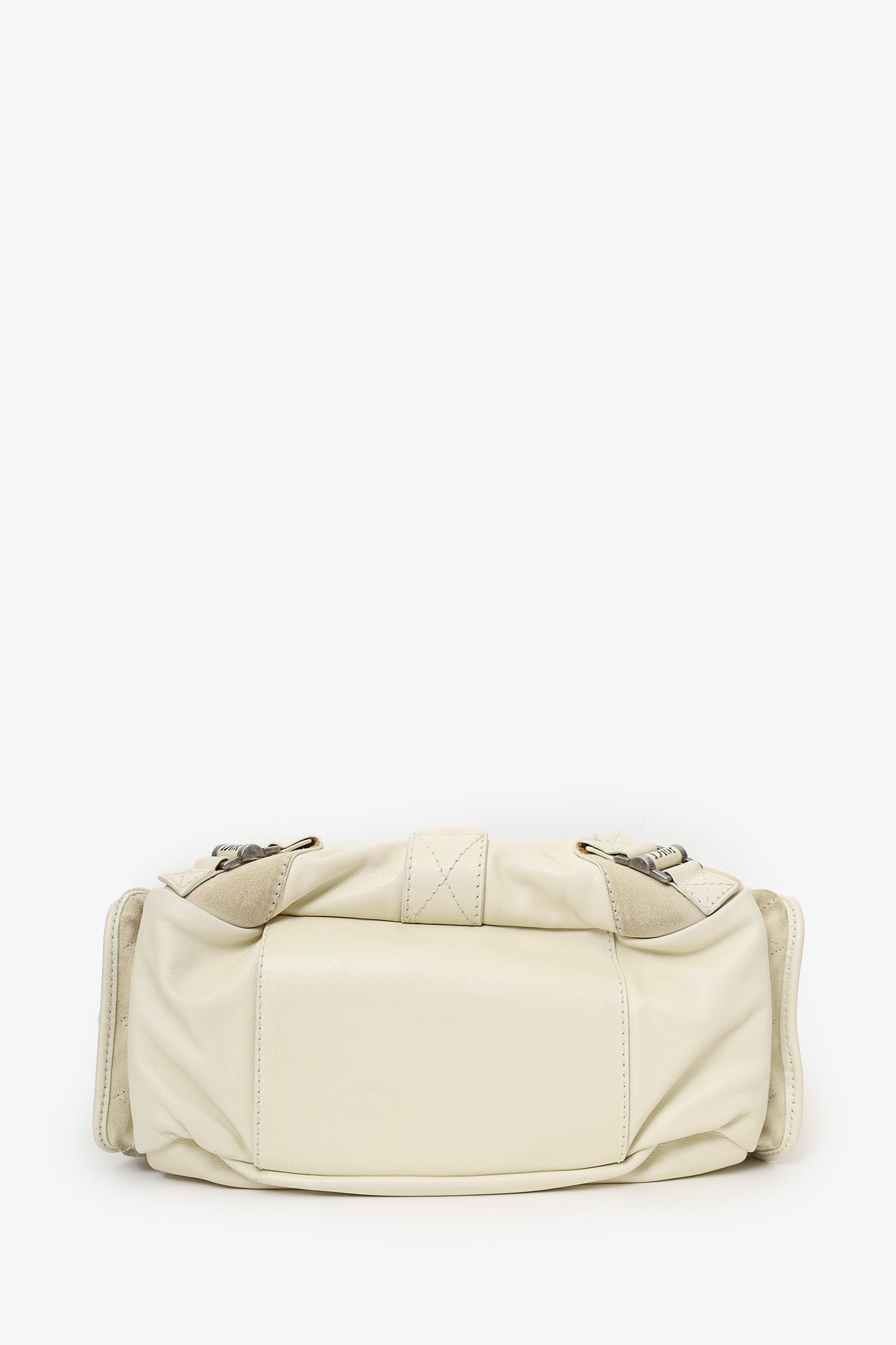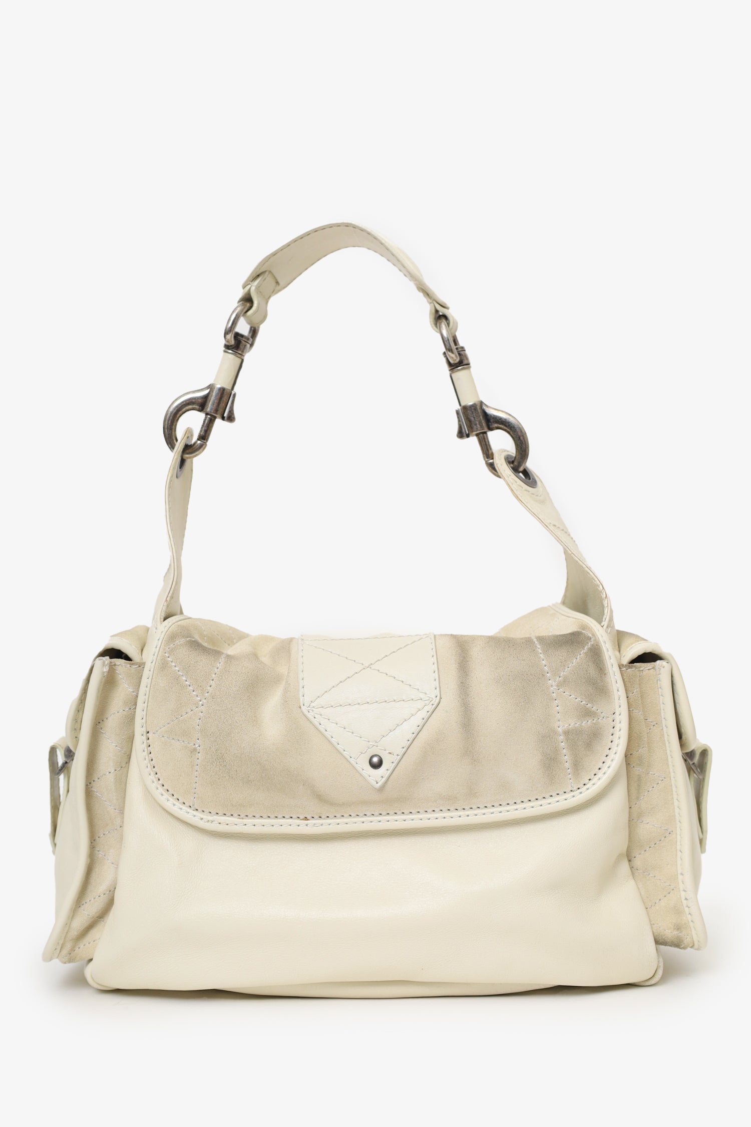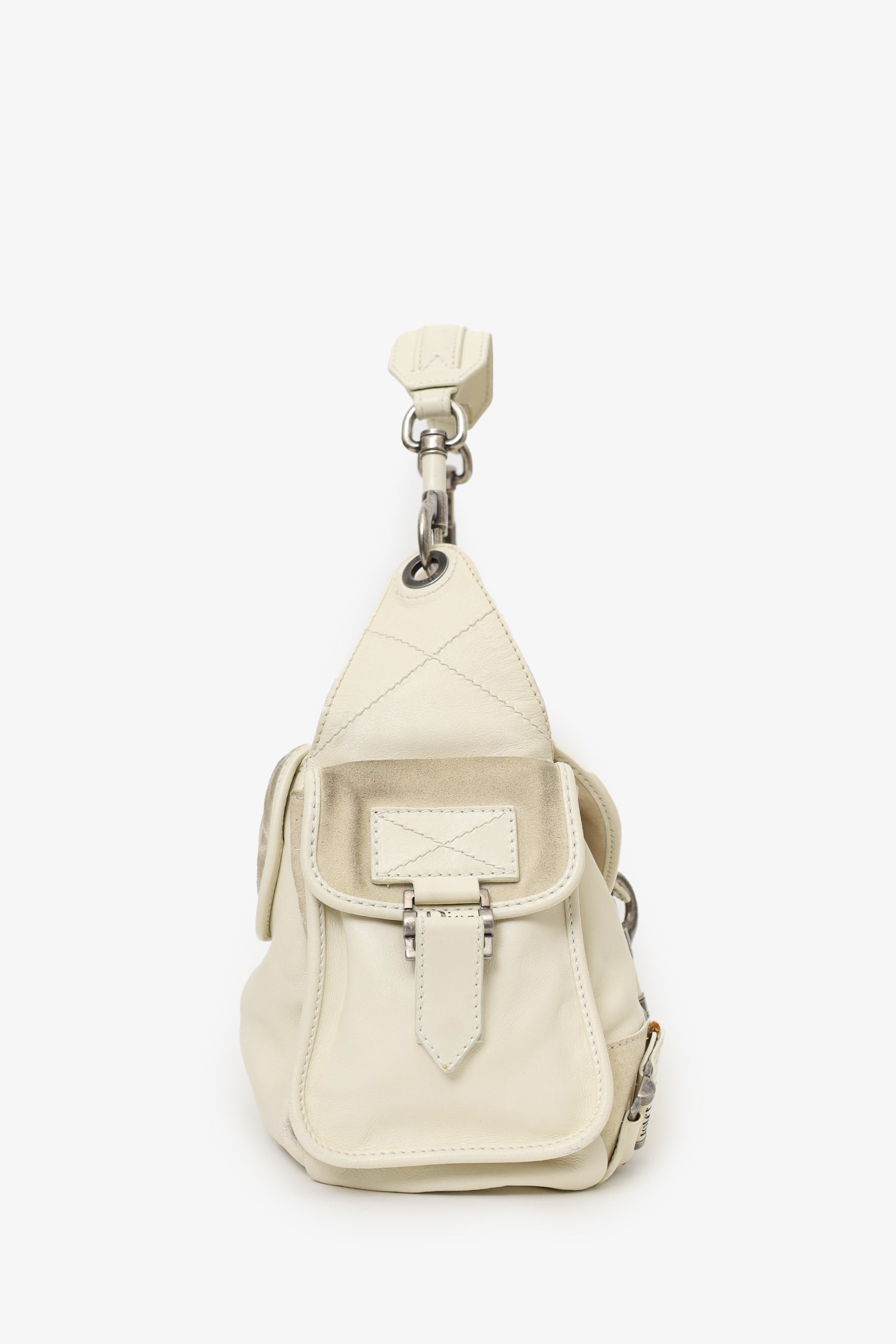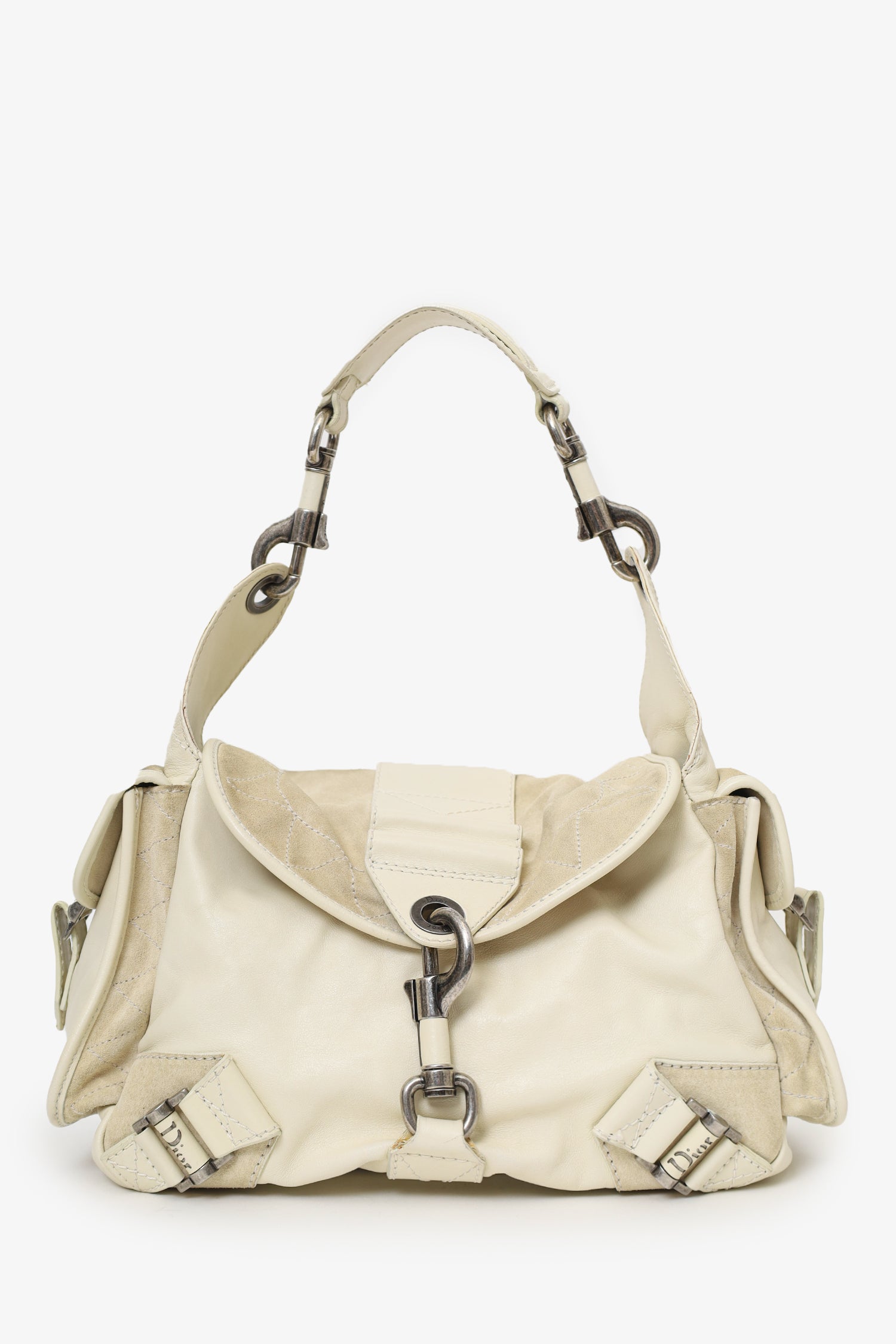 Christian Dior 2006 White Calfskin/Suede Rebelle Shoulder Bag. Front-fold-over flap with lobster clasp closure. Removable shoulder strap with lobster clasp closures. 2 exterior side fold-over-flap pockets. Lined interior with 3 pockets; 2 front slip, and 1 rear zip. Silver-tone hardware. Tonal stitching.