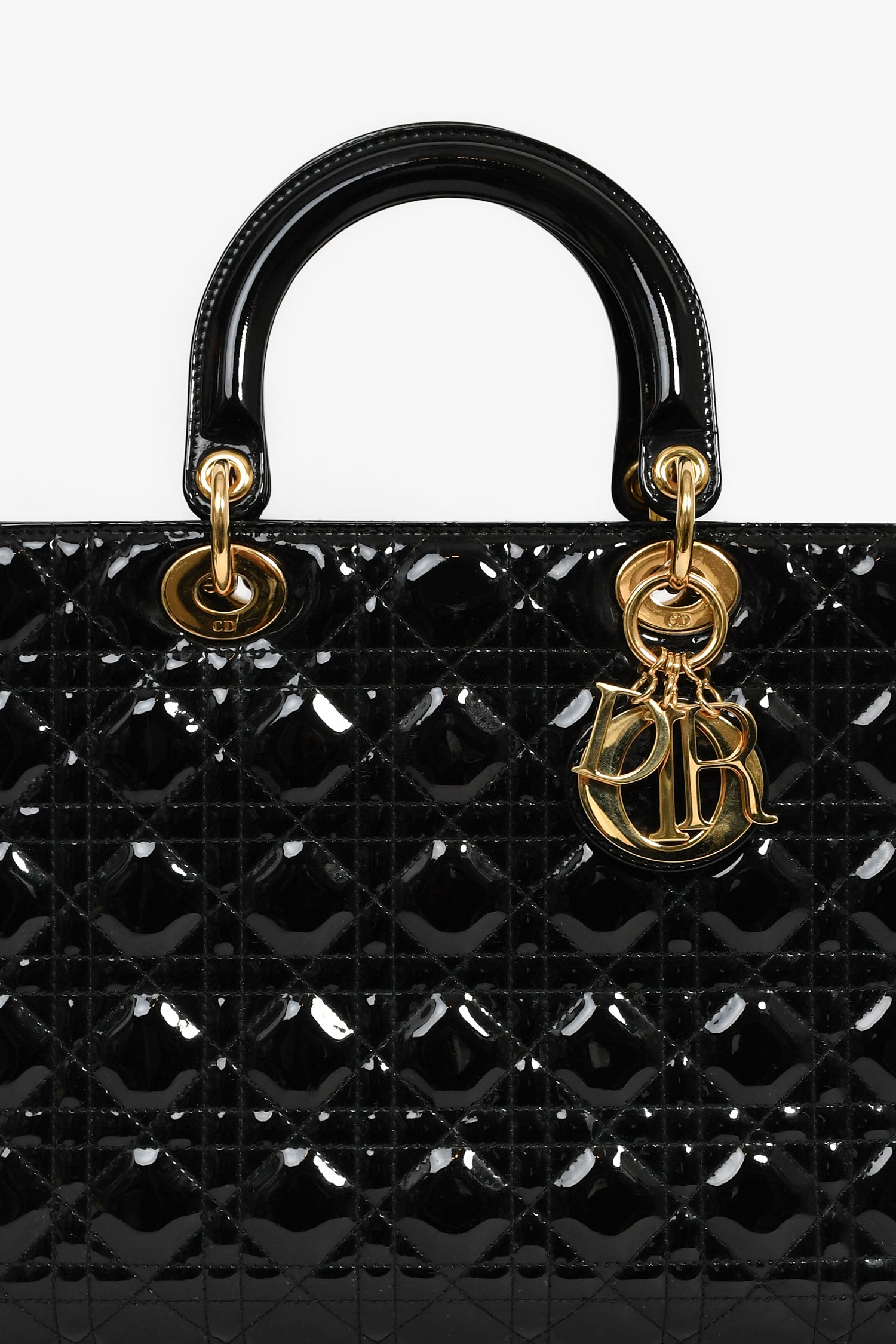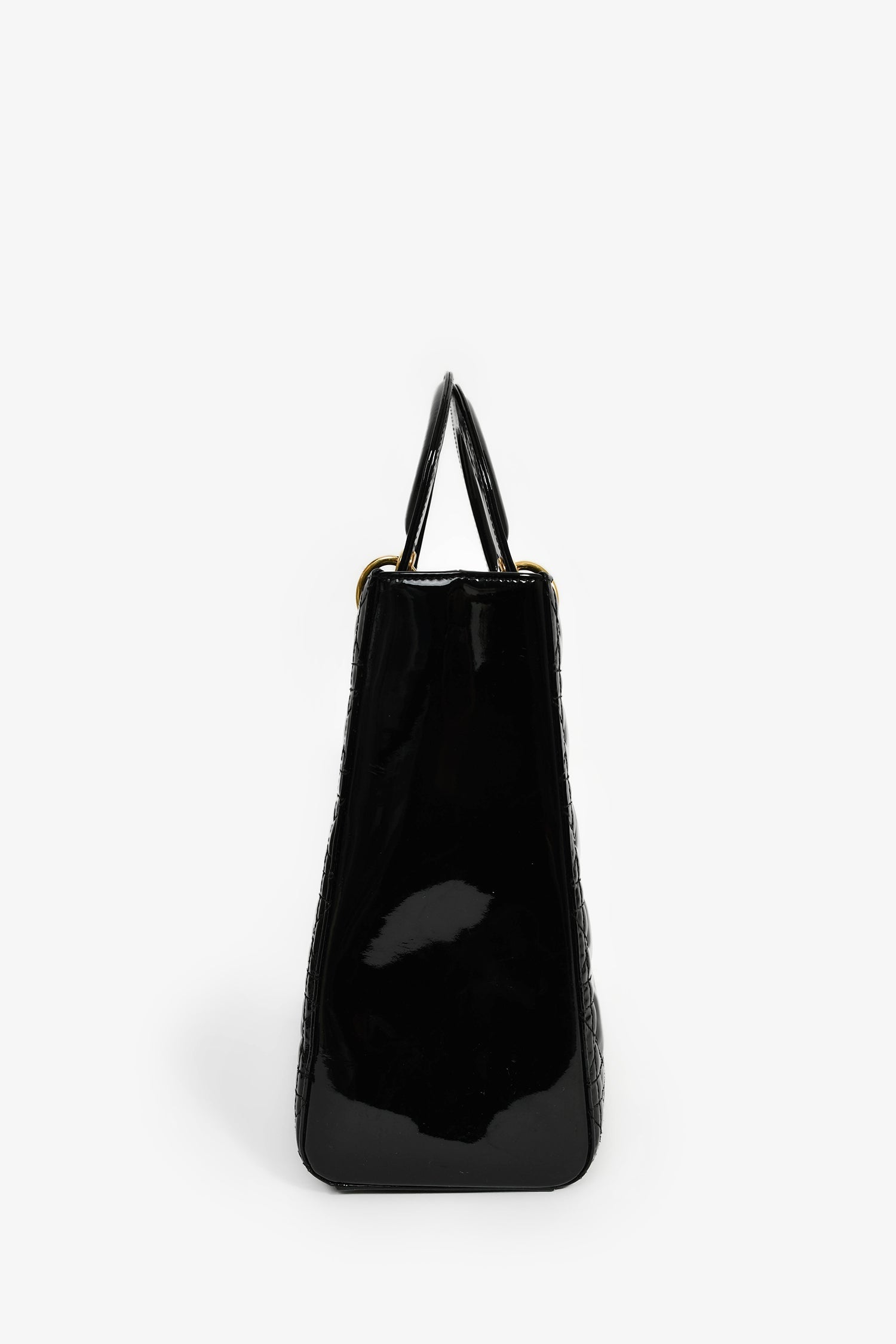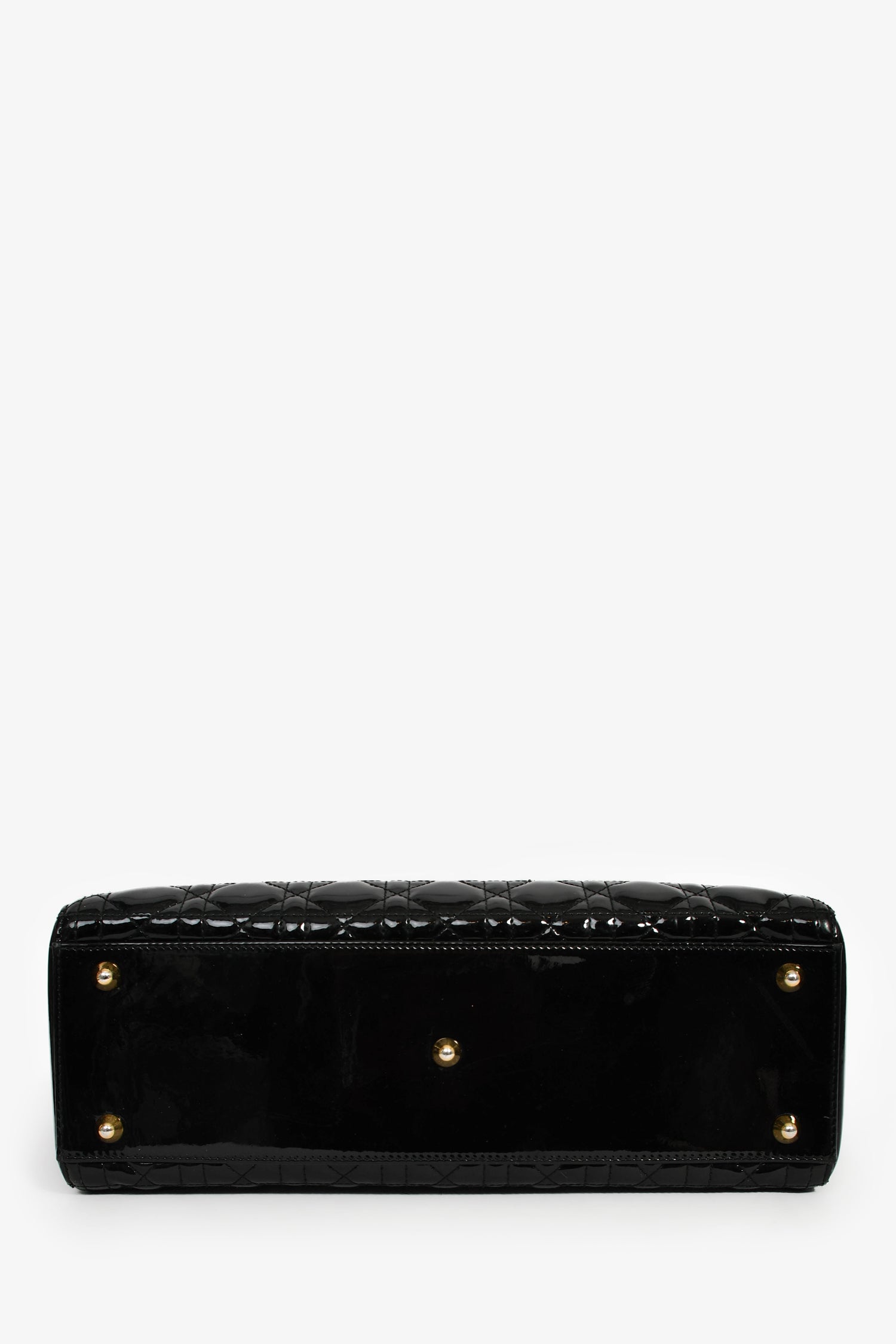 Christian Dior 2015 Black Patent Leather Large Lady Dior. Concealed top zip. Dual top handles. Attachable shoulder strap. Lined interior with 1 zip compartment. Gold-tone hardware. Tonal stitching.