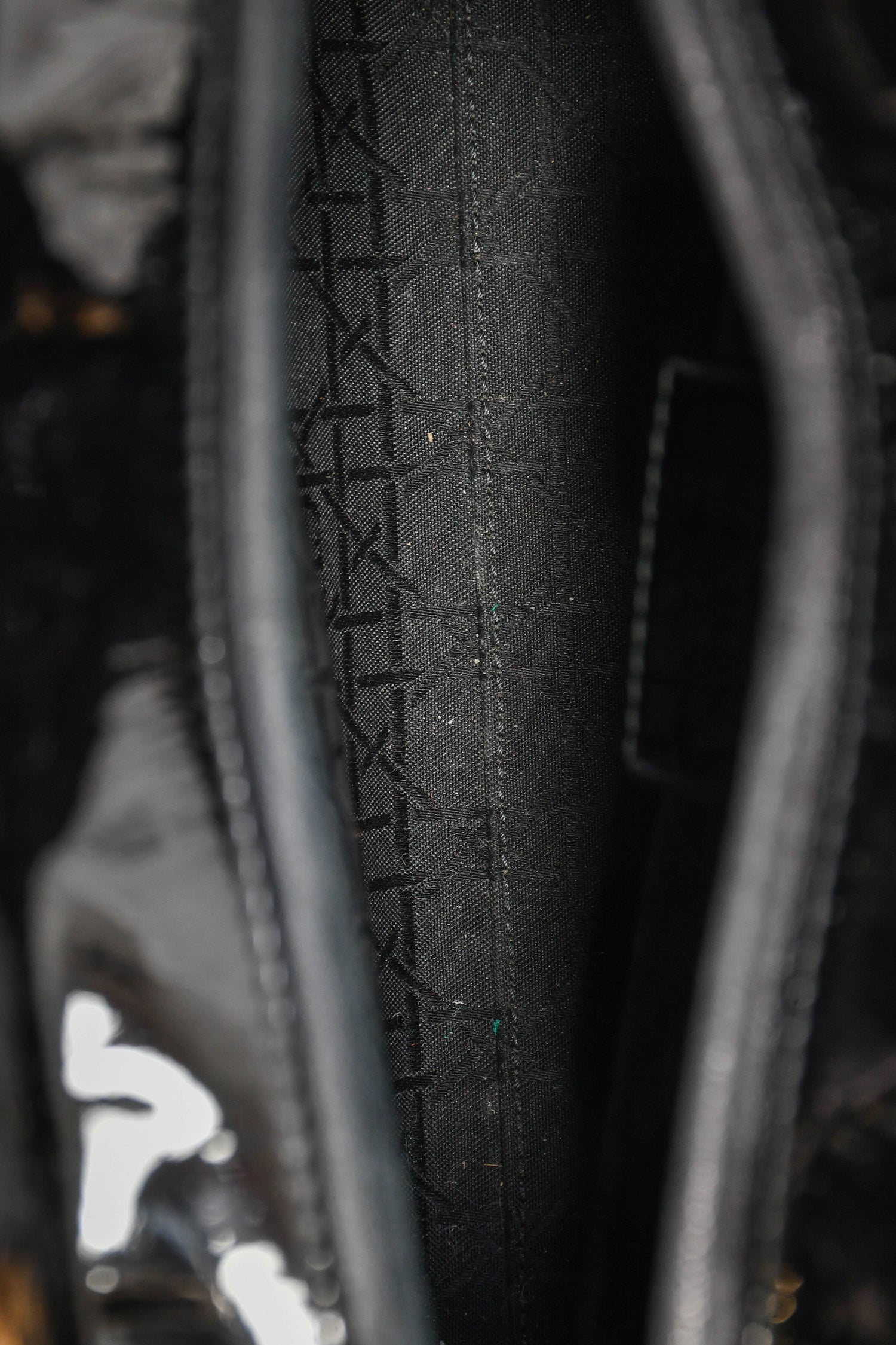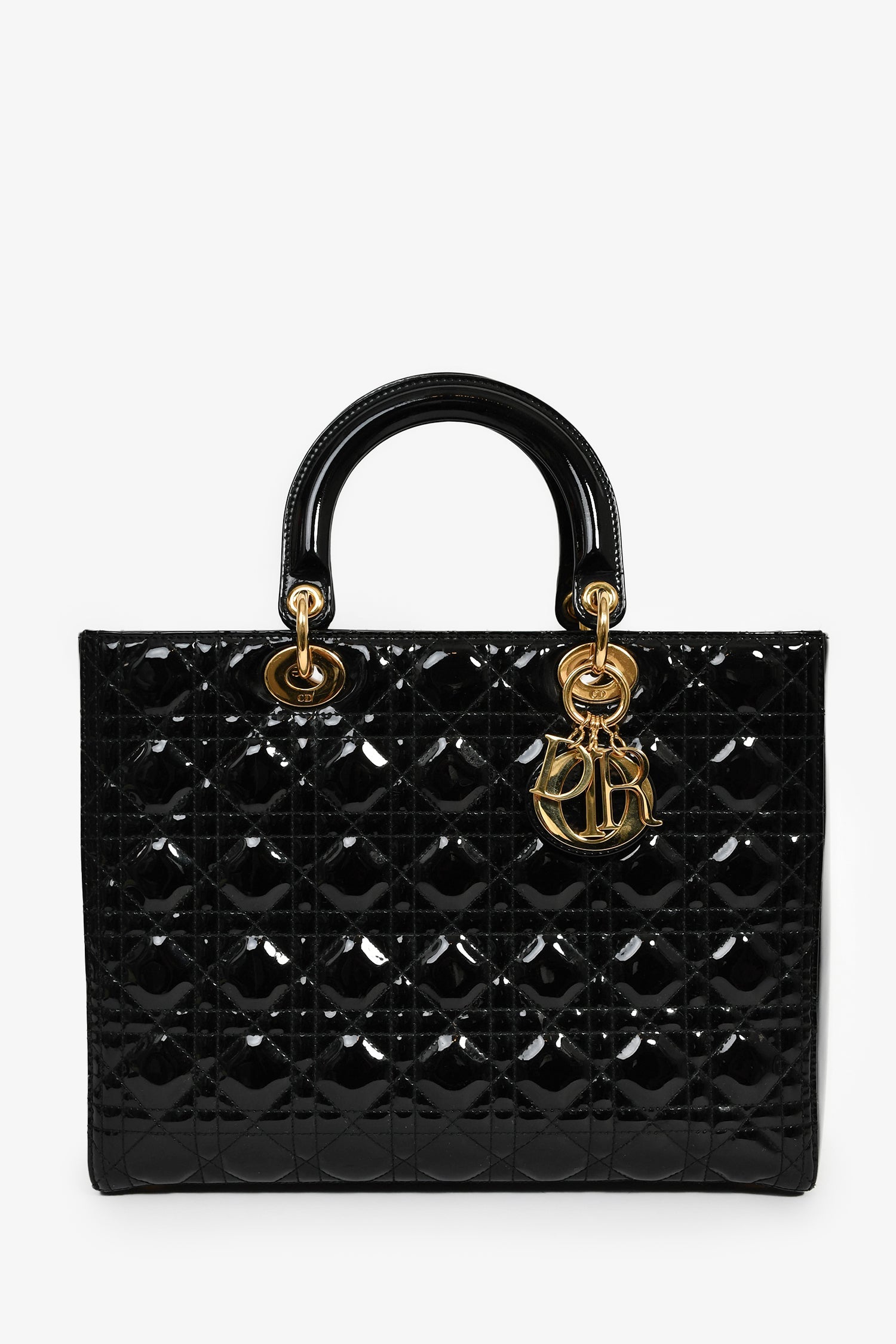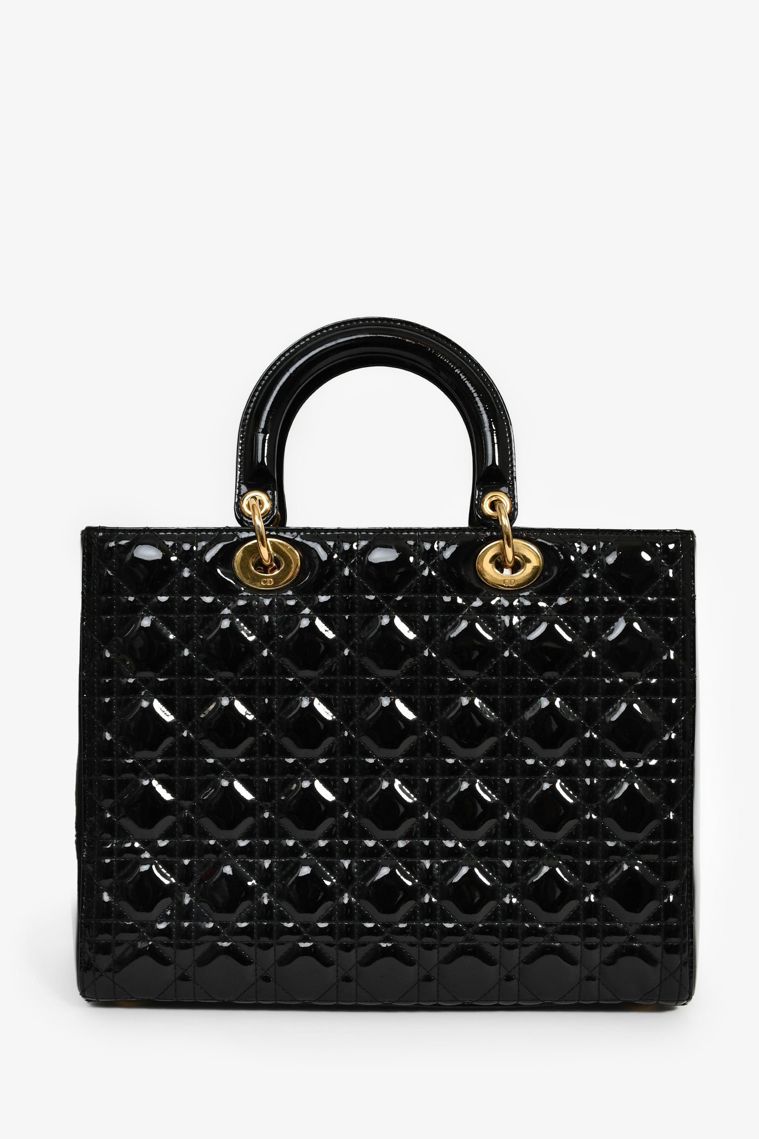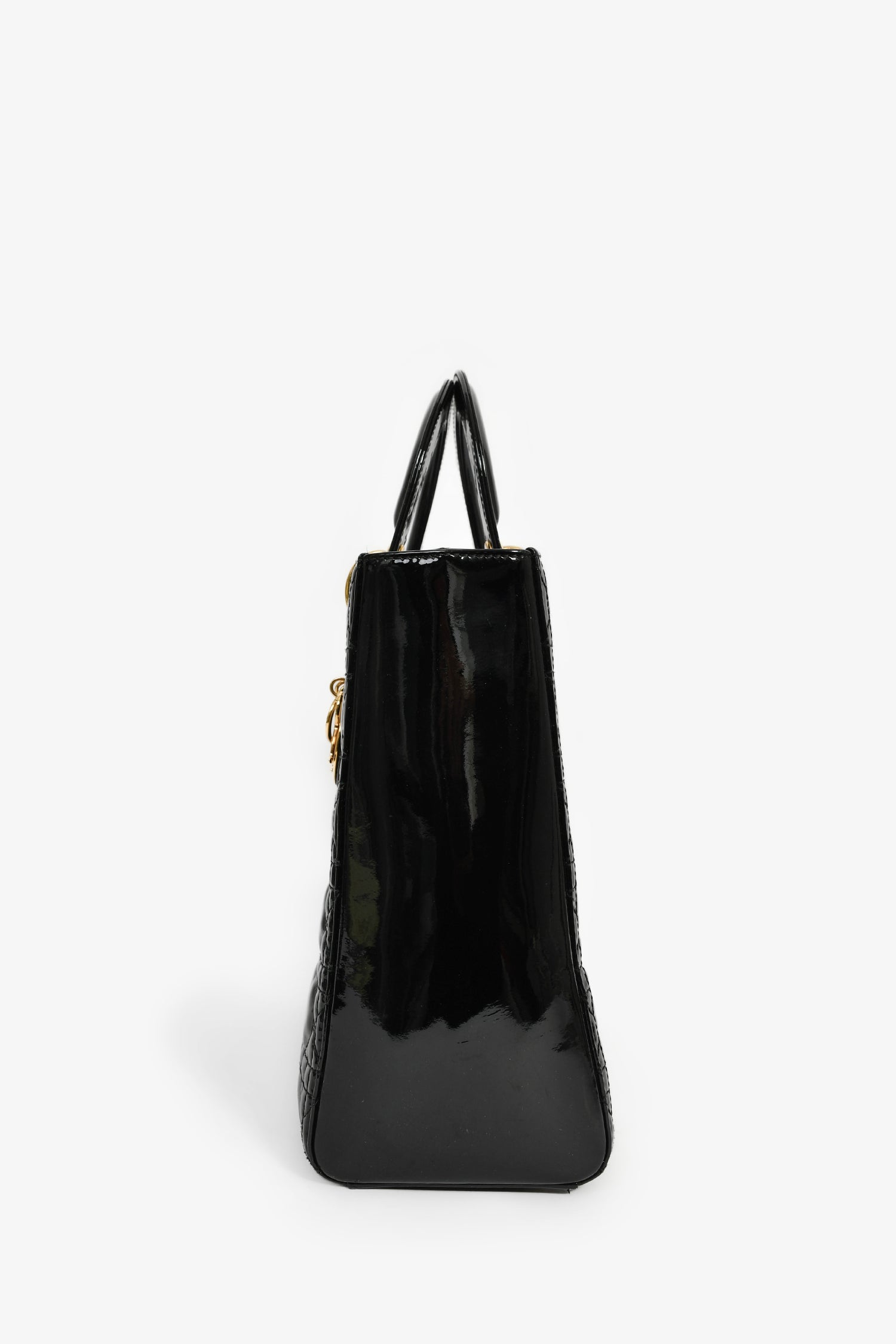 Christian Dior 2015 Black Patent Leather Large Lady Dior. Concealed top zip. Dual top handles. Attachable shoulder strap. Lined interior with 1 zip compartment. Gold-tone hardware. Tonal stitching.