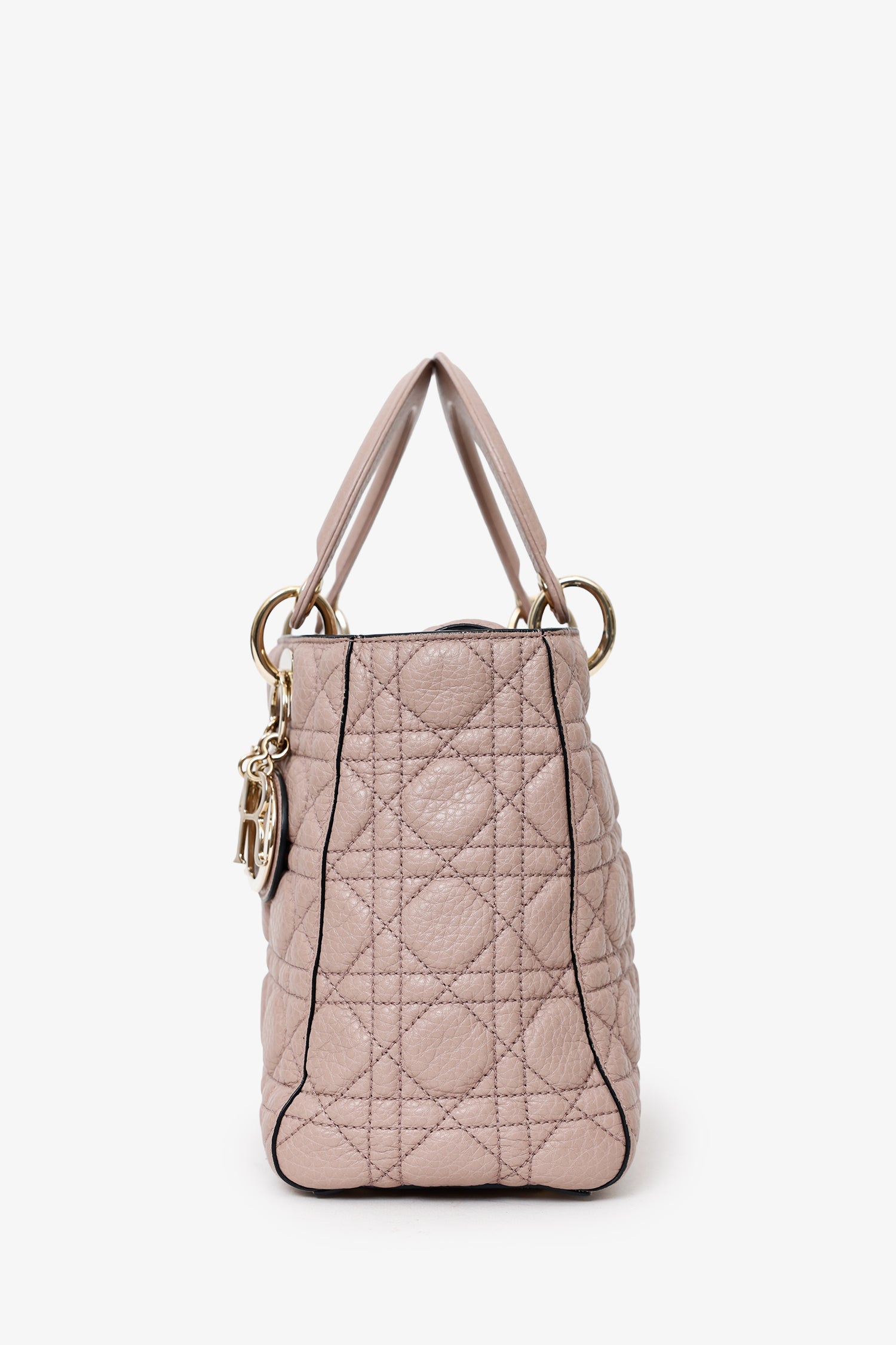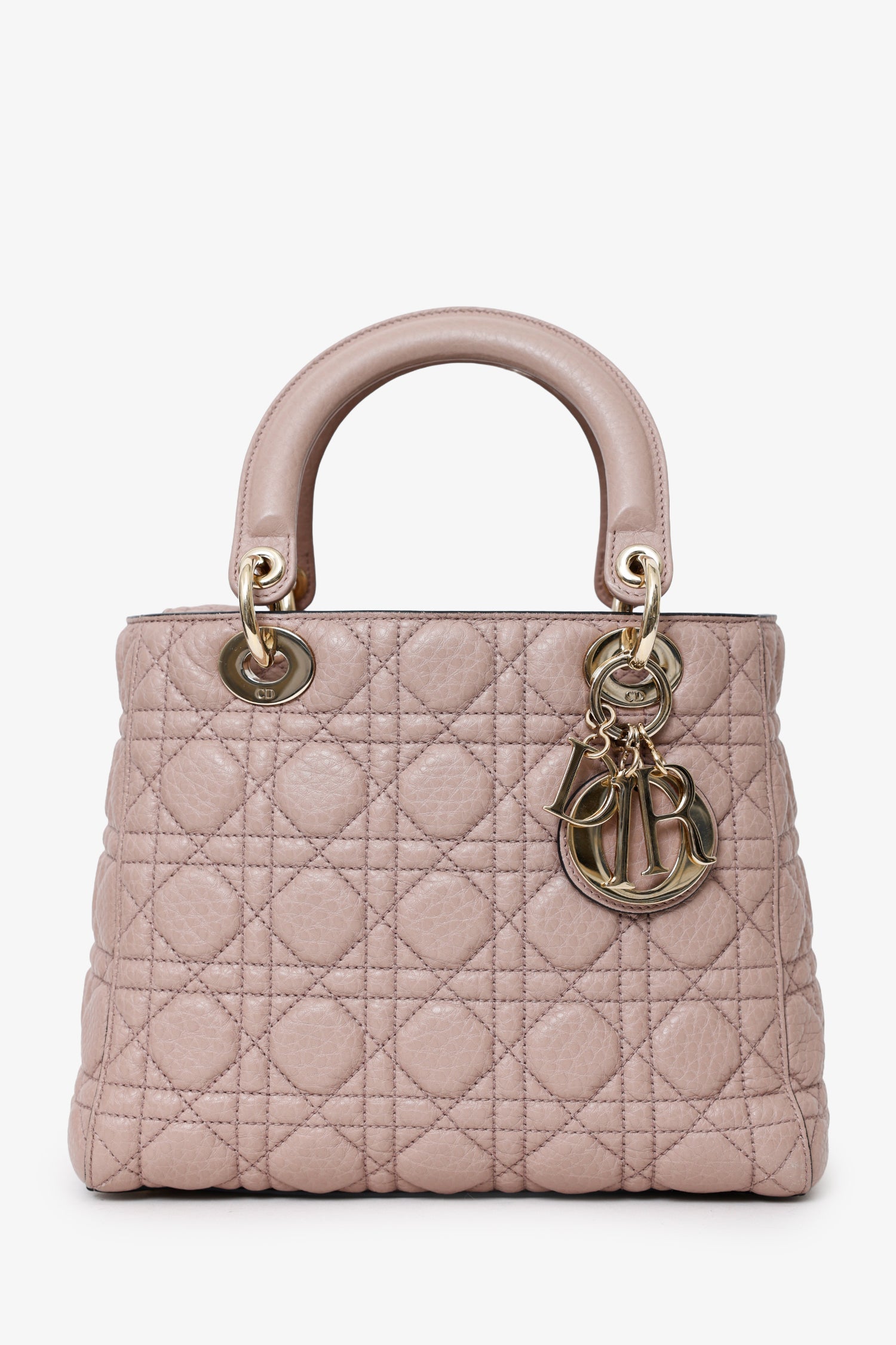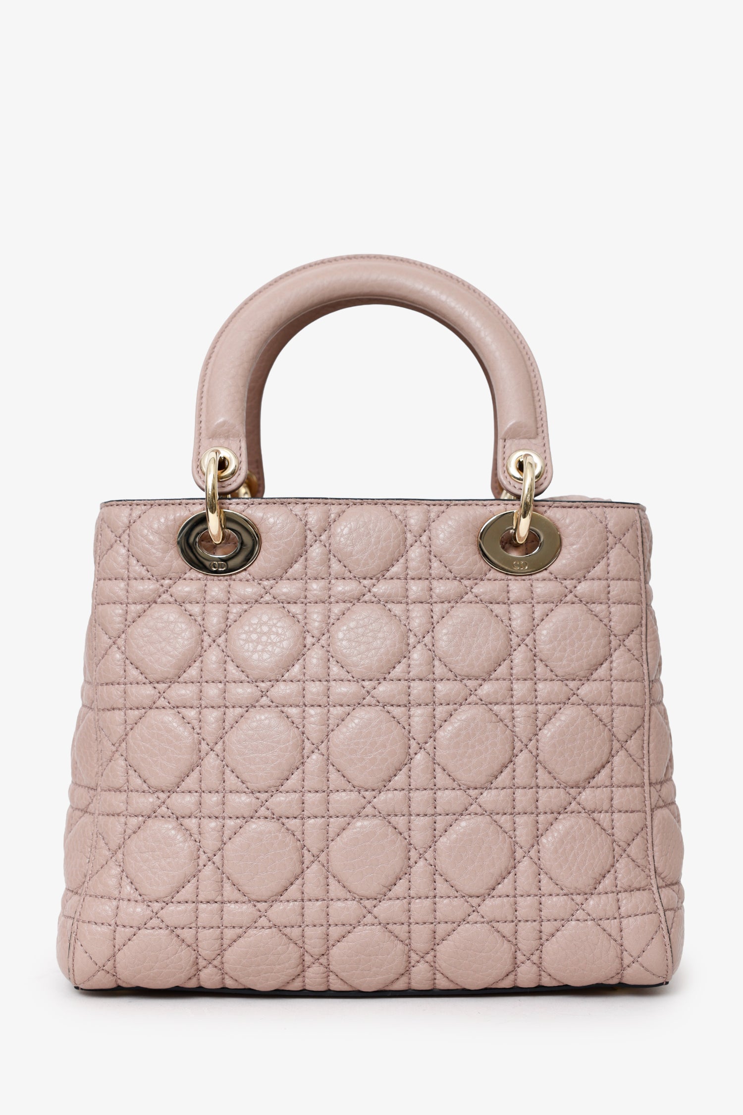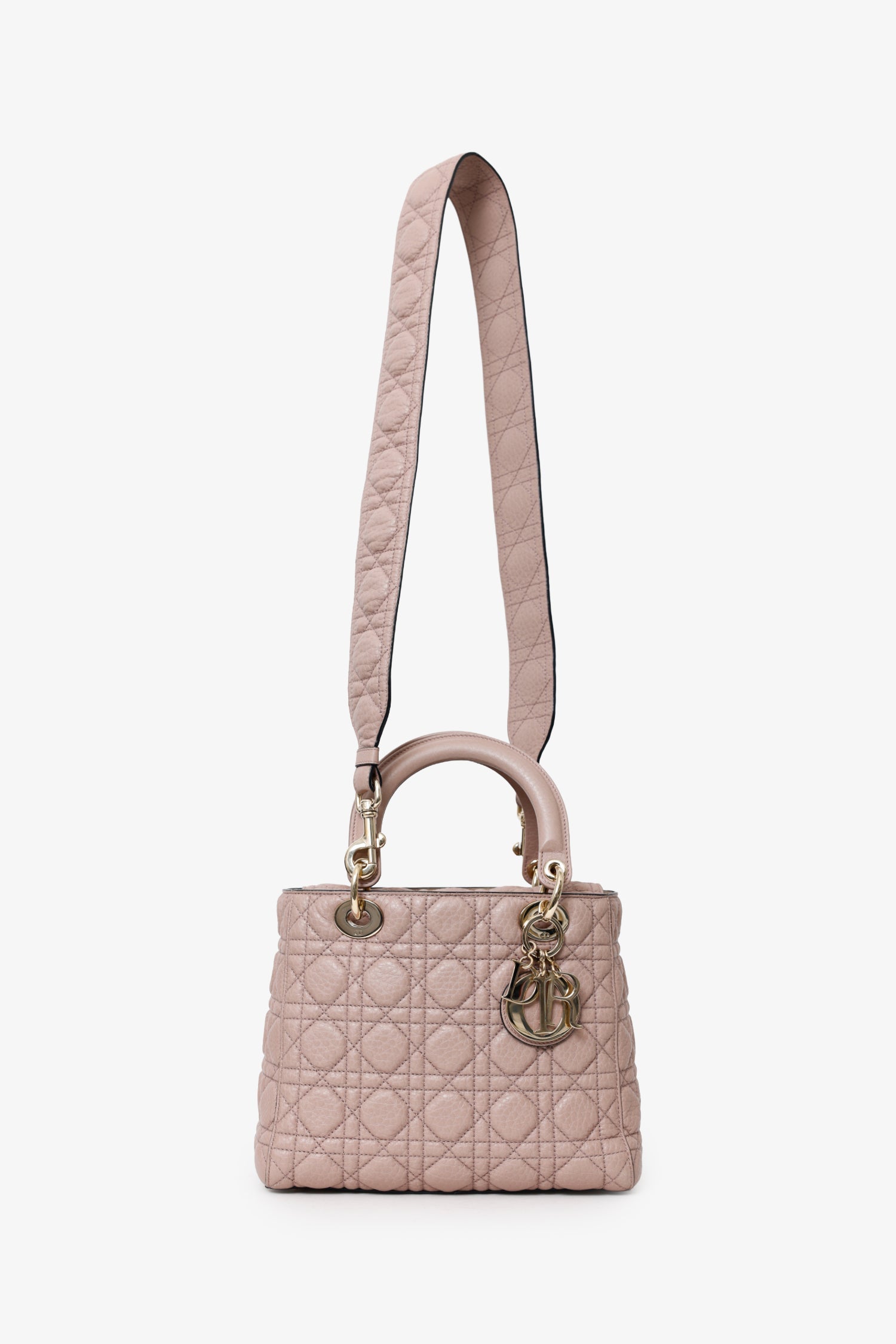 Christian Dior 2017 Powder Pink Supple Medium Lady Dior with Strap. Top interior fold-over flap. Twin top handles. Removable crossbody straps with lobster clasp closure. Protective base studs. Lined interior. 2 interior pockets; 1 interior wall zip pocket and 1 rear wall slip pocket. Gold-tone hardware. Tonal stitching.