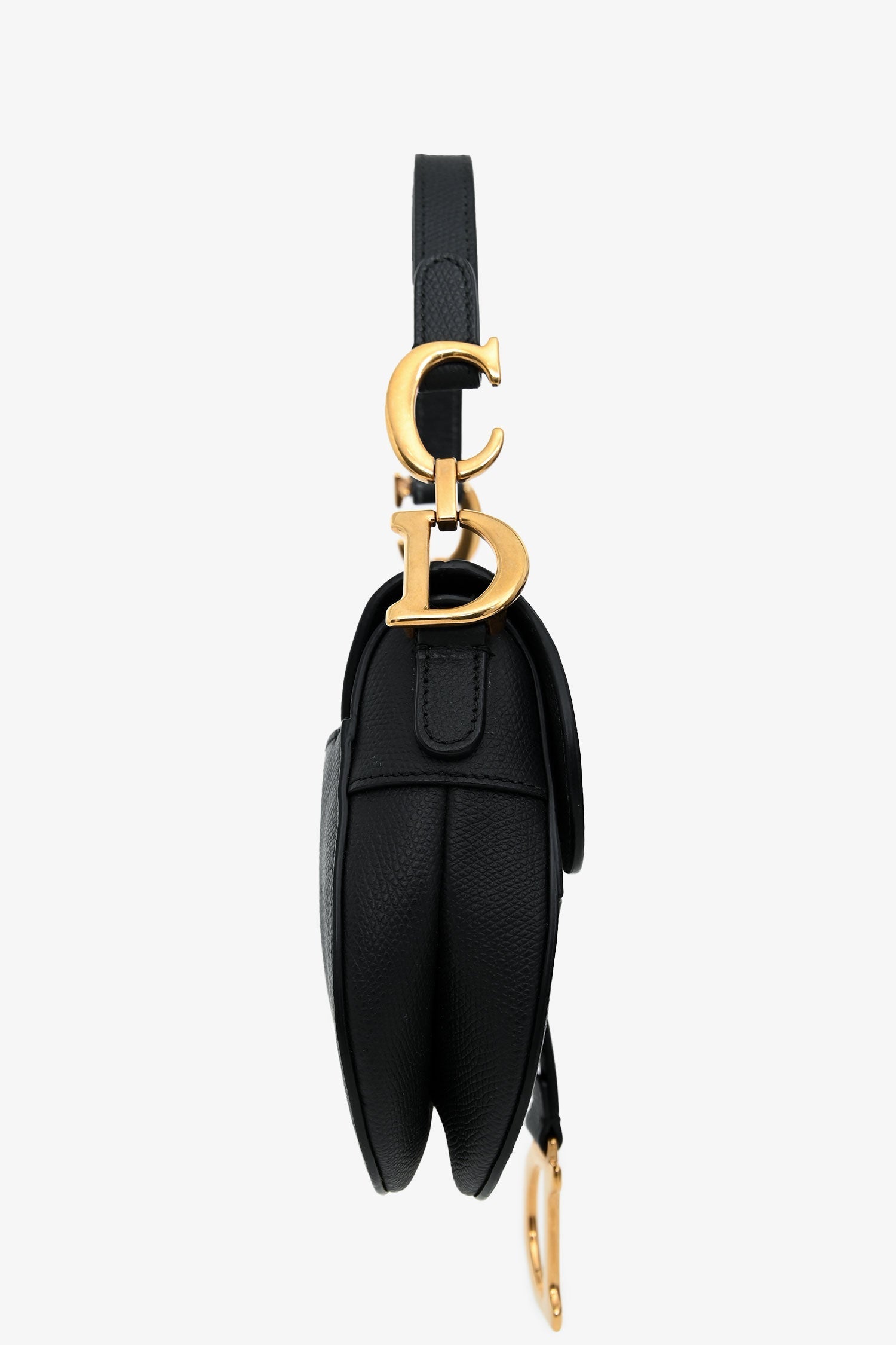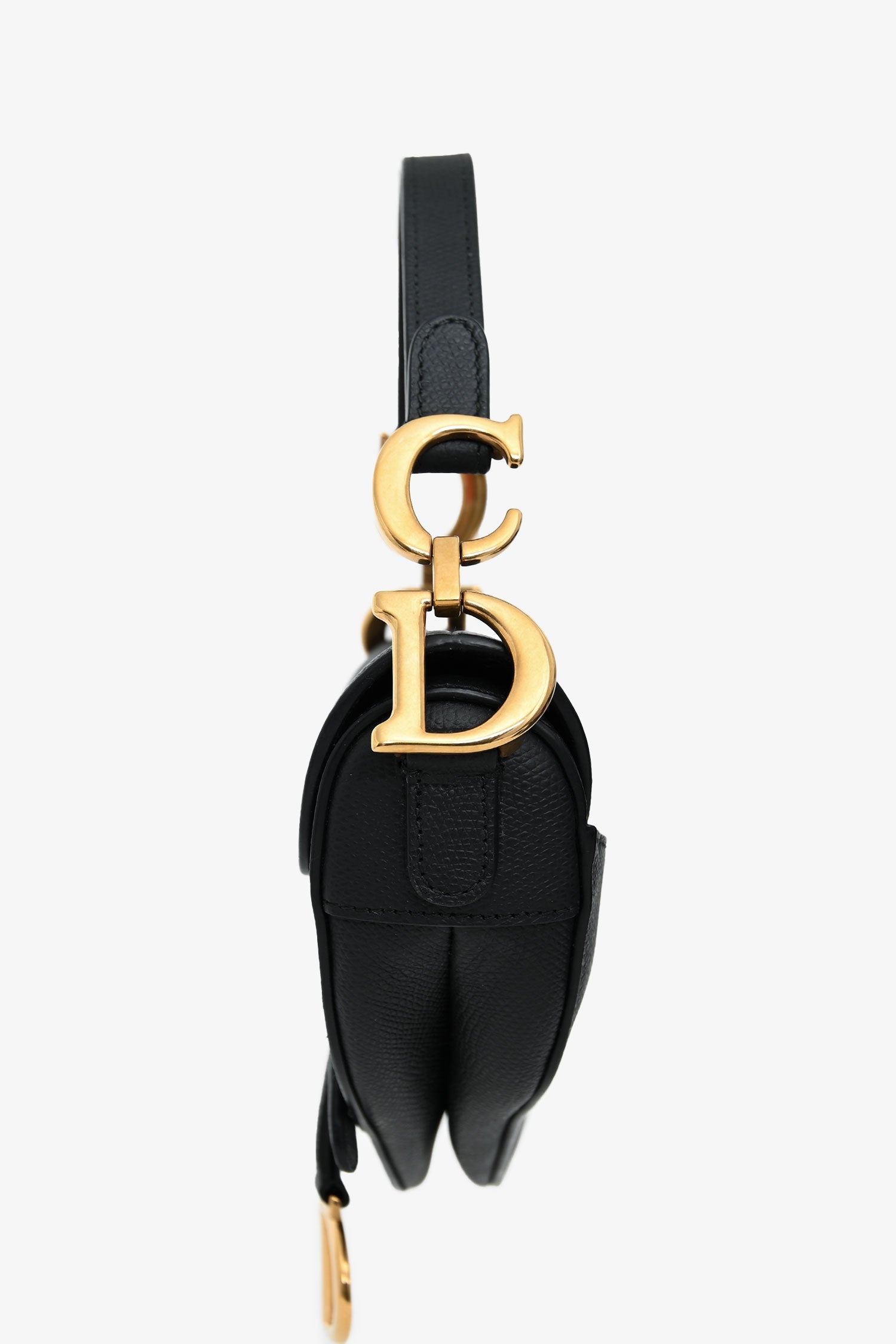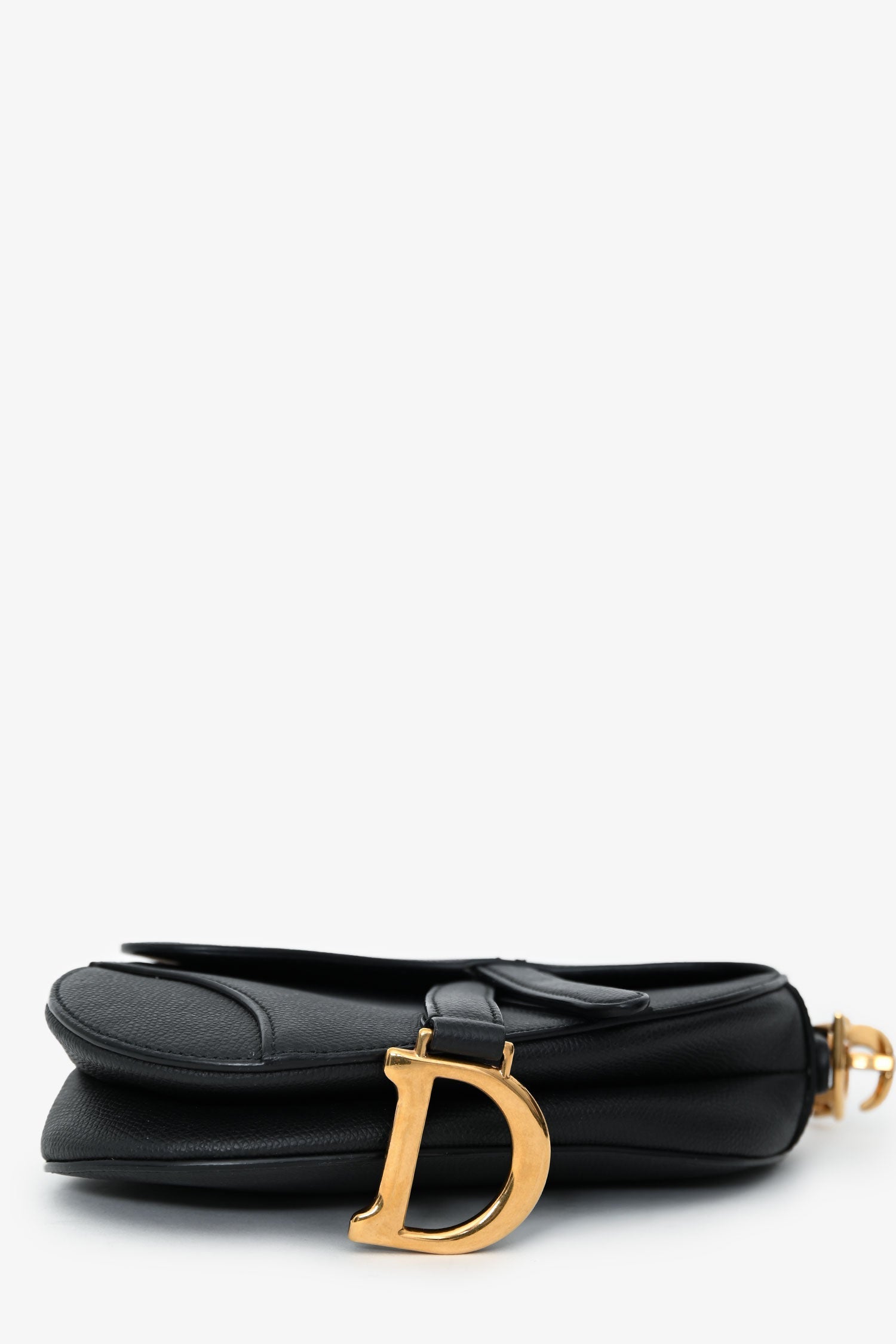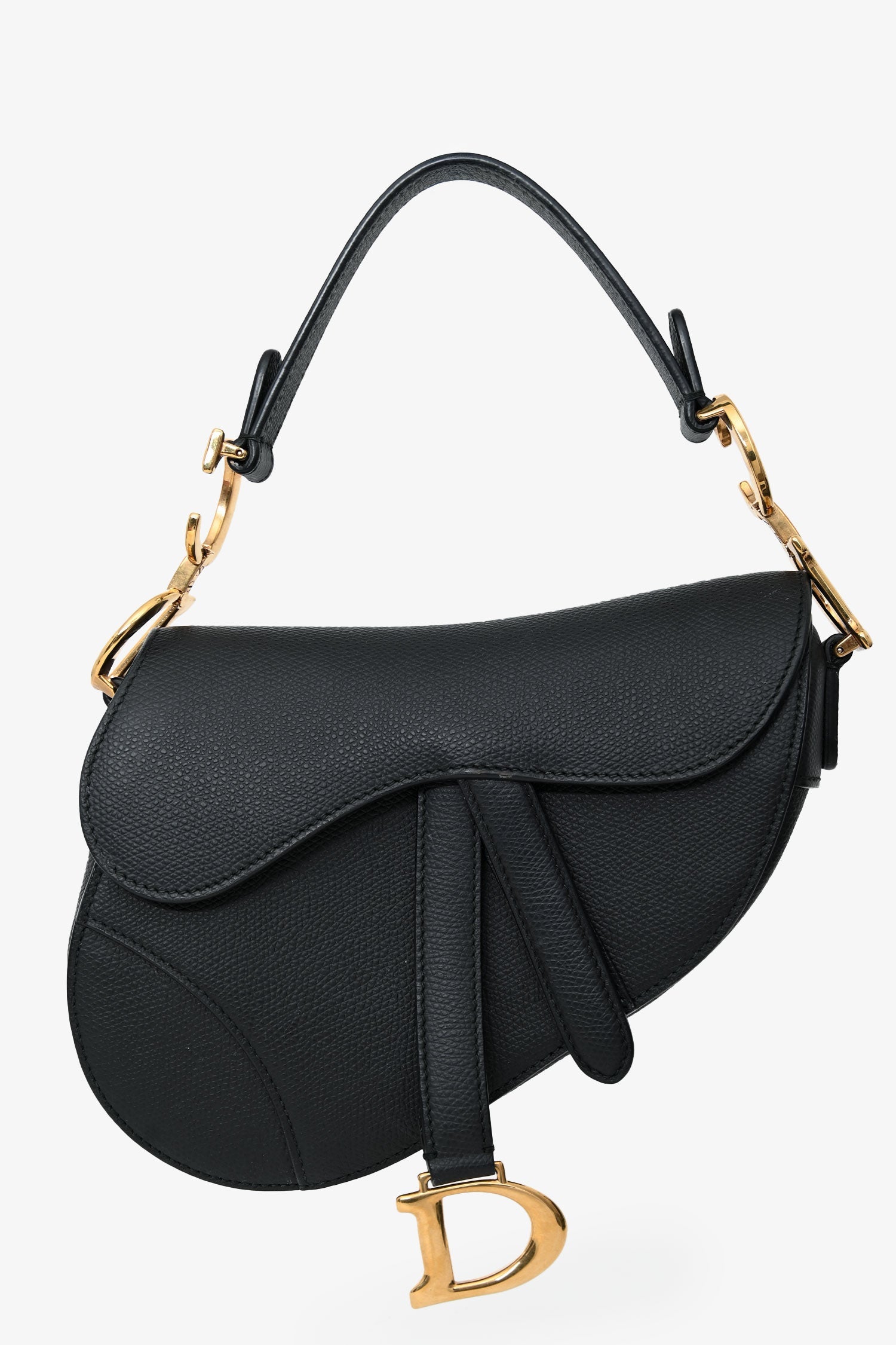 Christian Dior 2018 Black Leather Mini Saddle Top Handle. Front fold-over flap with magnetic closure. Top handle. Single interior compartment. Rear slip wall pocket. Suede-lined. Gold-tone hardware. Tonal stitching.