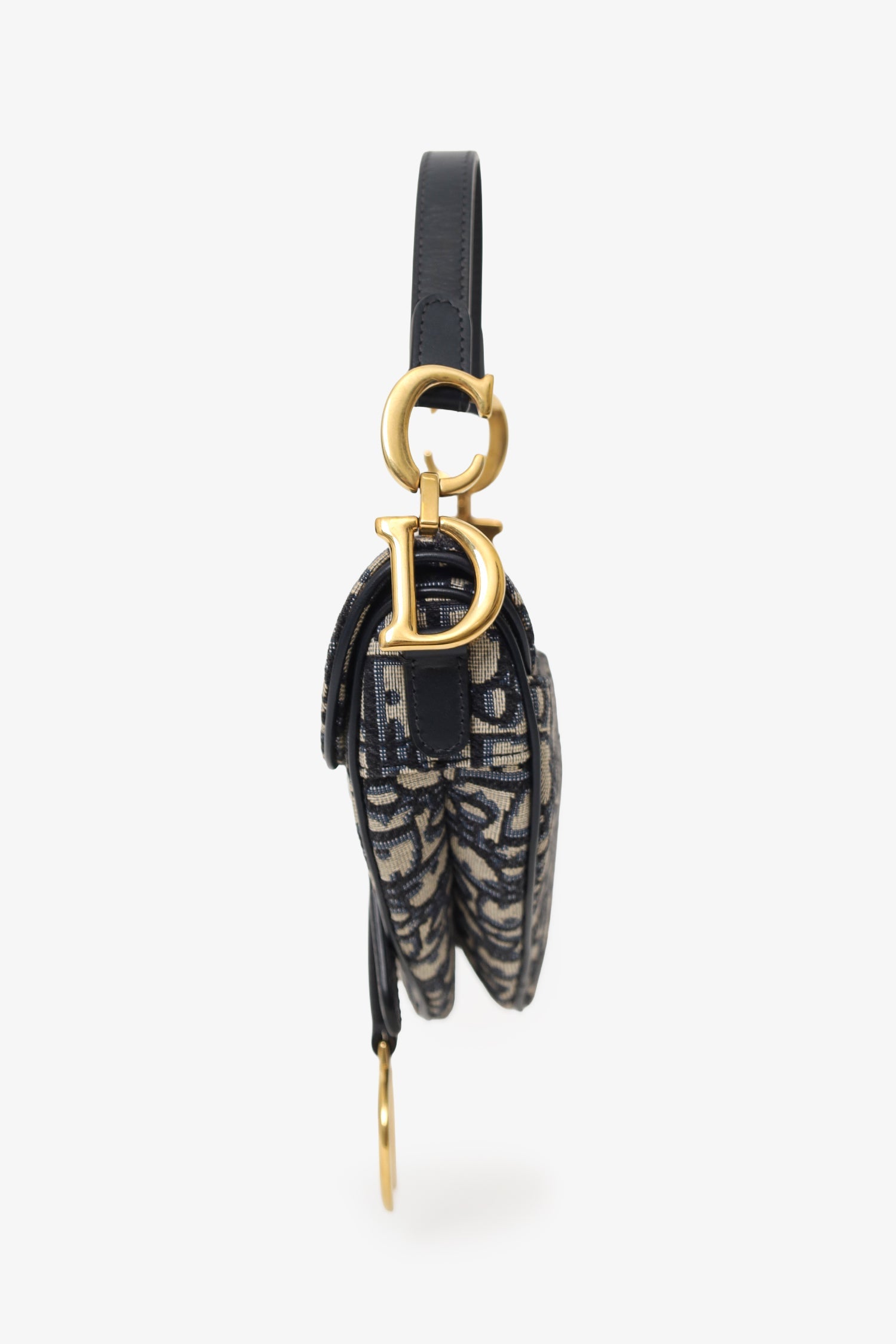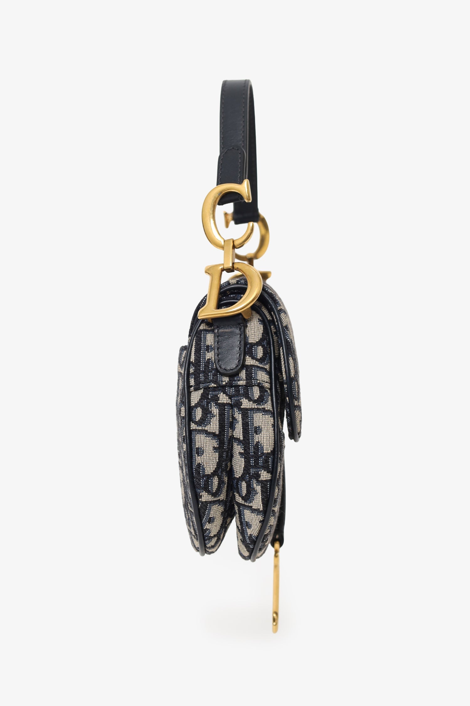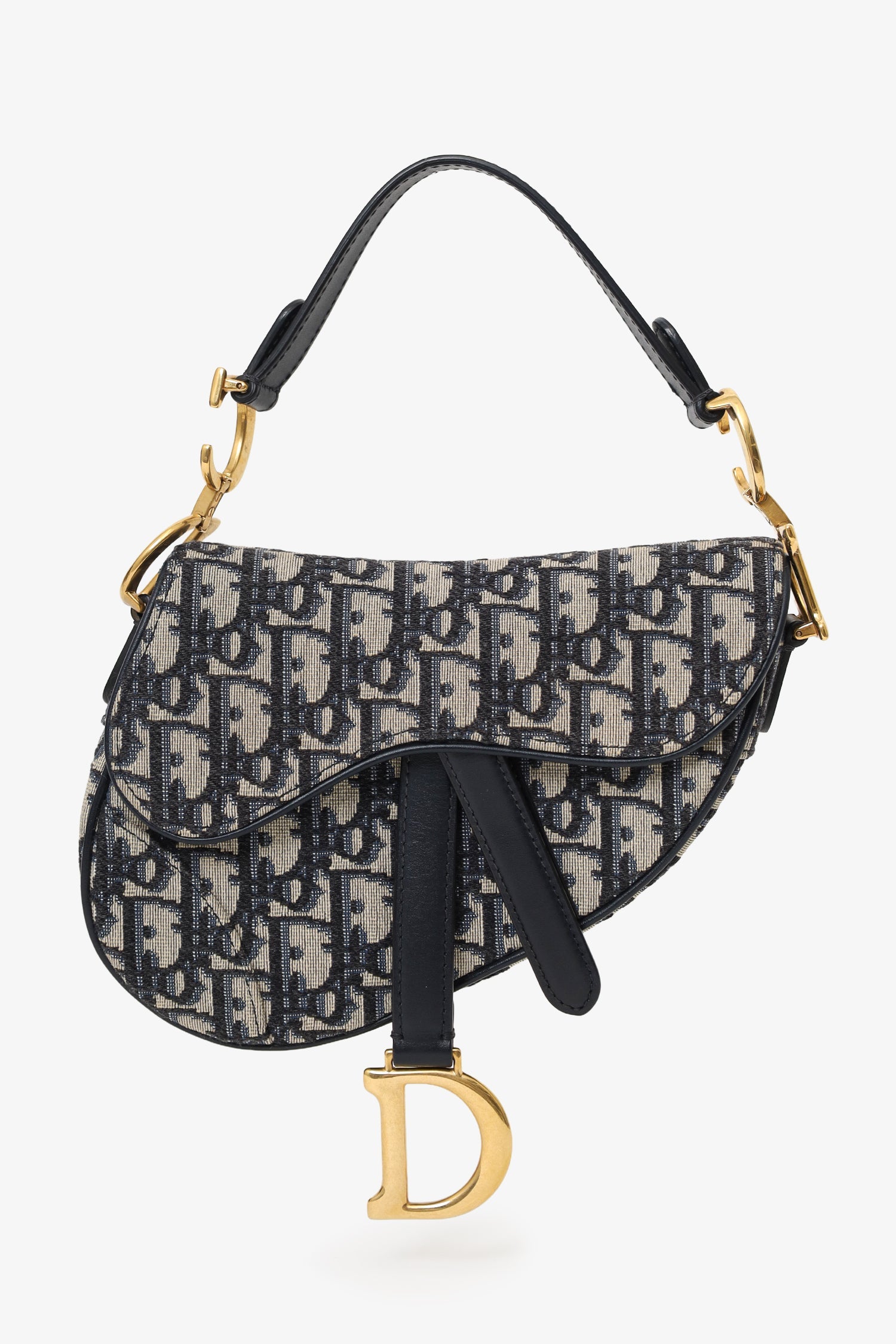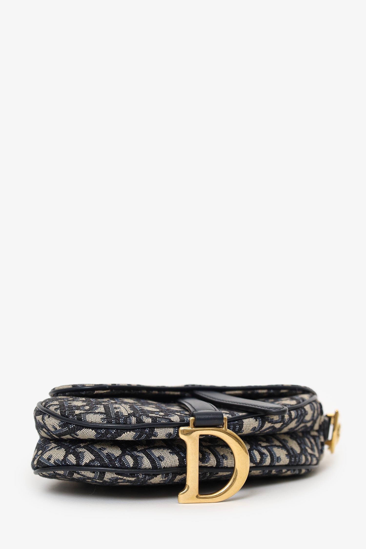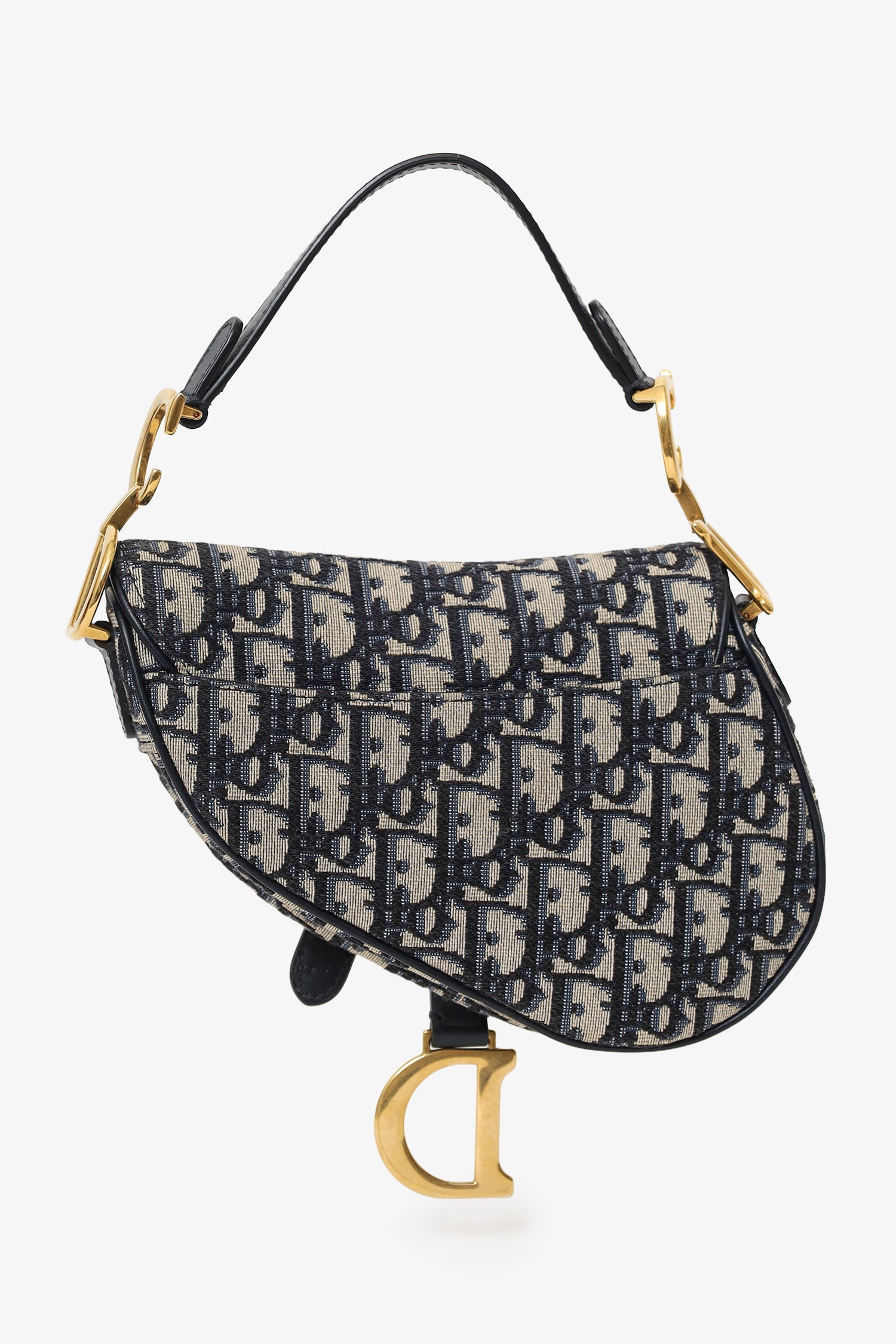 Christian Dior 2018 Blue Oblique Jacquard Mini Saddle Bag Front fold-flap with magnetic closure. Leather top strap with decorative logo hardware. Single exterior rear slip pocket. Open canvas-lined interior. Gold-silver-tone hardware. Tonal stitching.