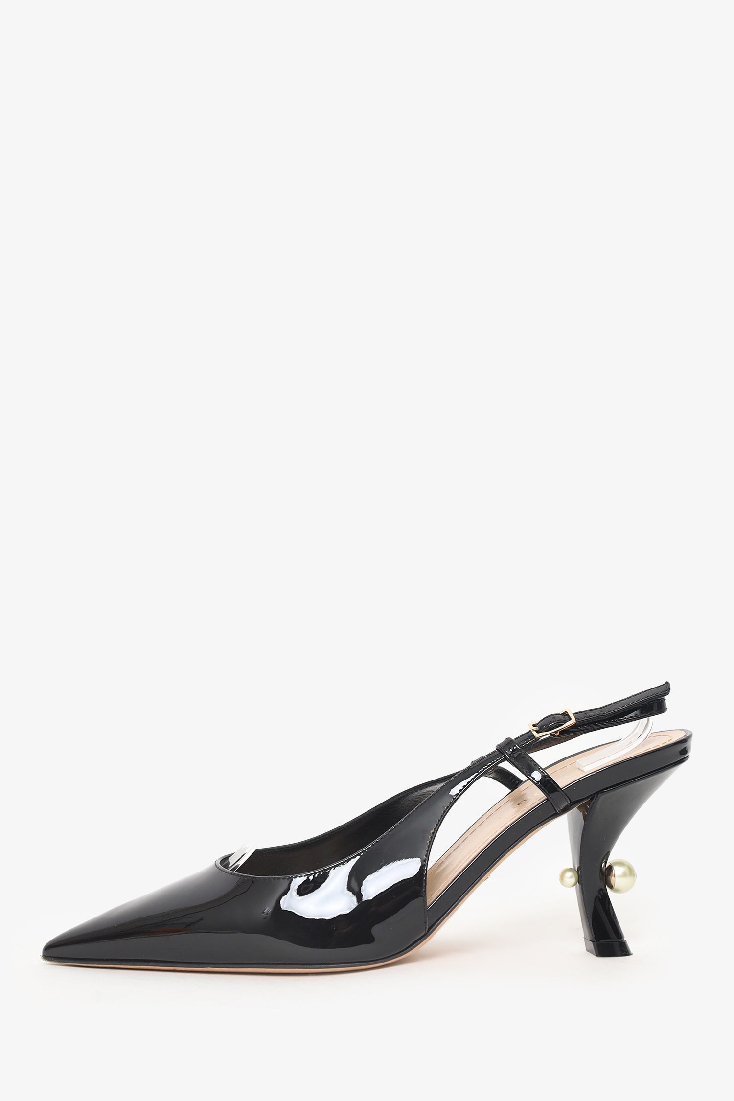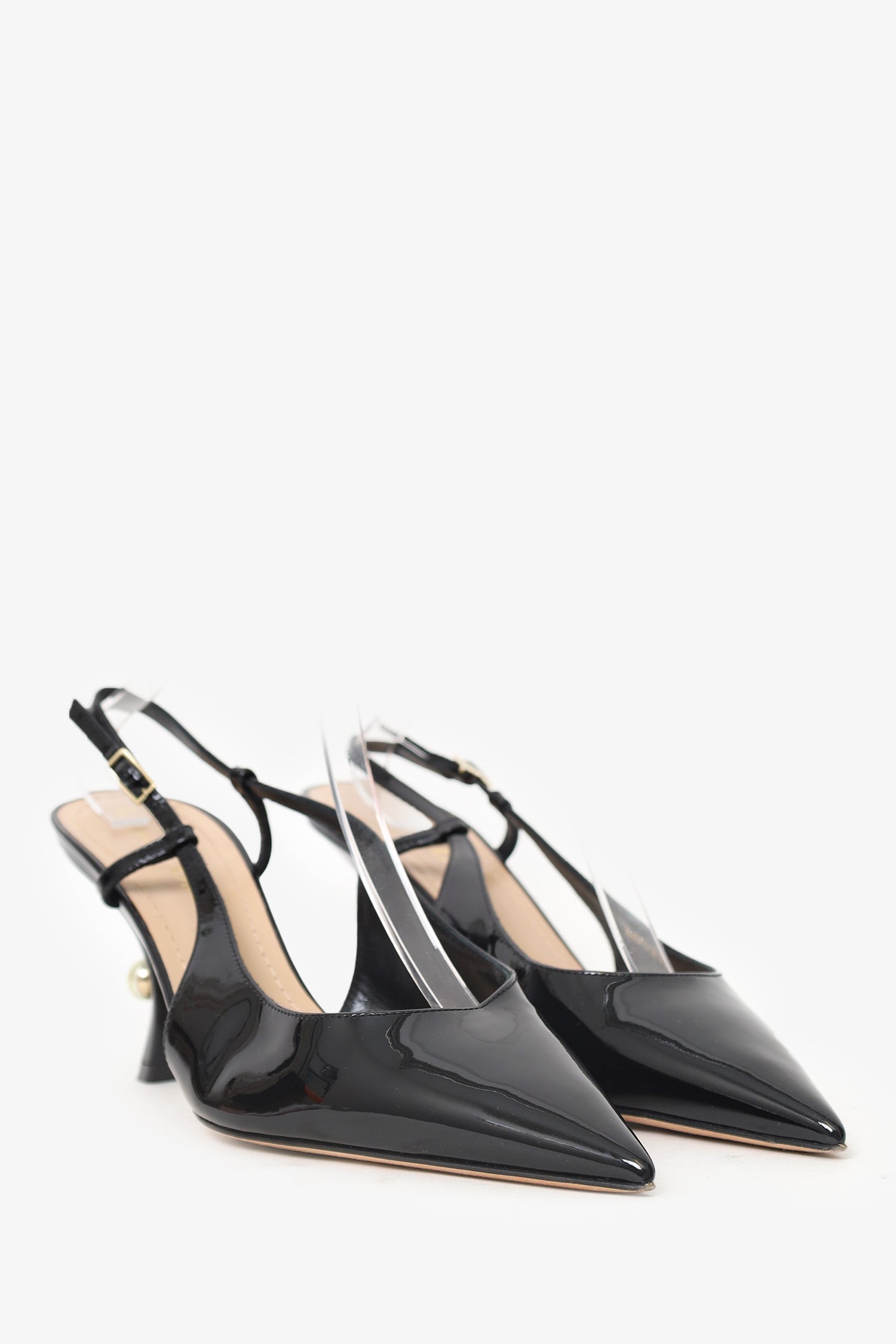 Christian Dior Black Patent Leather Tribales Pointed Sling Back Heels. Slip-on. Pointed-toe. Slingback with adjustable buckle closure. Pearl detail at heel. Gold-tone hardware. Tonal stitching.