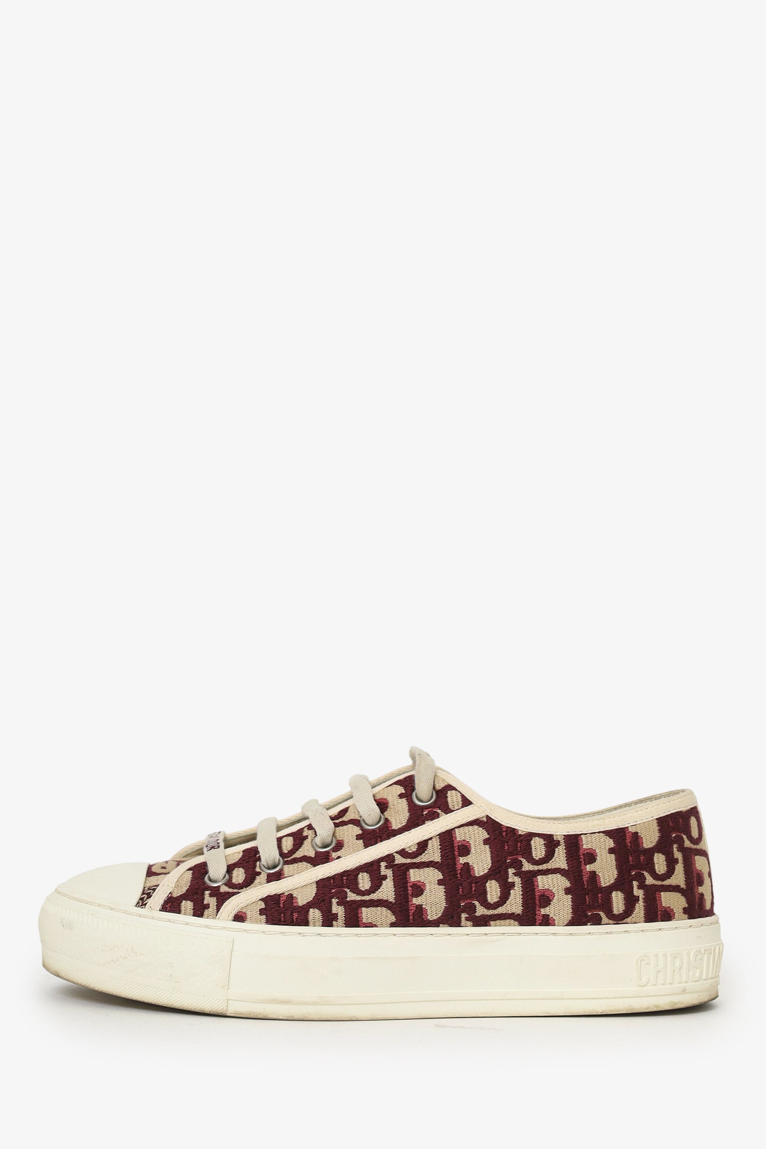Christian Dior Burgundy Walk'n Dior Low-Top Sneaker. Slip-on. Round toe. Front lace-up closure. Palladium-tone hardware. Tonal stitching.