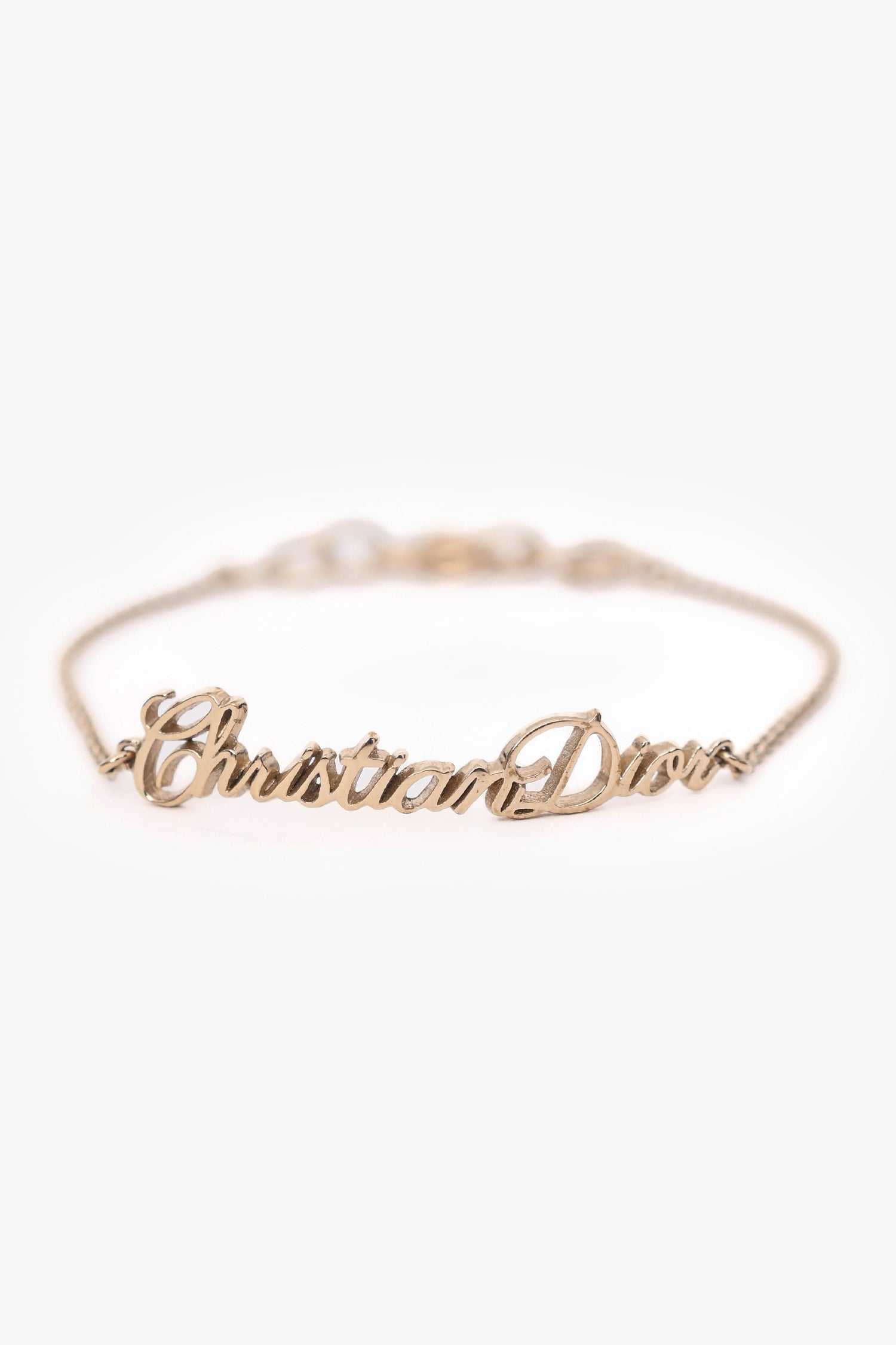 Christian Dior Gold Tone Logo Bracelet. Spring ring closure.