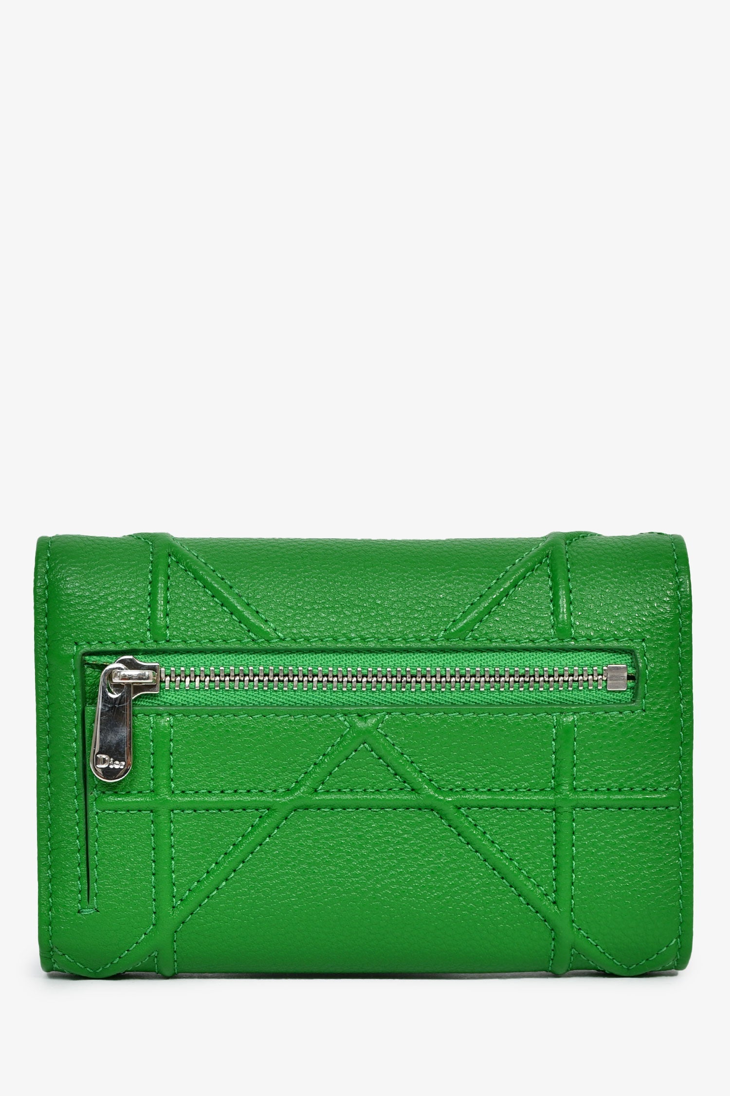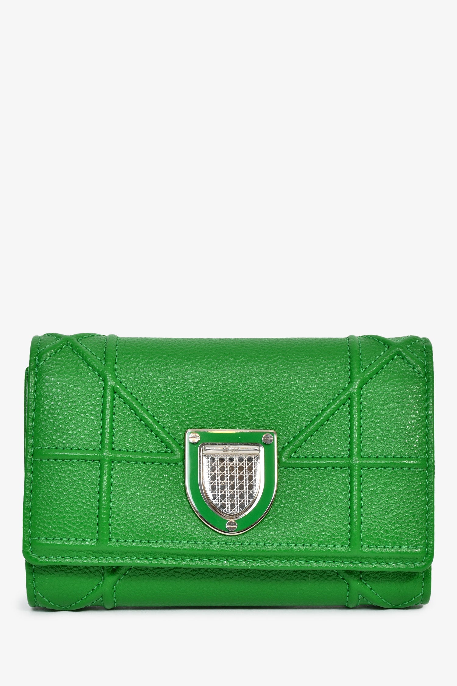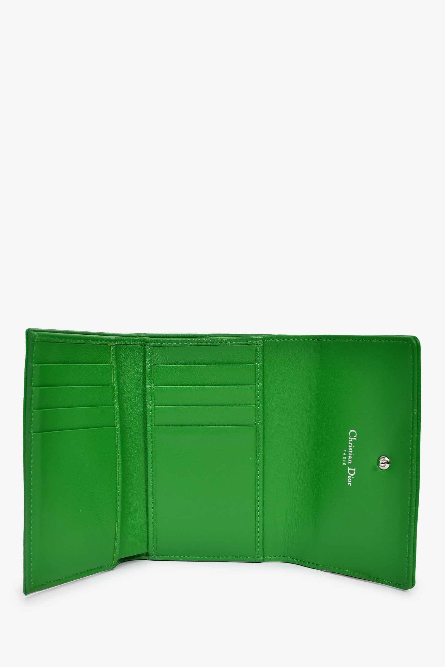 Christian Dior Green Leather Diorama Compact Wallet. Fold-over flap with a snap closure. 1 exterior zip compartment. 10 card and 1 bill compartment. Silver-tone hardware.