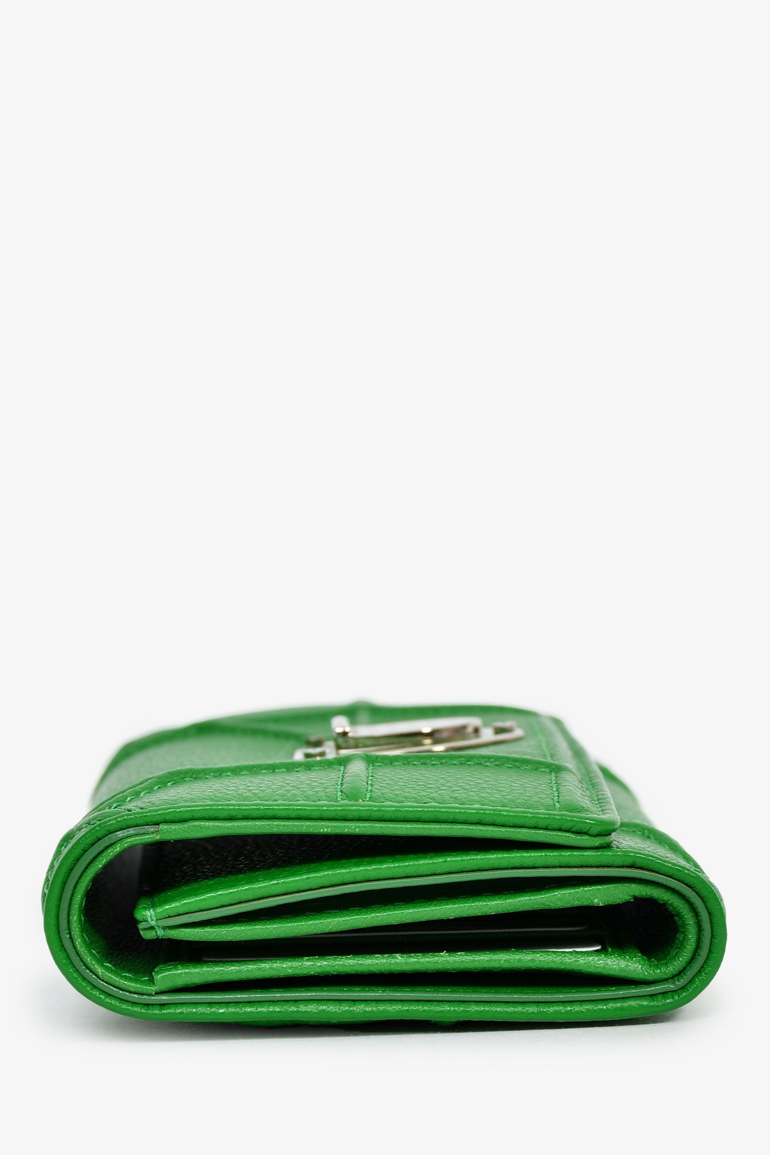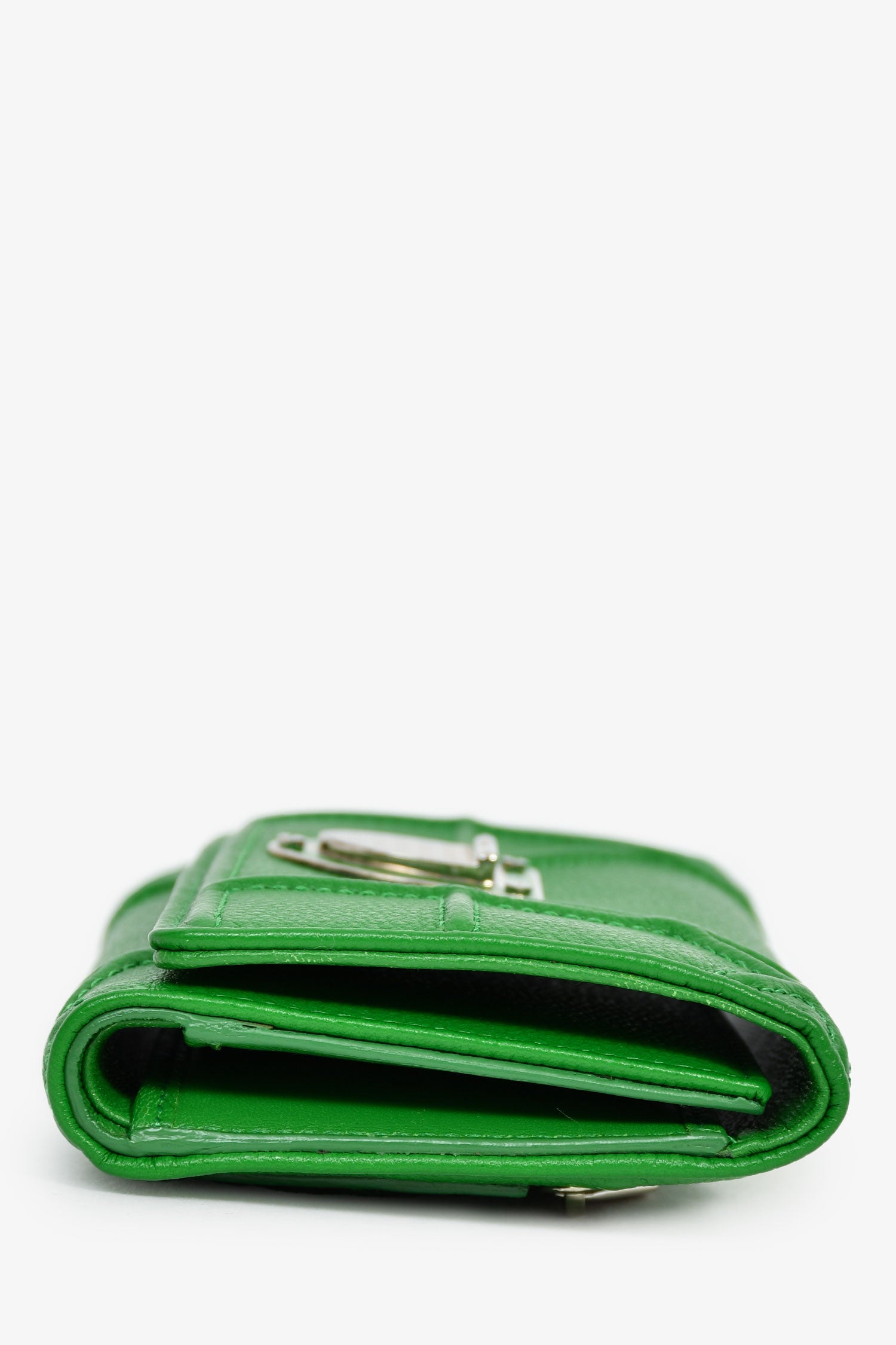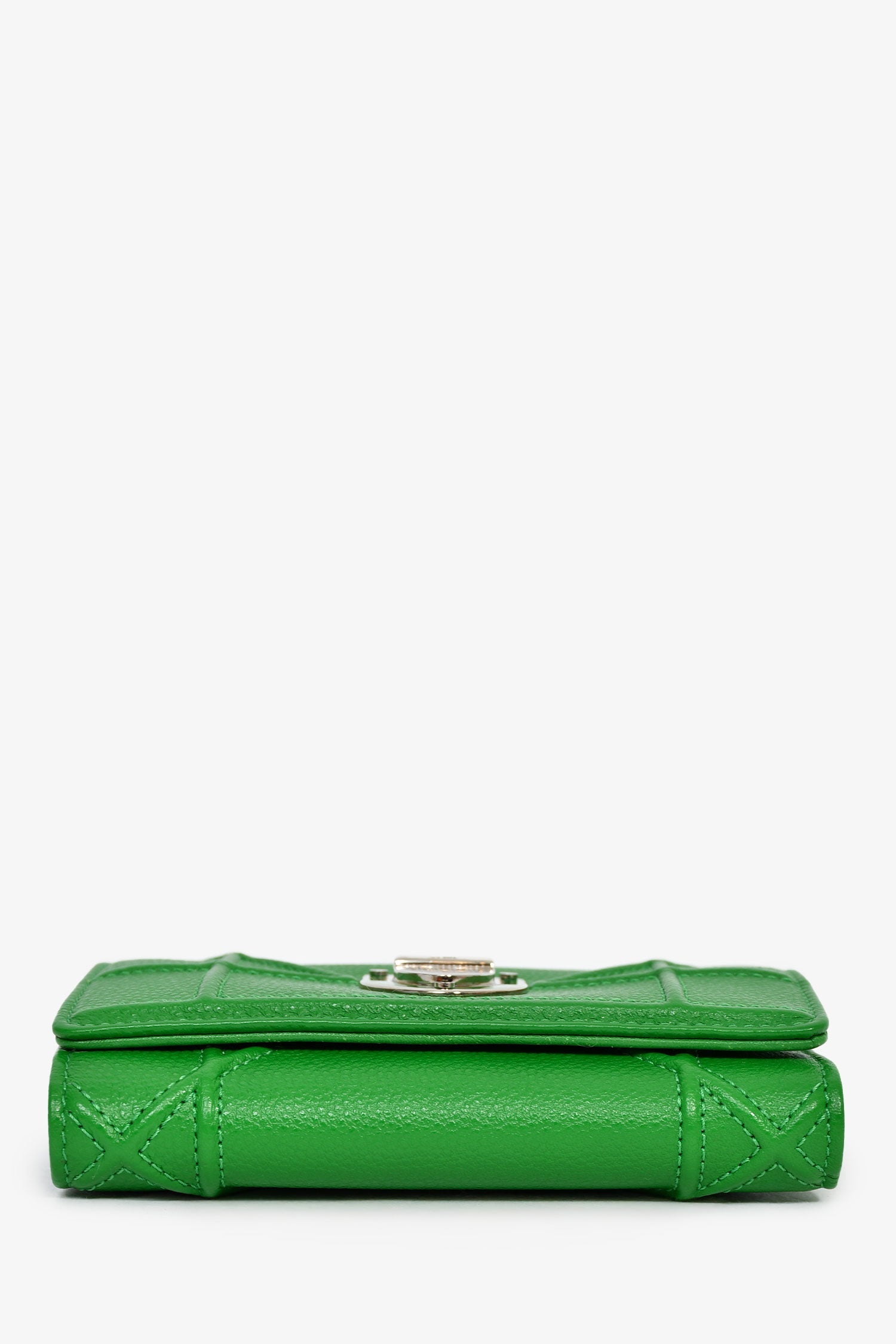 Christian Dior Green Leather Diorama Compact Wallet. Fold-over flap with a snap closure. 1 exterior zip compartment. 10 card and 1 bill compartment. Silver-tone hardware.