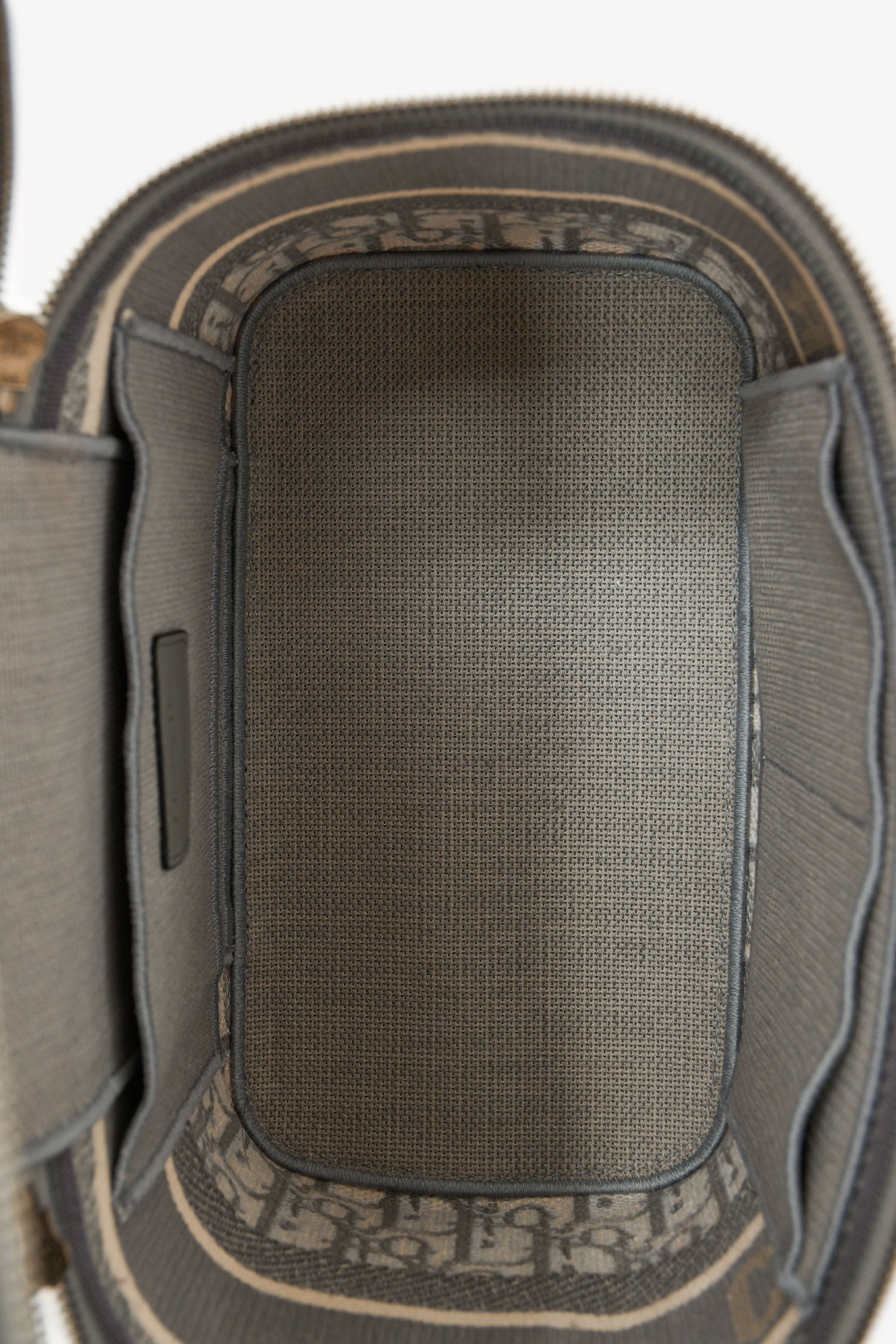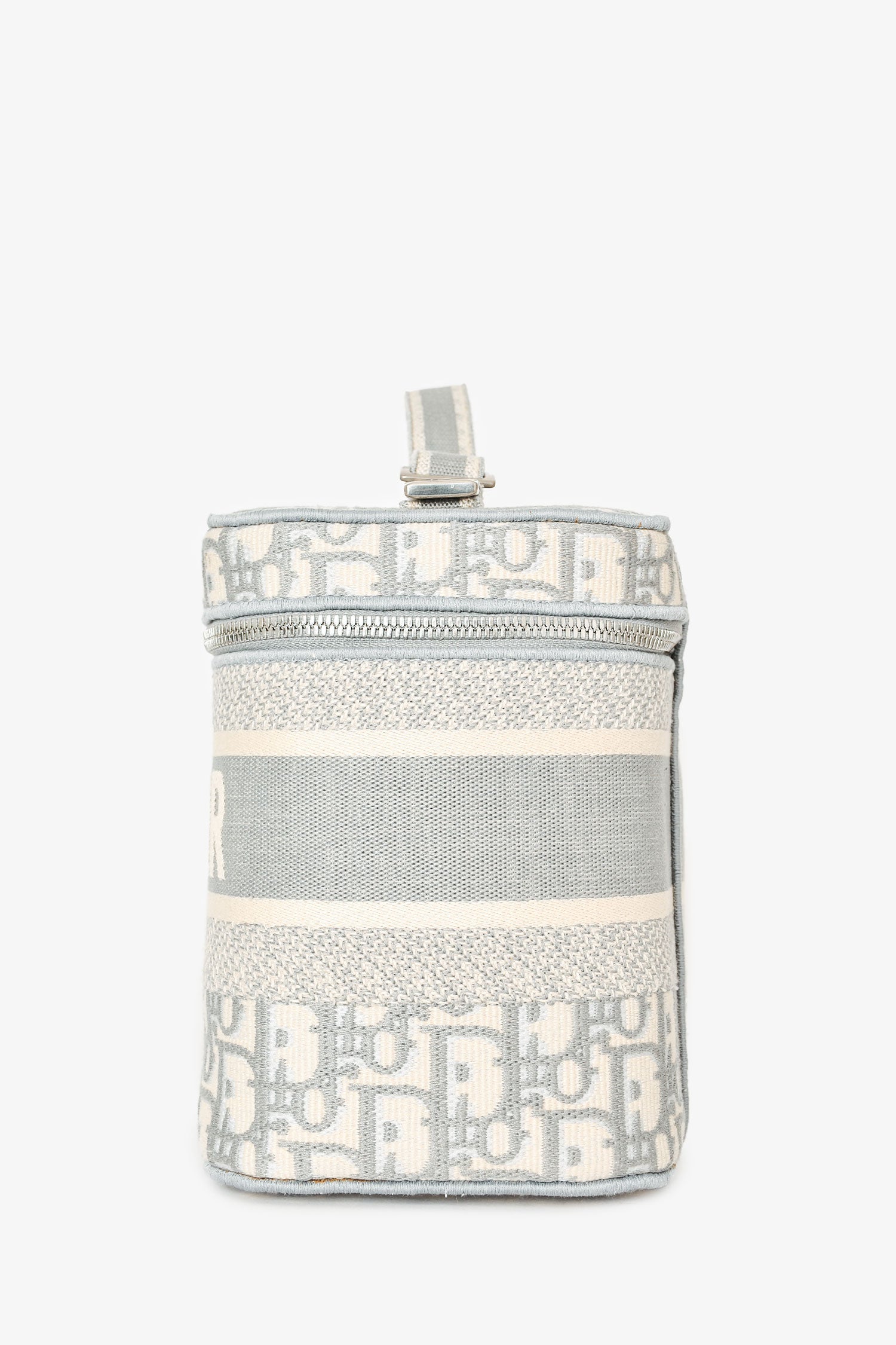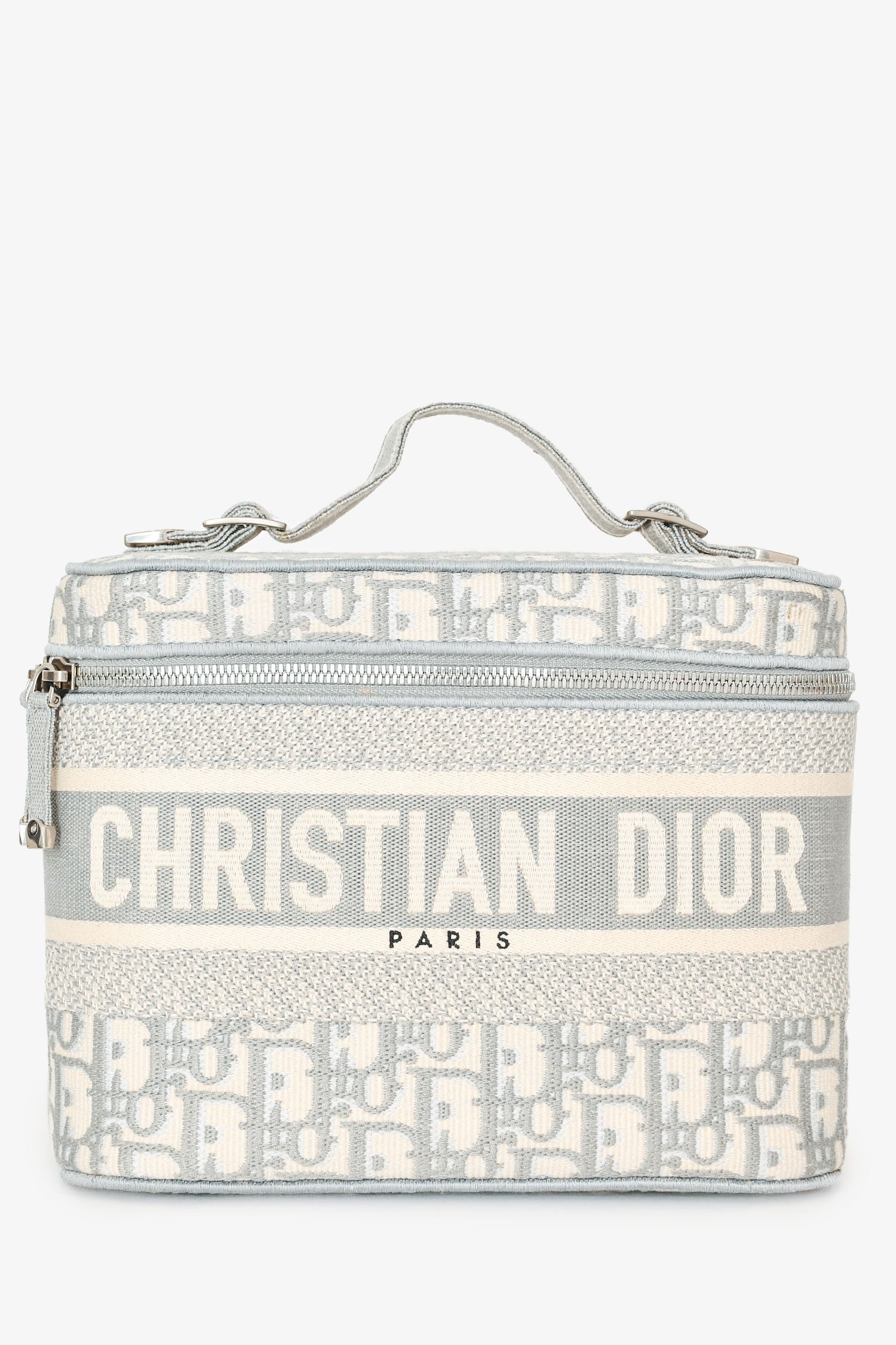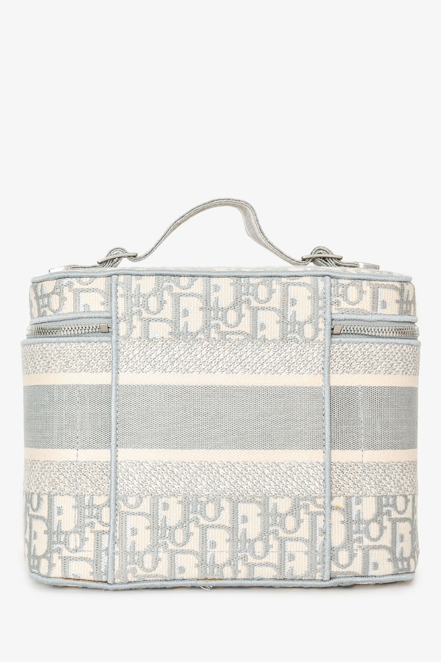 Christian Dior Grey Oblique Monogram Dior travel Vanity Case. Zip-around closure with silver-tone hardware. Top handle. Fabric-lined interior with one zipped pocket and three slip pockets. Tonal stitching.