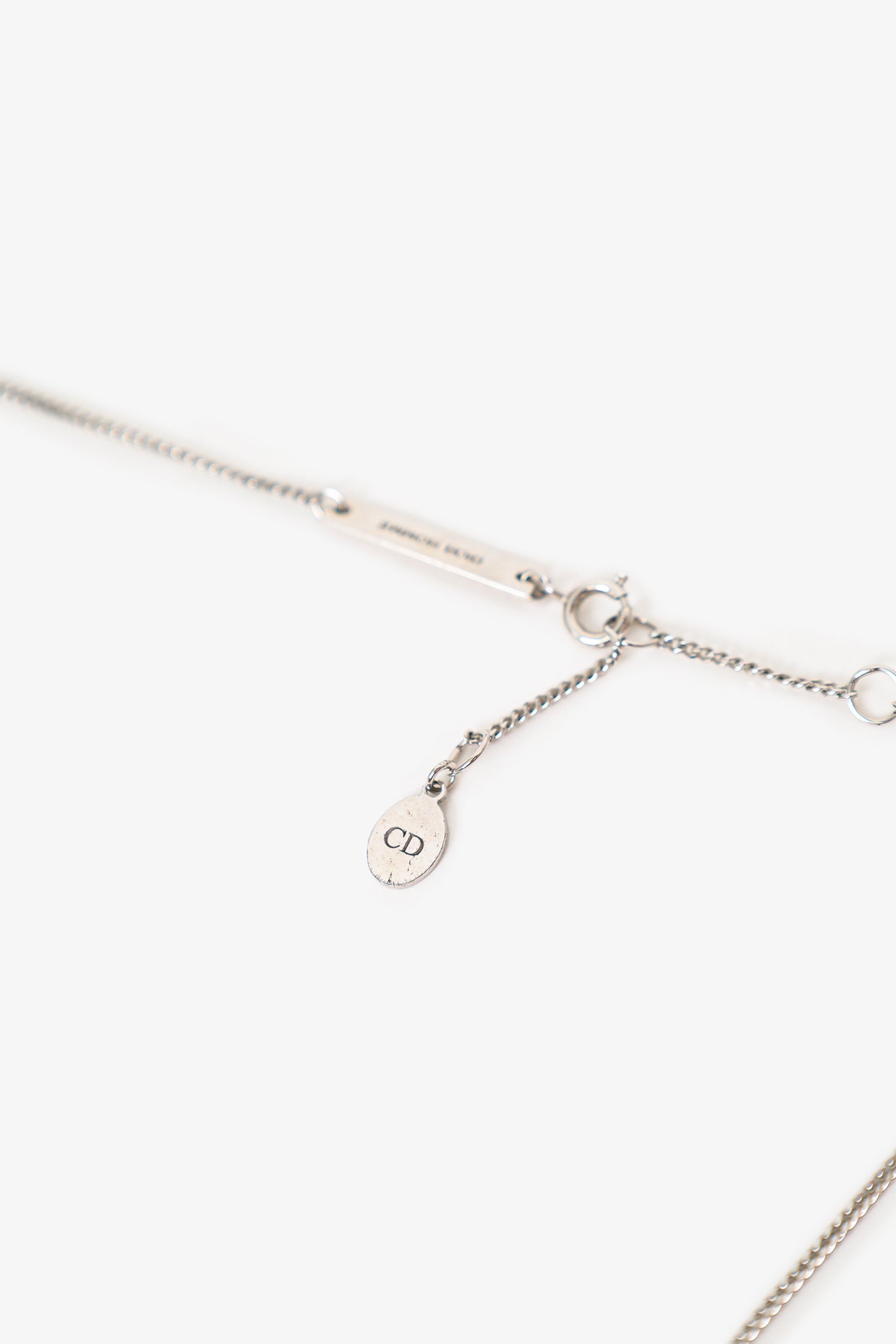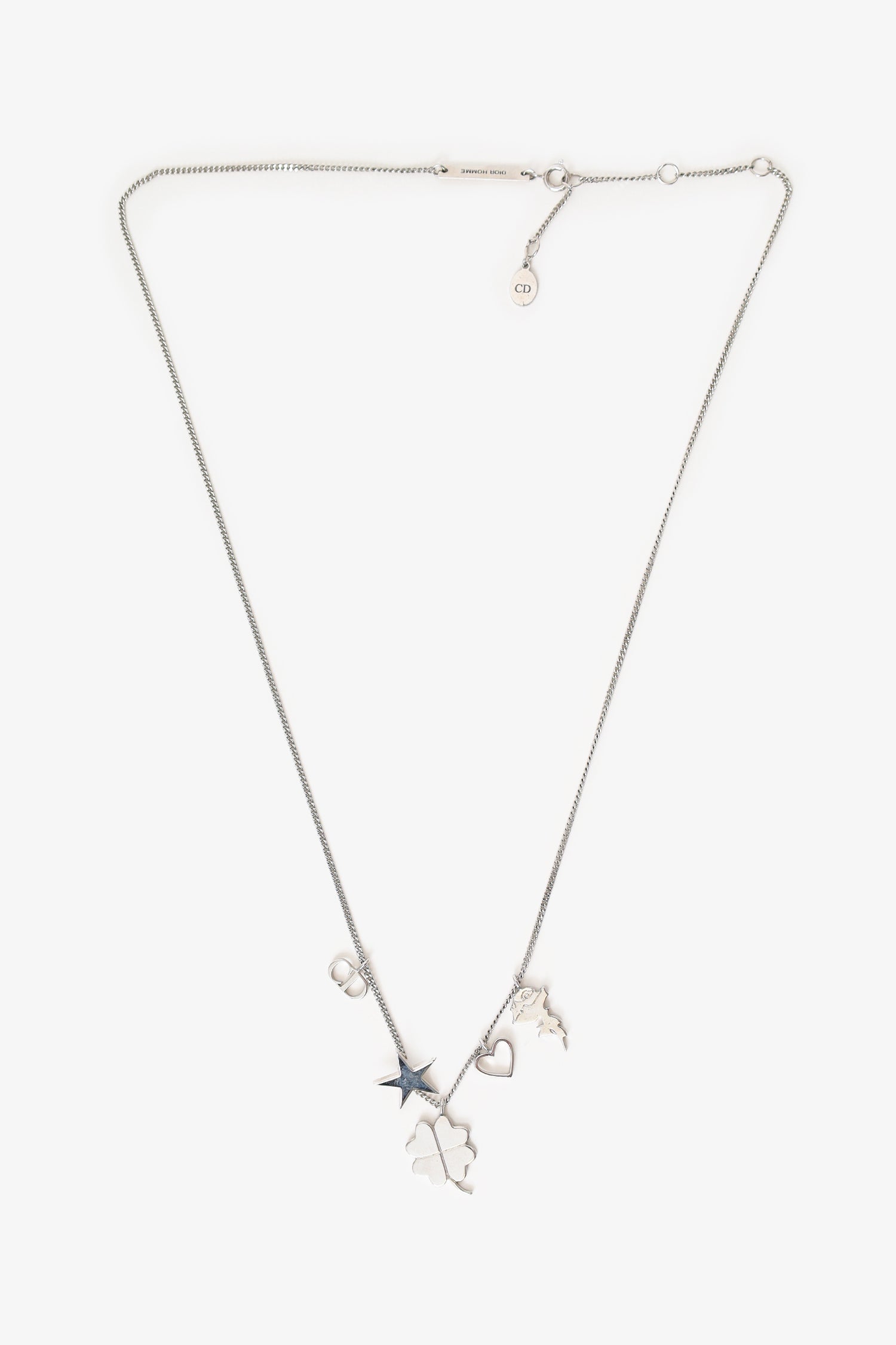 Christian Dior Silver Tone Four Leaf Clover/Star/Heart Charm Necklace. Rear clasp closure. Silver-tone hardware.