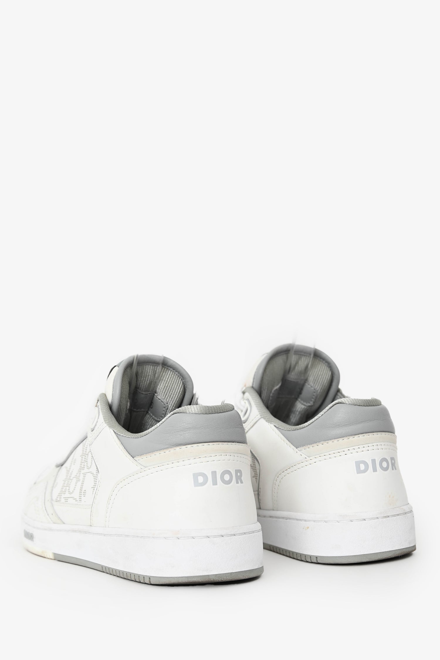 Christian Dior White Leather Oblique Low-Top Sneaker. Slip-on. Round toe. Lace-up closure. Rubber soles. Tonal stitching.