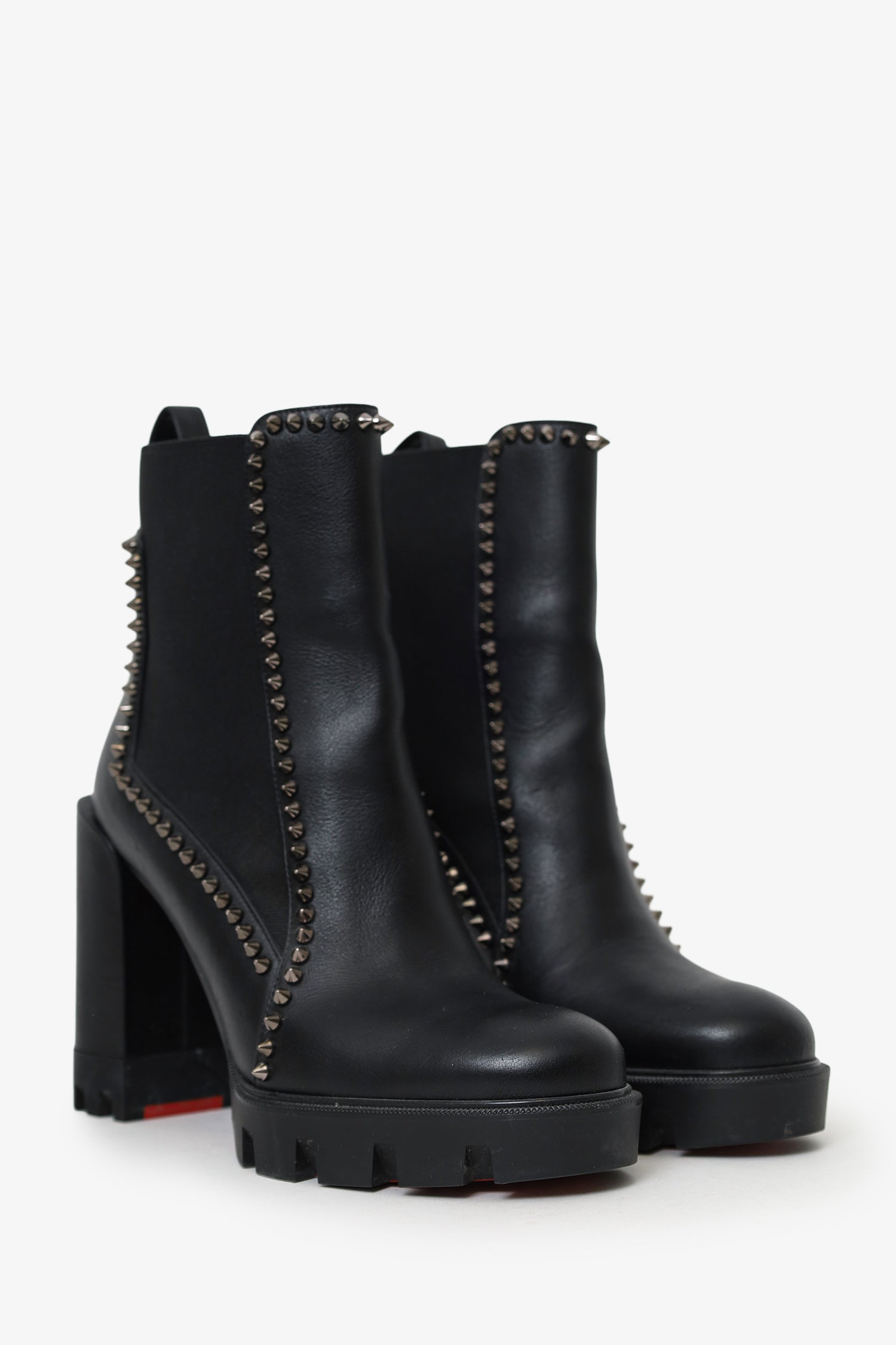 Christian Louboutin Black Leather Spike Lug Sole Heeled Boots. Pull-on. Round toe. Rear pull tab. Block heel. Leather-lined interior. Gunmetal-tone hardware. Tonal stitching.