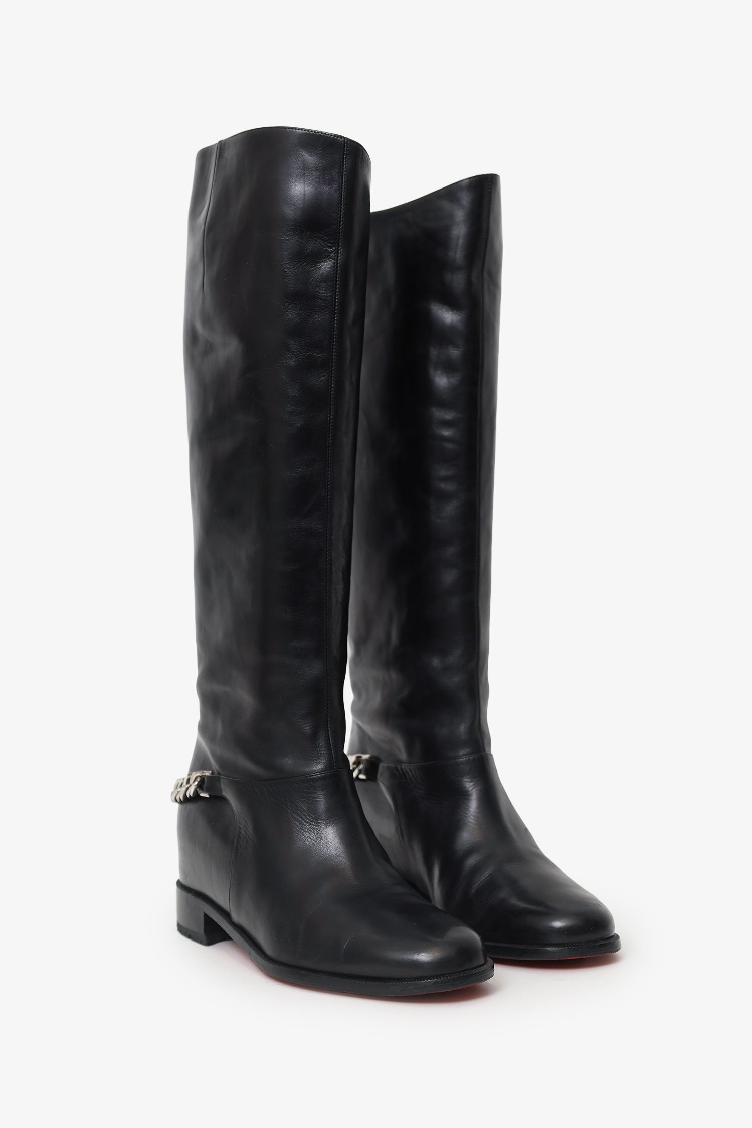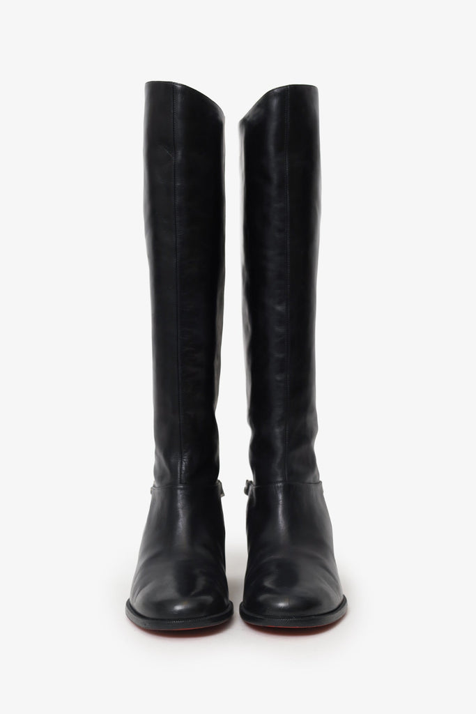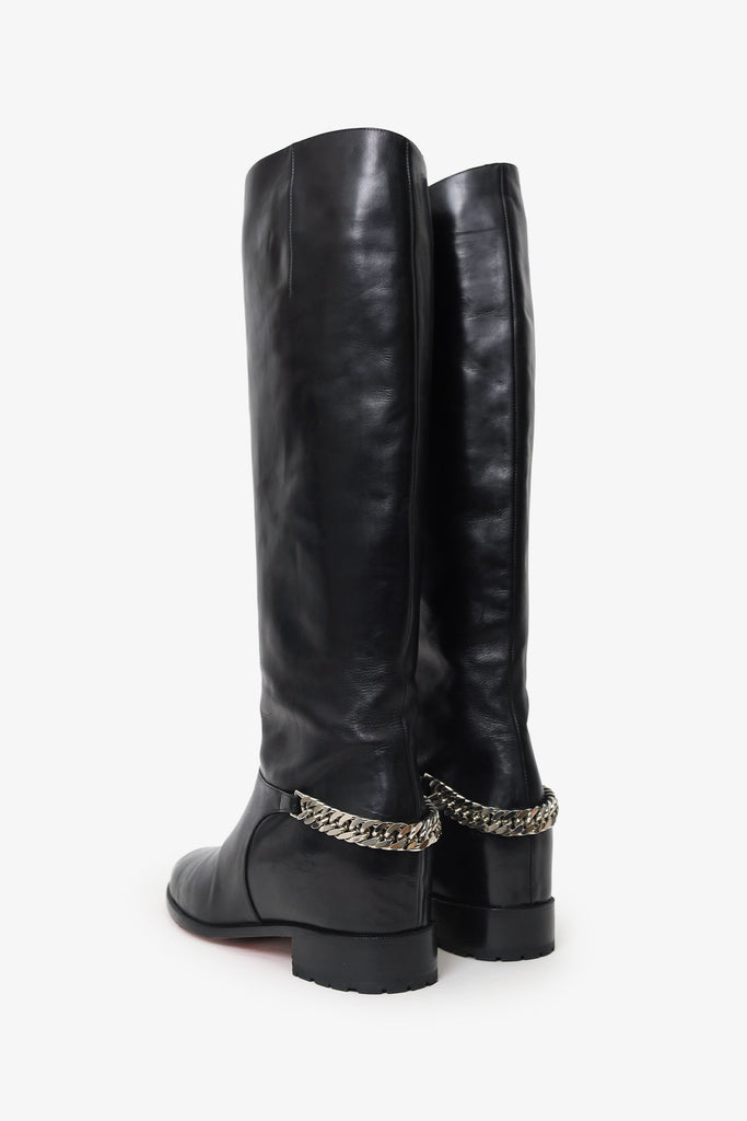 Christian Louboutin Black Leather Tall Boots. Pull-on. Round toe. Chain detail on rear of boot. Tonal stitching. Silver-tone hardware.