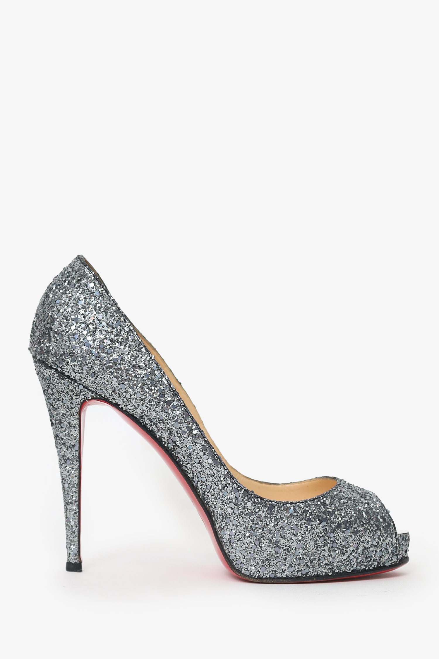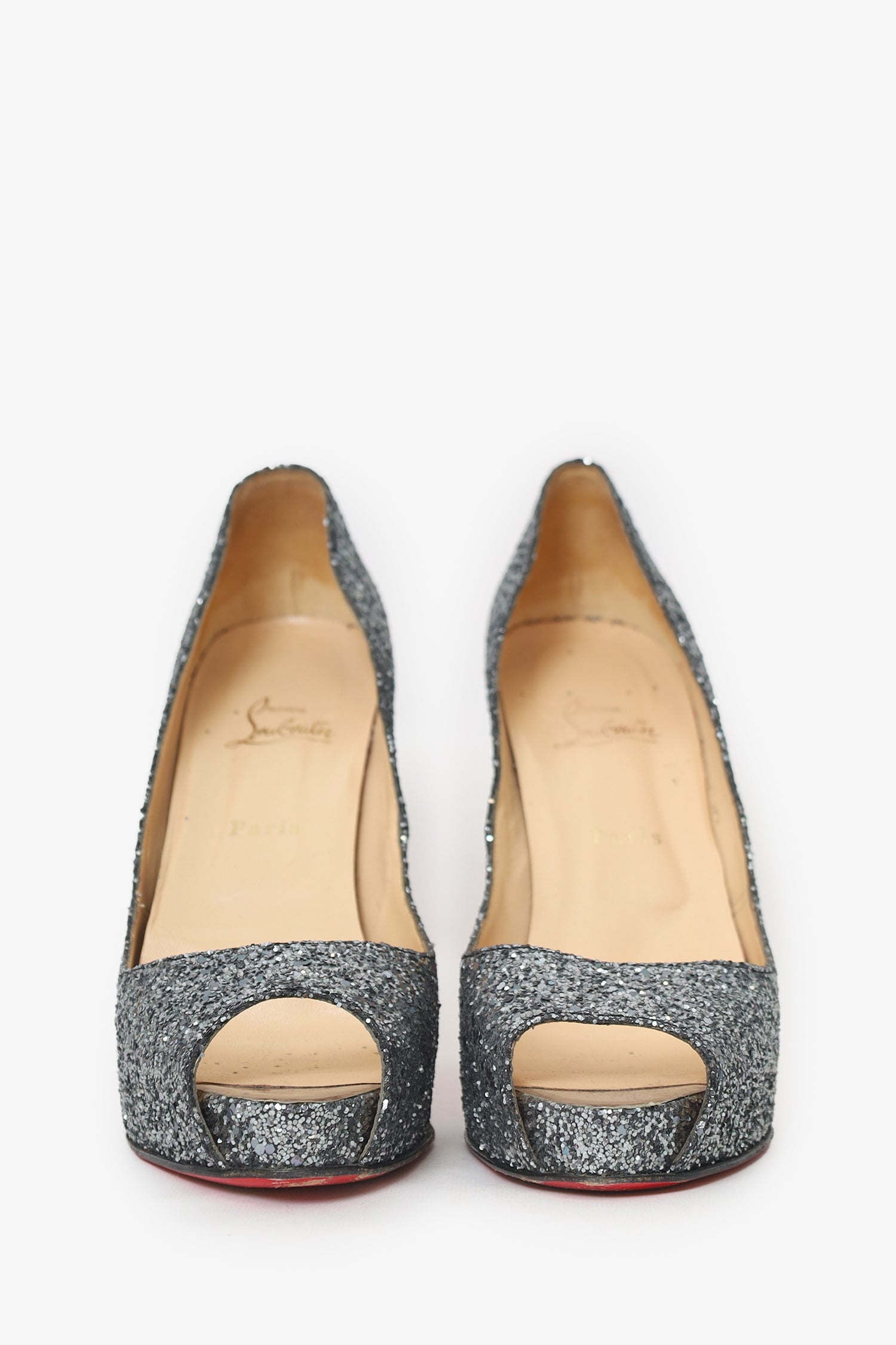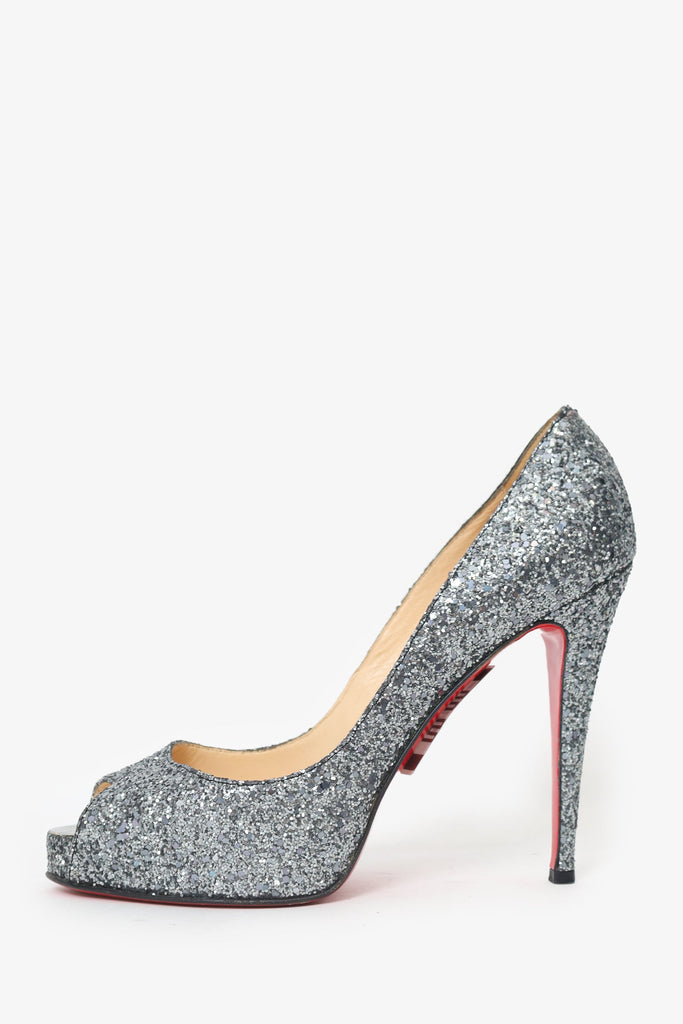 Christian Louboutin Grey Sparkle Peep Toe Heels. Slip-on. Round open-toe. Lined interior. Tonal stitching.