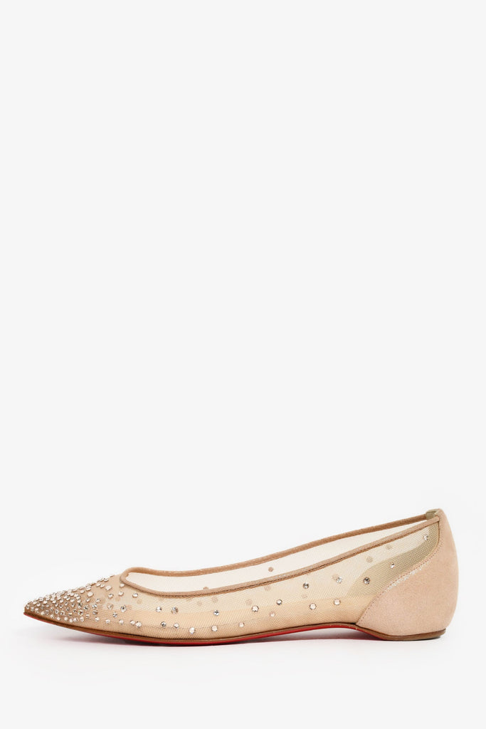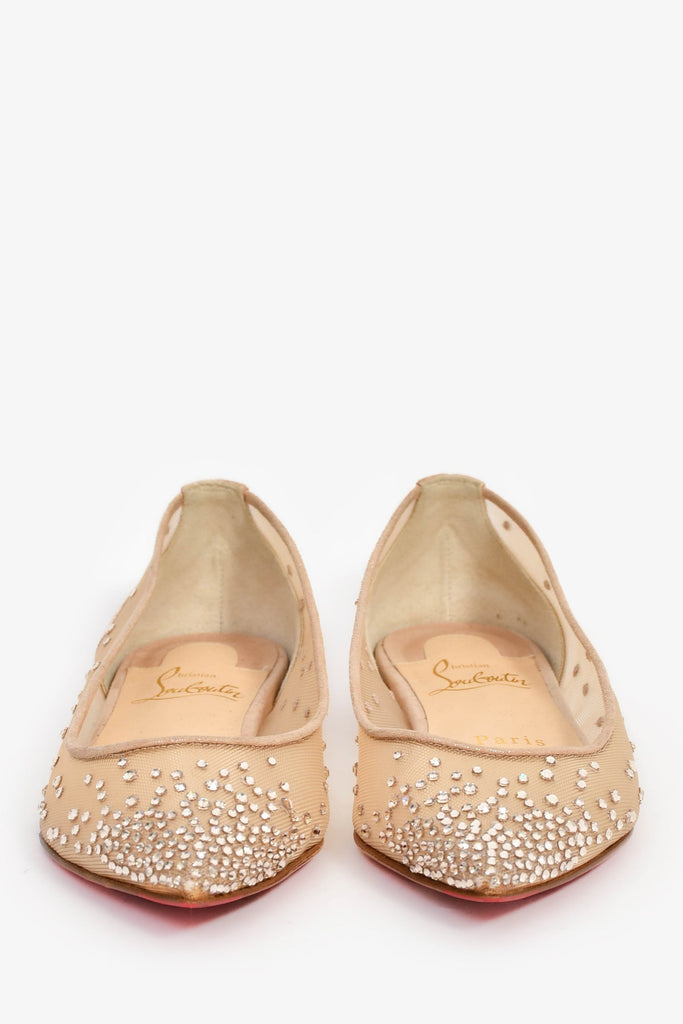 Christian Louboutin Nude Strass Pointed Flats. Slip-on. Pointed toe. Leather insole. Crystal embellishment. Tonal stitching.
