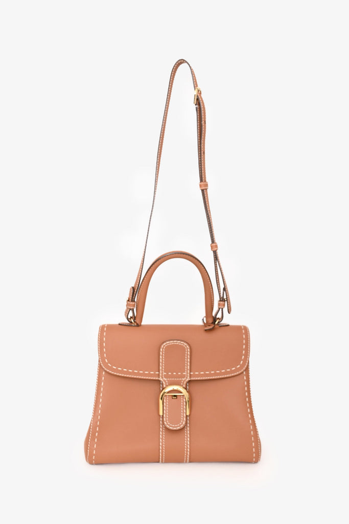 Delvaux Brown Leather Stitch Detail Le Brilliant MM Top Handle Bag with Strap. Front flap with buckle closure. Single top handle and detachable shoulder strap. 1 interior zip pocket; 1 interior slip pocket. 4 protective base studs. Gold-tone hardware. Contrast stitching.