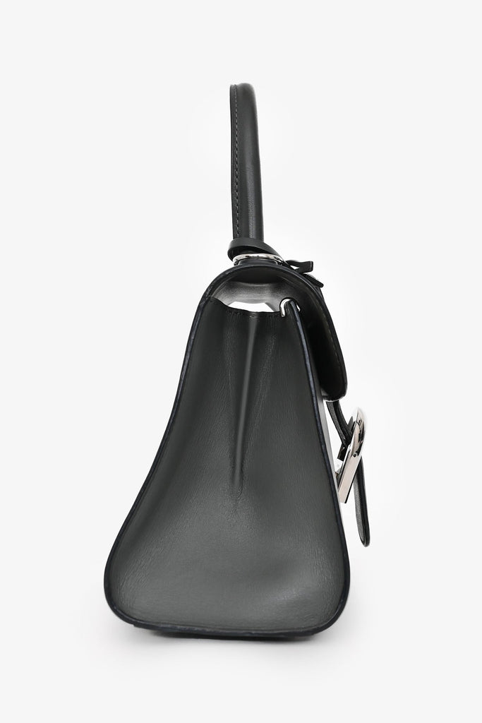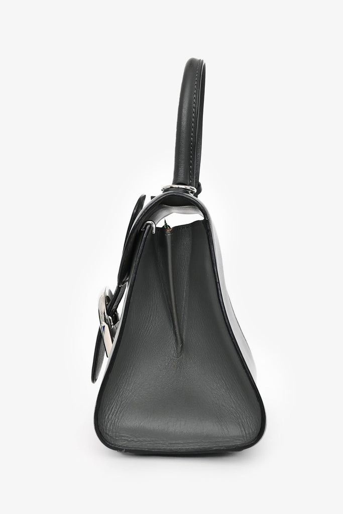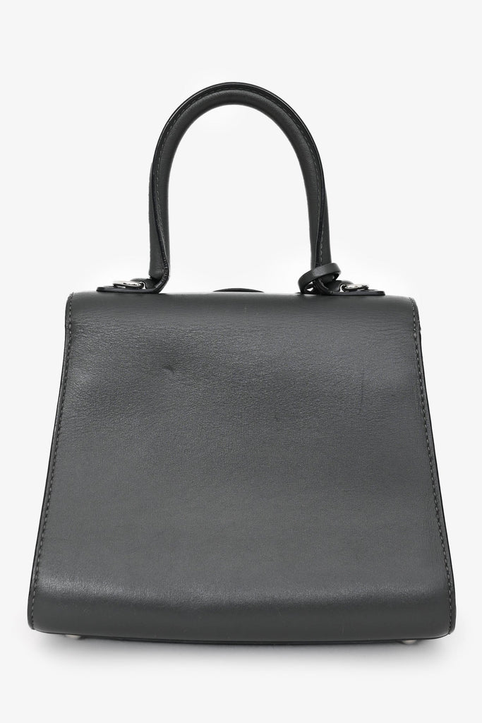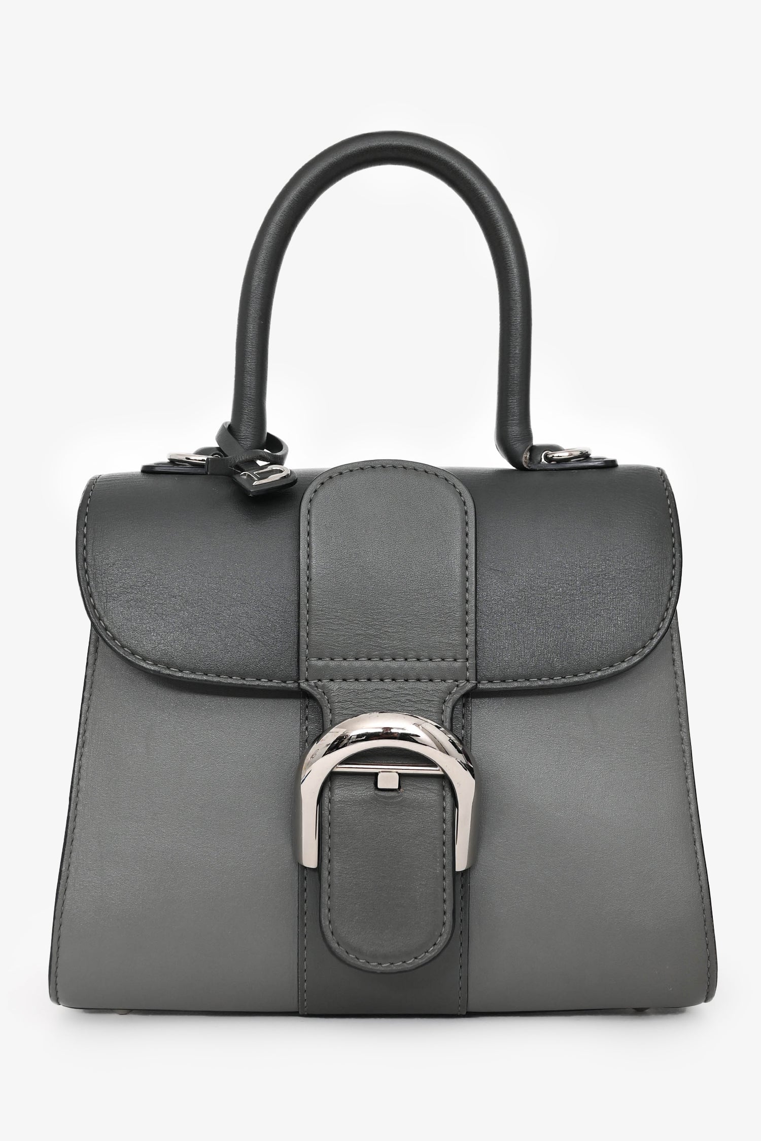 Delvaux Grey Brillant Mini S Box Calf with Strap. Top handle. Front fold-over flap with strap and buckle closure. Brown leather interior. Single interior wall slip pocket. Detachable and adjustable strap. Protective metal bottom. Silver-tone hardware.