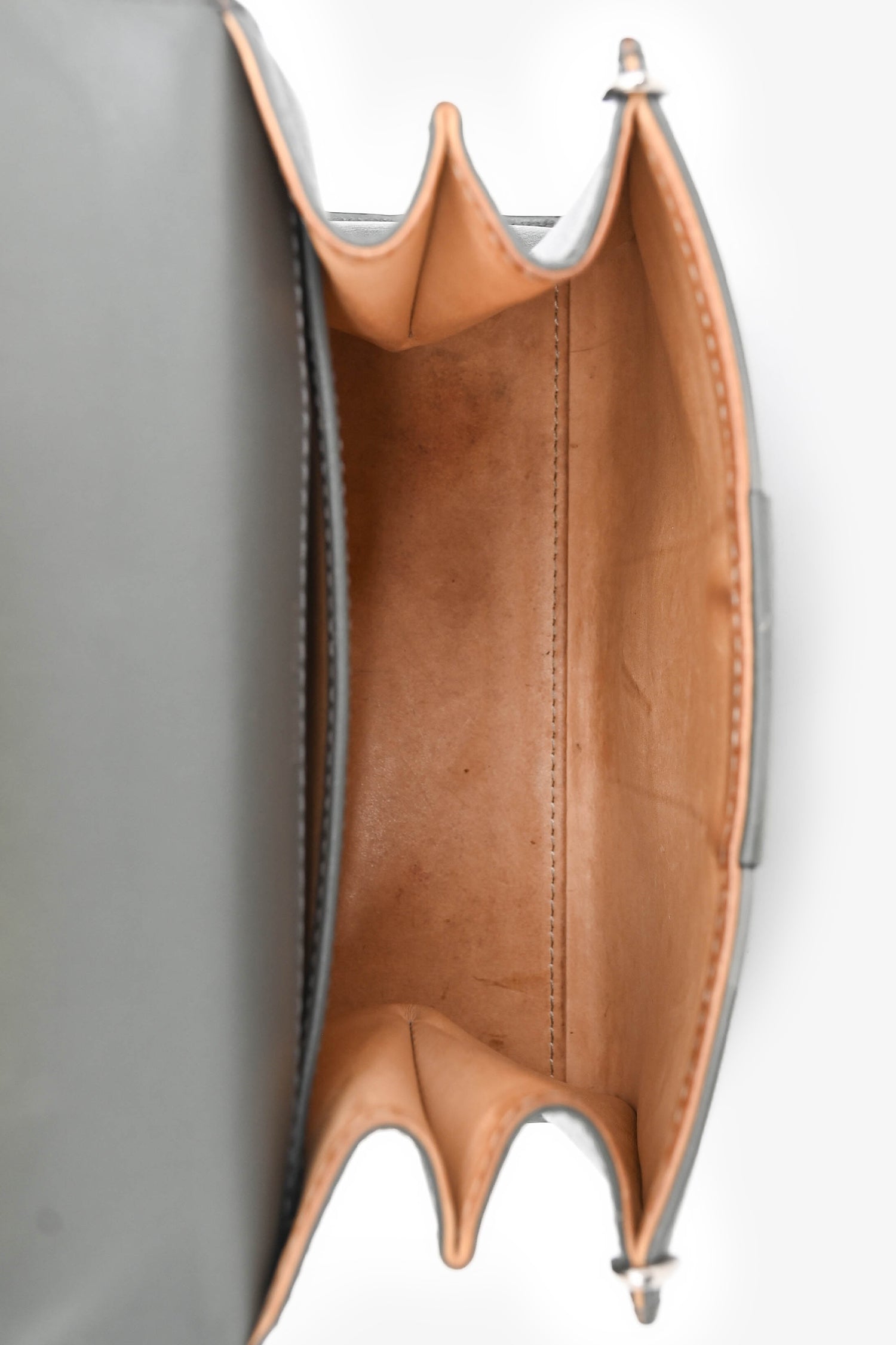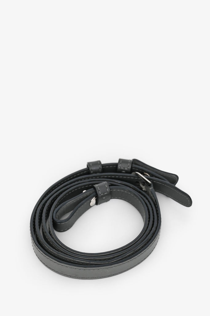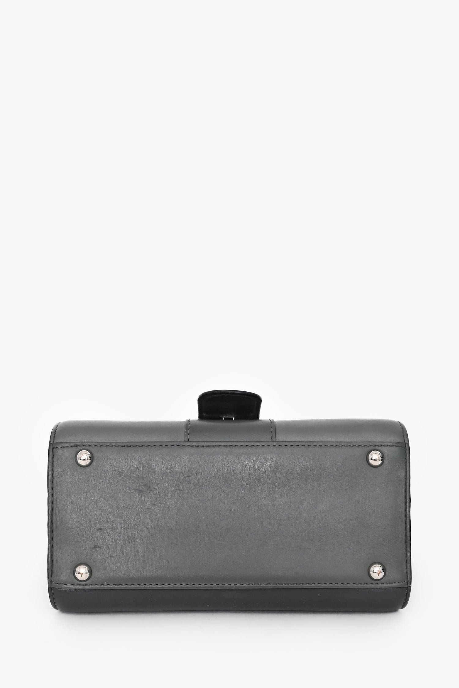 Delvaux Grey Brillant Mini S Box Calf with Strap. Top handle. Front fold-over flap with strap and buckle closure. Brown leather interior. Single interior wall slip pocket. Detachable and adjustable strap. Protective metal bottom. Silver-tone hardware.