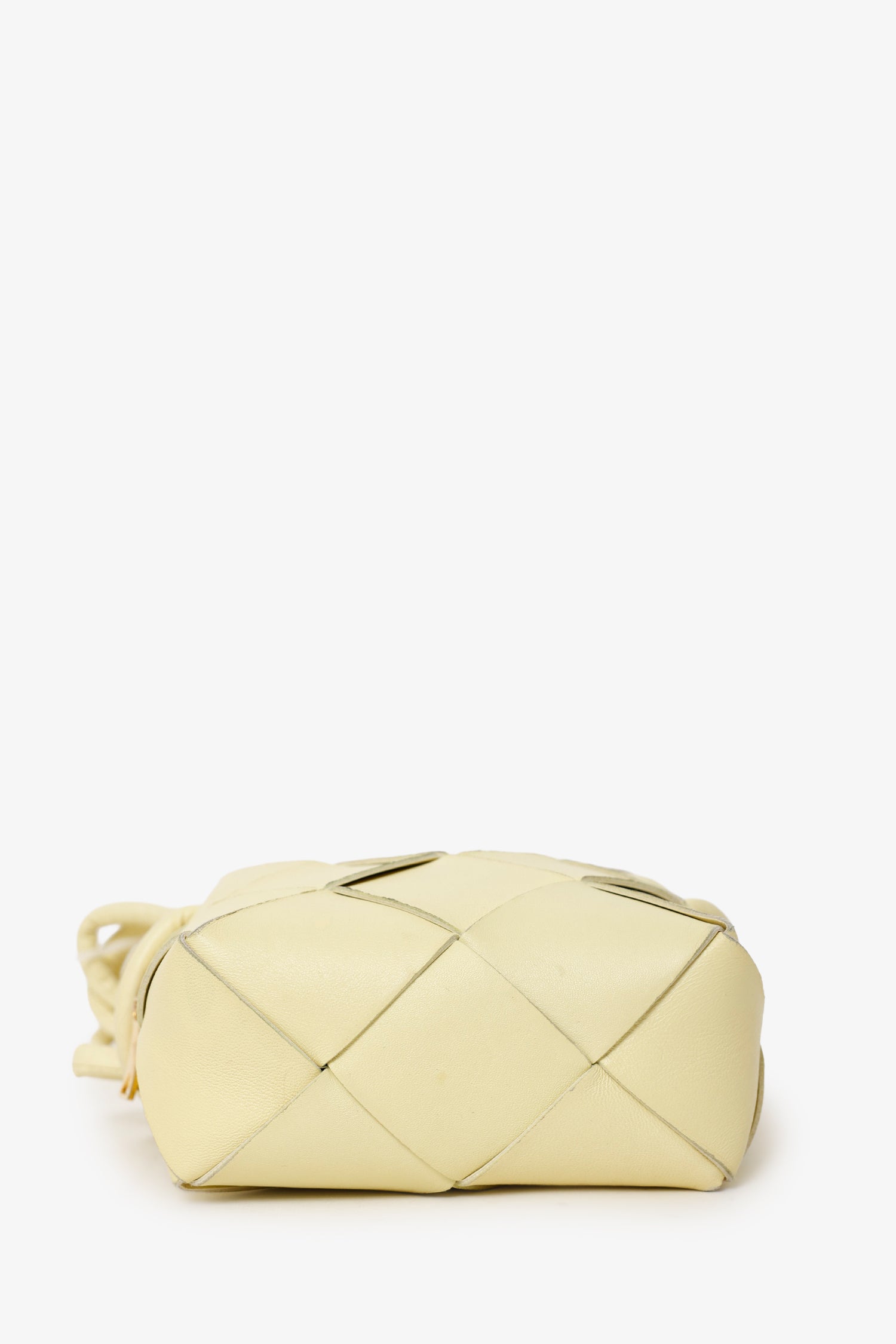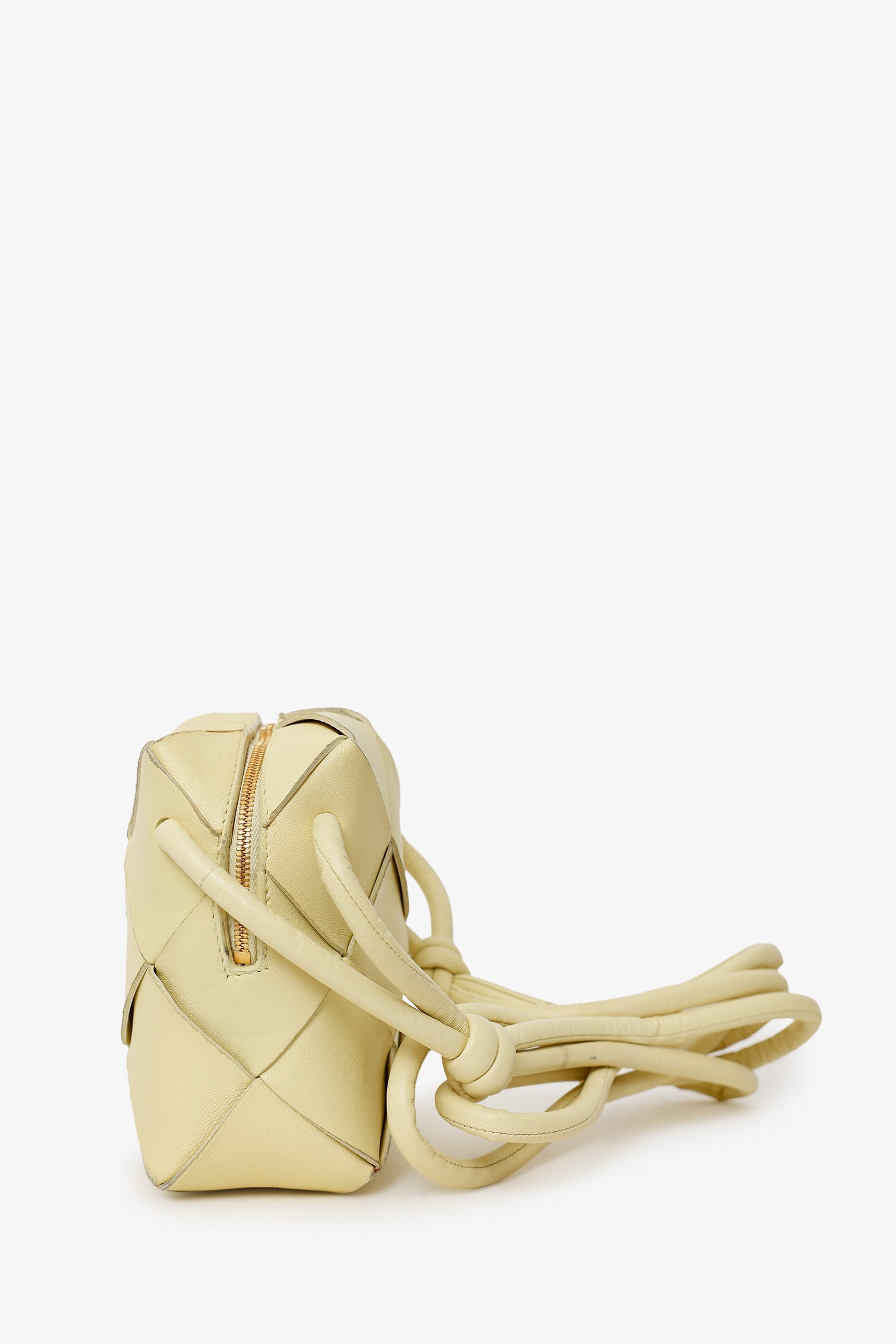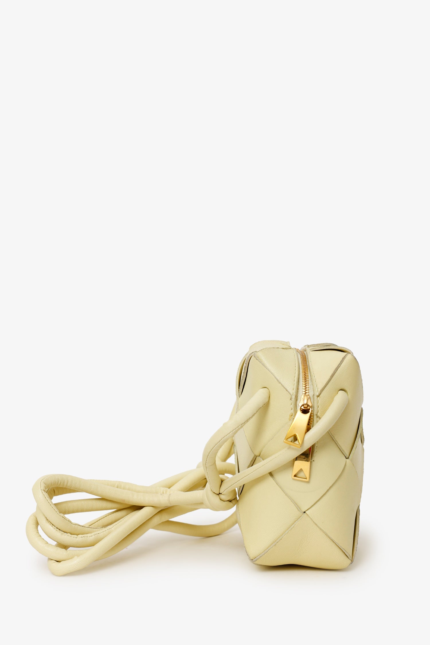 Bottega Veneta Pale Yellow Cassette Camera Crossbody. 2-way top zip-up closure. Leather crossbody strap. Gold-tone hardware.