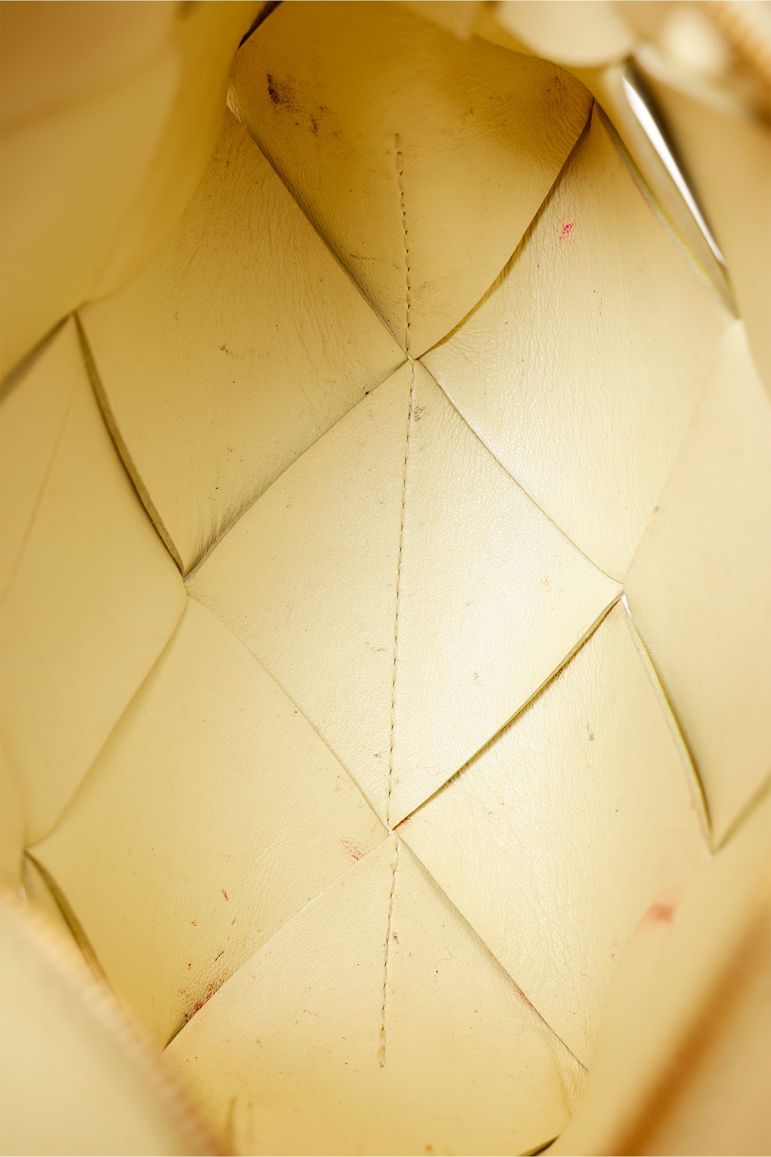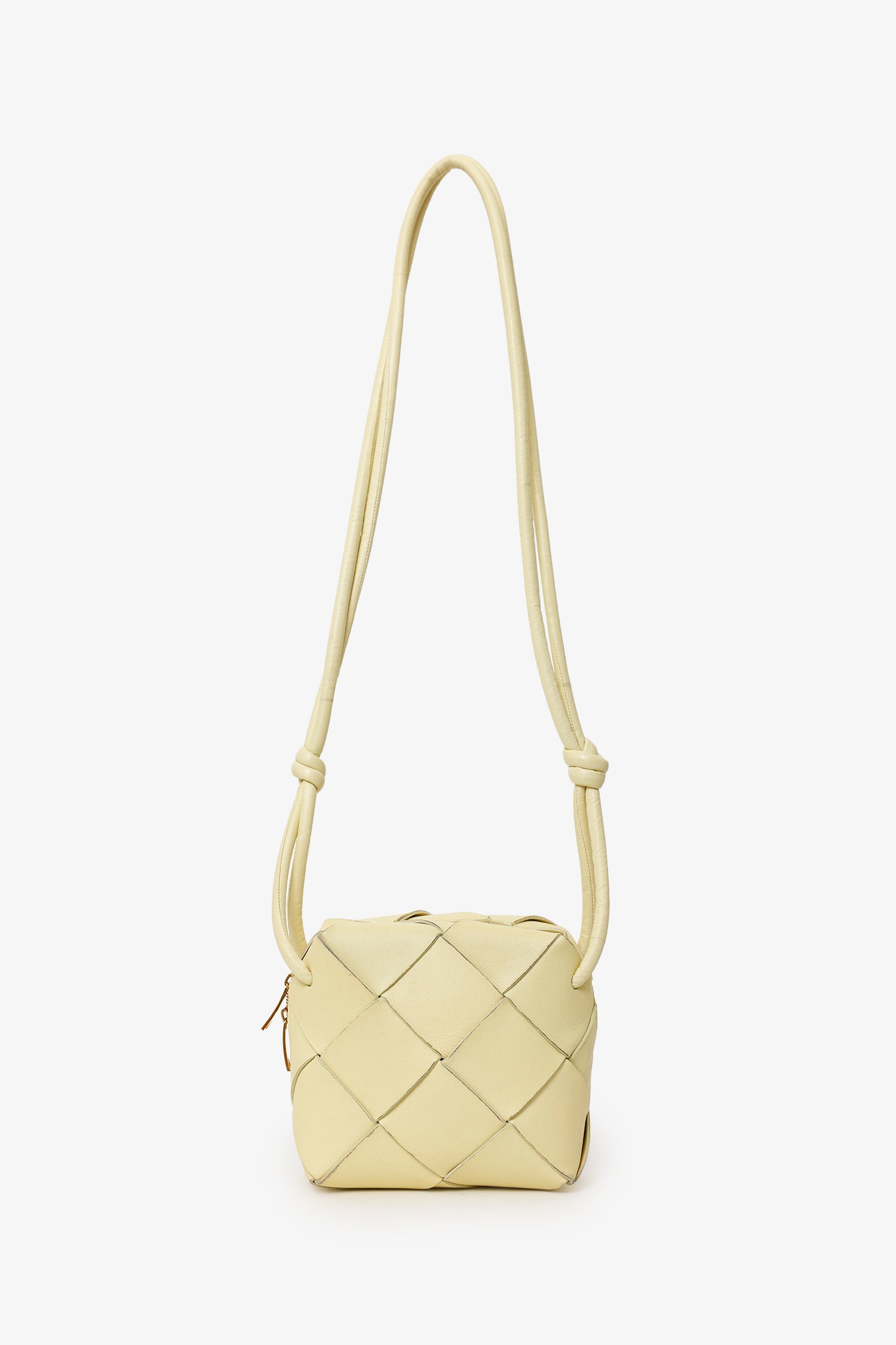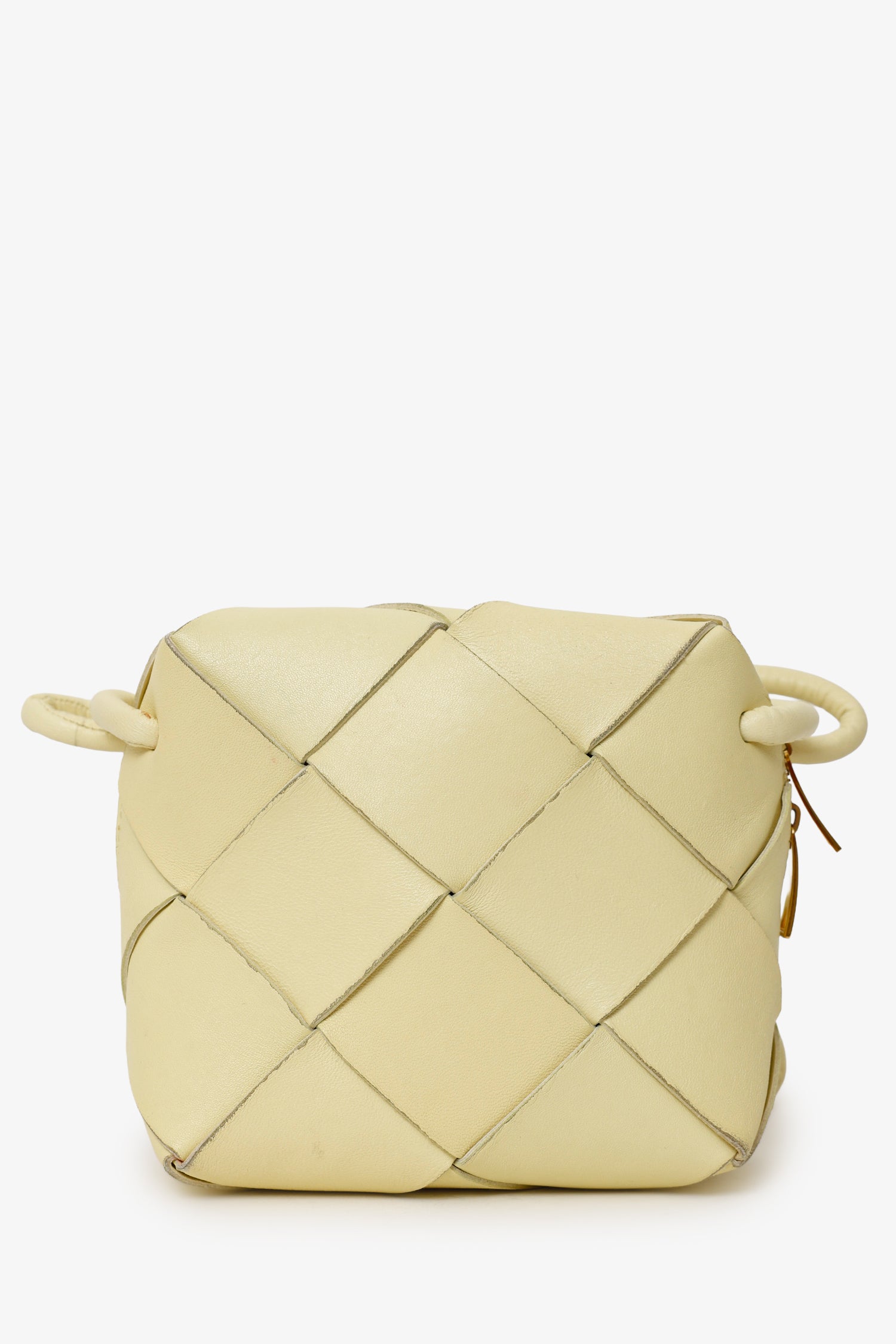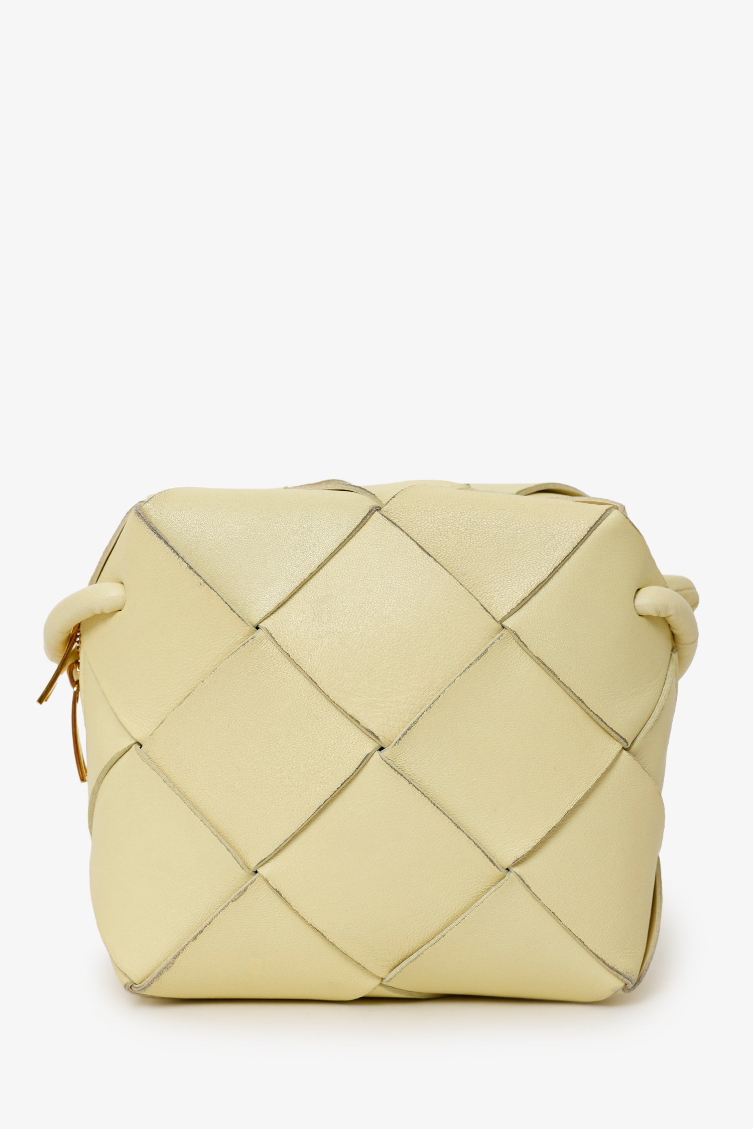 Bottega Veneta Pale Yellow Cassette Camera Crossbody. 2-way top zip-up closure. Leather crossbody strap. Gold-tone hardware.