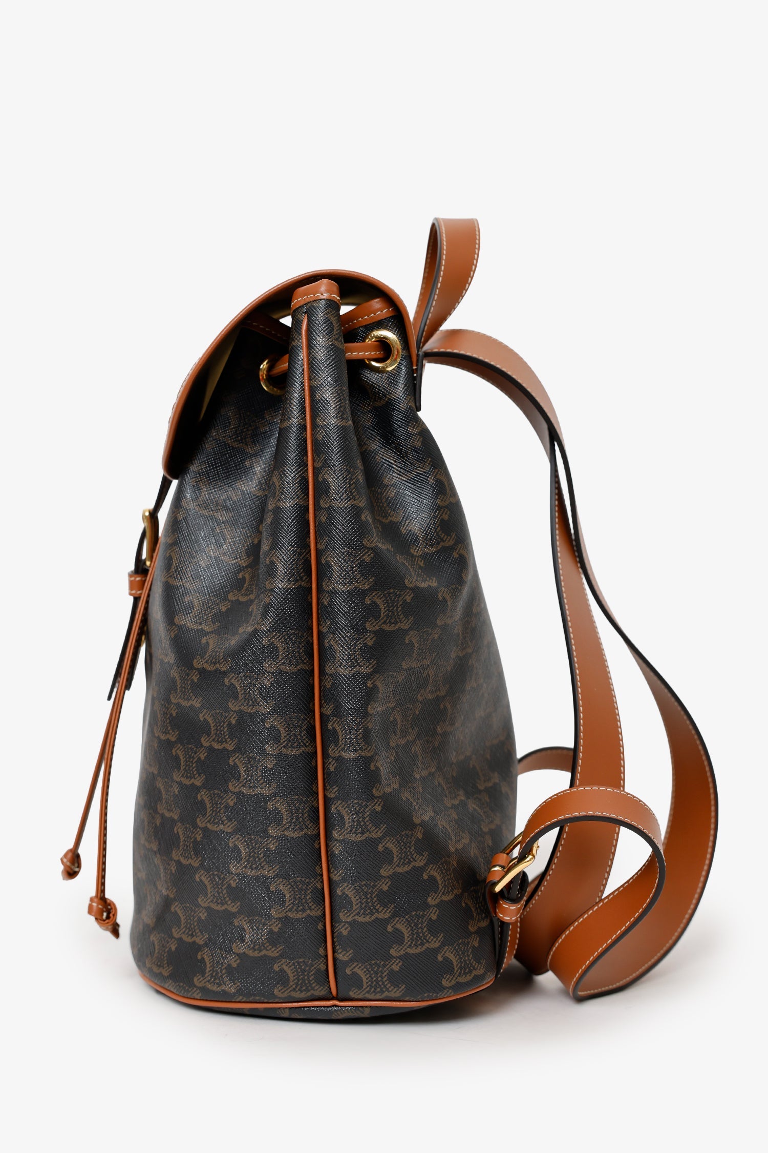Celine Brown Triomphe Canvas/Calfskin Medium Backpack. Front fold-over flap with magnetic button-up and cinch cord closure. Adjustable push pin buckle closure to front fold-over flap. Top handle. Rear back straps with adjustable pull-through buckle closure. Textile lined interior. Single interior slip pocket. Gold-tone hardware. Contrast and tonal stitching.